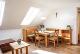 Die Wohnung verfügt über ein Schlafzimmer mit Zirbenbetten ein Badezimmer und die Wohnküche ist mit Geschirrspüler, Mikrowelle, E-Herd mit  Backrohr, Kaffeemaschine, Wasserkocher und genügend Geschirr ausgestattet. Auch eine ausziehbare Ledercouch, Sat TV und CD Radio sind vorhanden. Zur Wohnung gehört ein eigener Balkon.