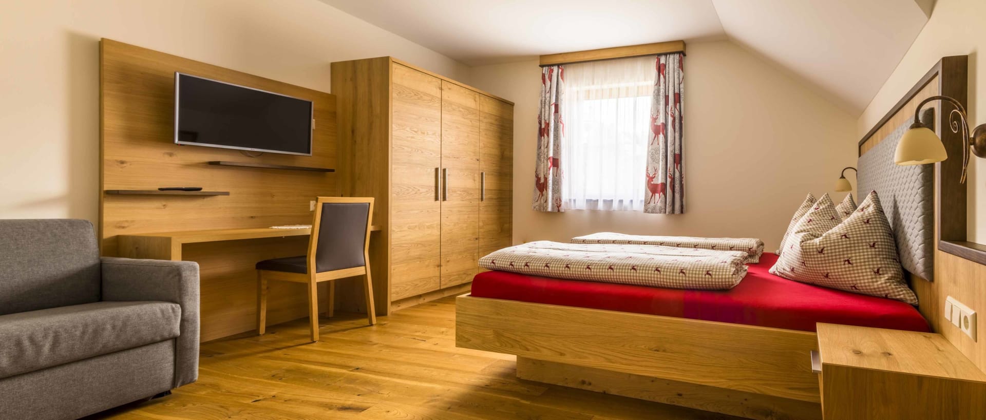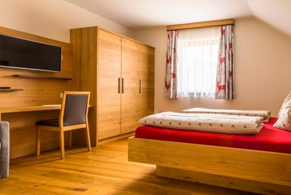 Das Zusatzzimmer Lebenslust liegt im 1. Stock. Das Zimmer ist ausgestattet mit einem Doppelbett ohne Fußteil und eine Ausziehcouch für 1 Person. Dieses Zimmer verfügt über ein geräumiges Bad mit WC. Es gibt einen Flachbild-TV mit Kabelkanälen und kostenfreies WLAN. Das Zimmer kann zu beiden Wohnungen optional dazugebucht werden. Nur dieses Zimmer zu buchen ist nicht möglich!