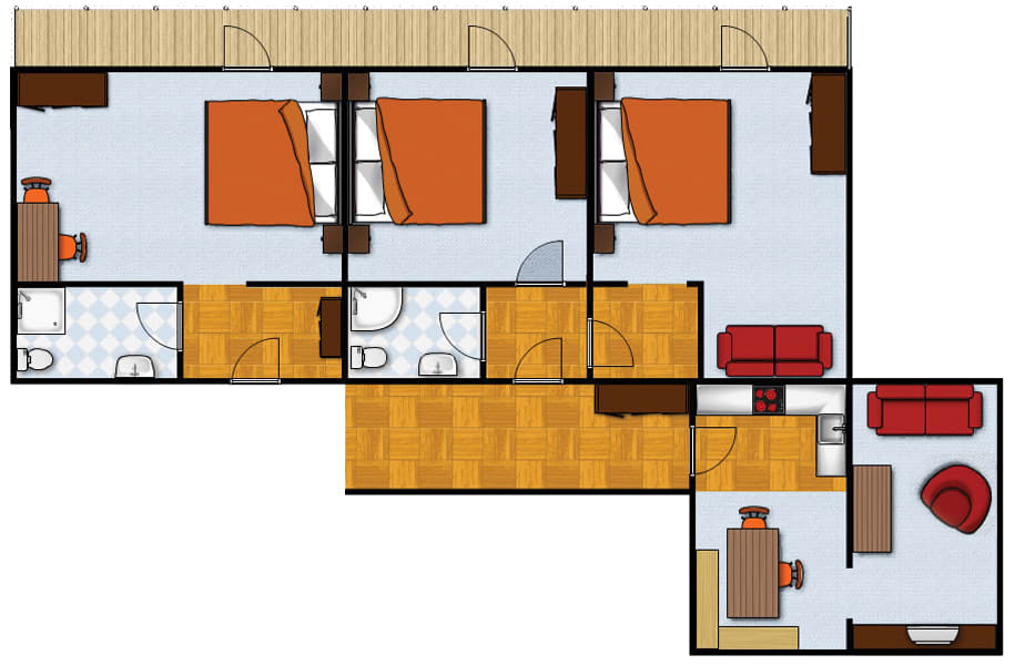 Das Appartement II bietet Platz für 2 bis 8 Personen und ist ausgestattet mit SAT-TV, Vorraum, Küche mit Geschirrspüler, Esszimmer. 3 getrennte Schlafzimmer, 2 Bäder mit WC und Balkon.