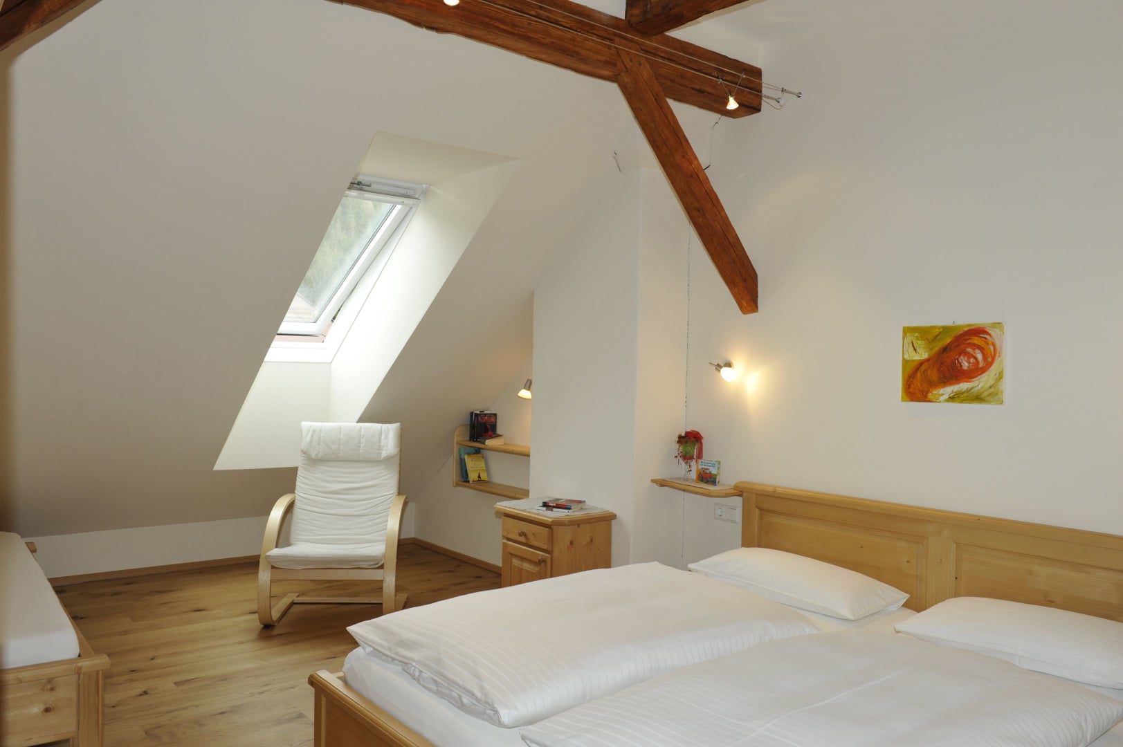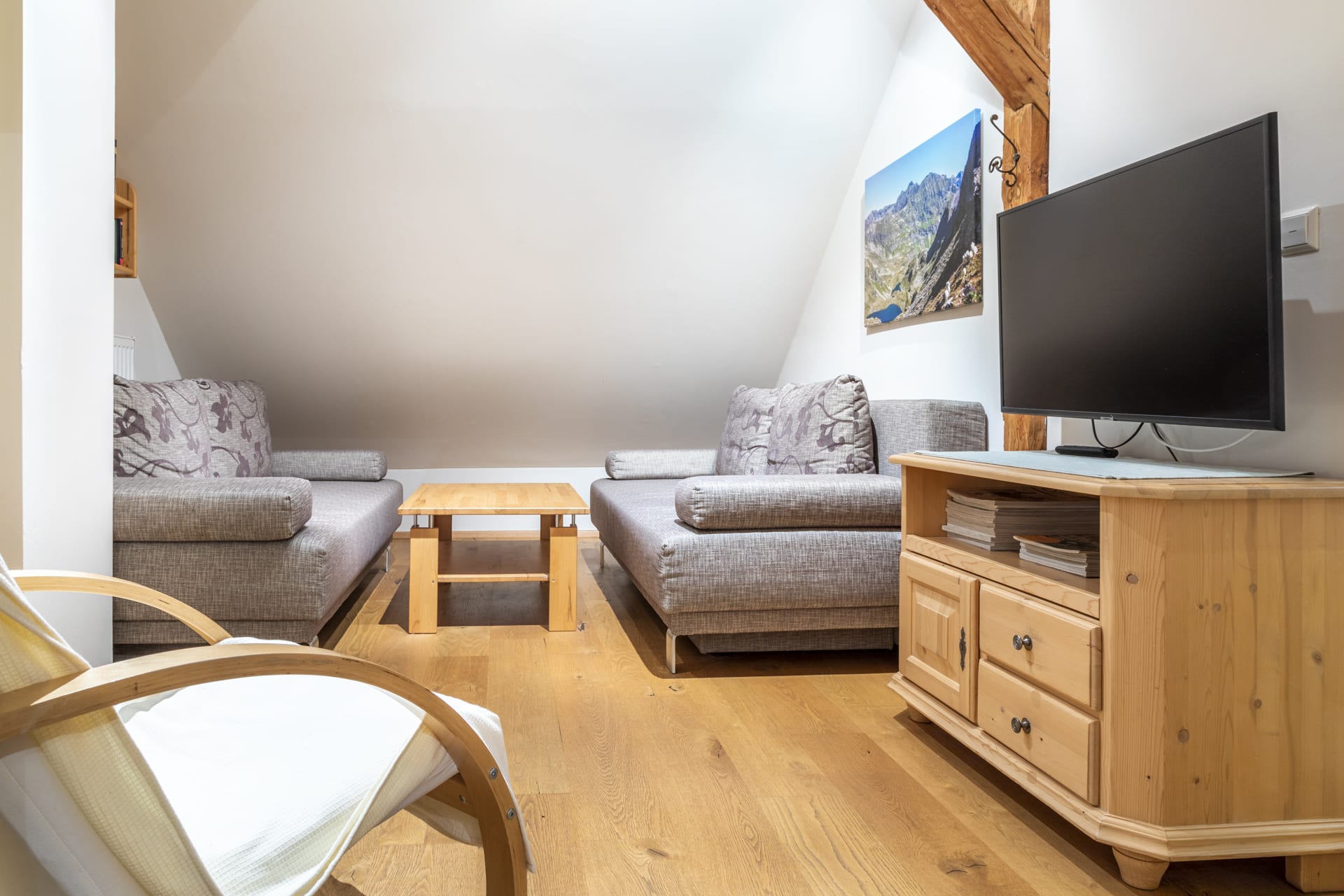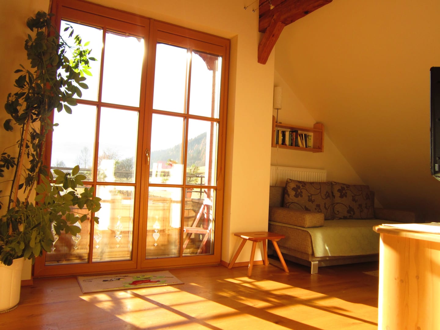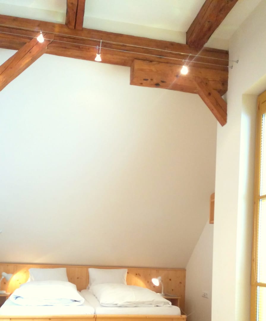 Wunderschöne, sehr geräumige, sonnige Wohnung mit ca. 120 m2. Küche mit kompletter Ausstattung (Kühlschrank mit Gefrierfach, 4-Platten-E-Herd mit Backofen, Mikrowelle, Geschirrspüler, Toaster, Kaffeemaschine) gemütliches Wohnzimmer mit schöner Aussicht auf den Garten und die Landschaft, 3 Schlafzimmer, 2 Dusche/WC, Vollholzmöbel, hell und freundlich, allergikergeeignet, 2 Balkone Süd und West.