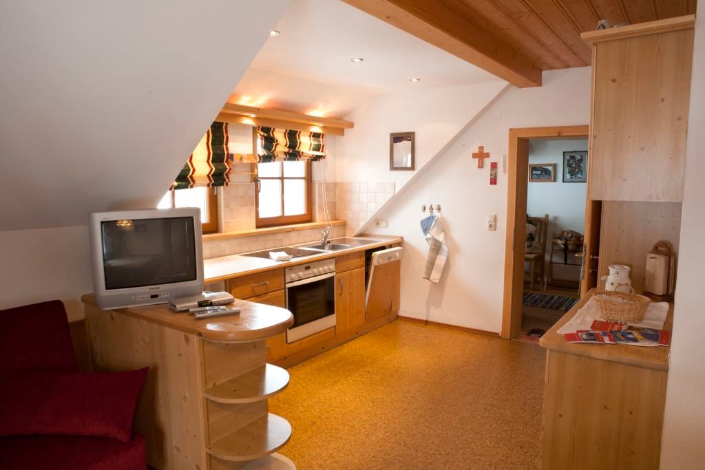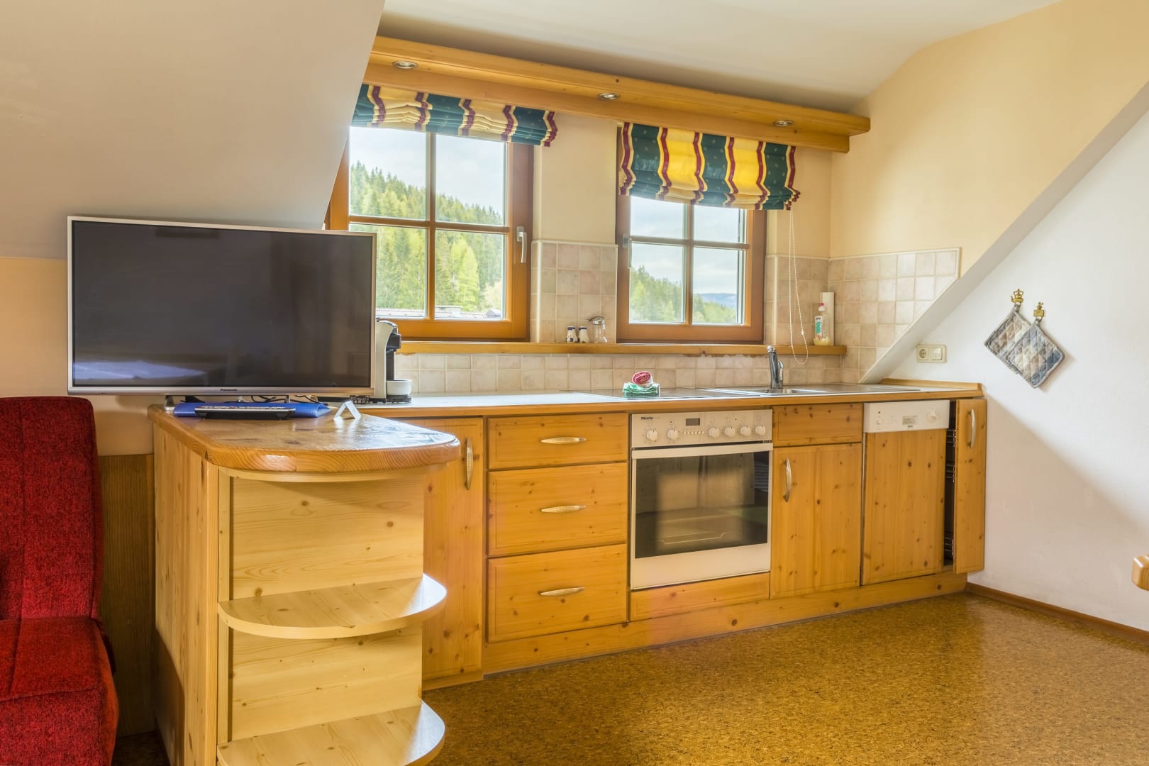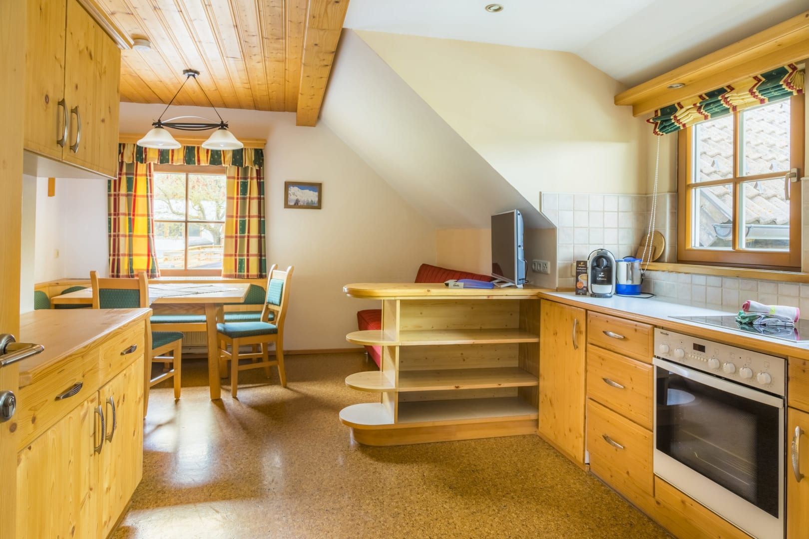 • Wohnküche mit Geschirrspüler, Kaffeemaschine und gemütlicher Sitzecke.