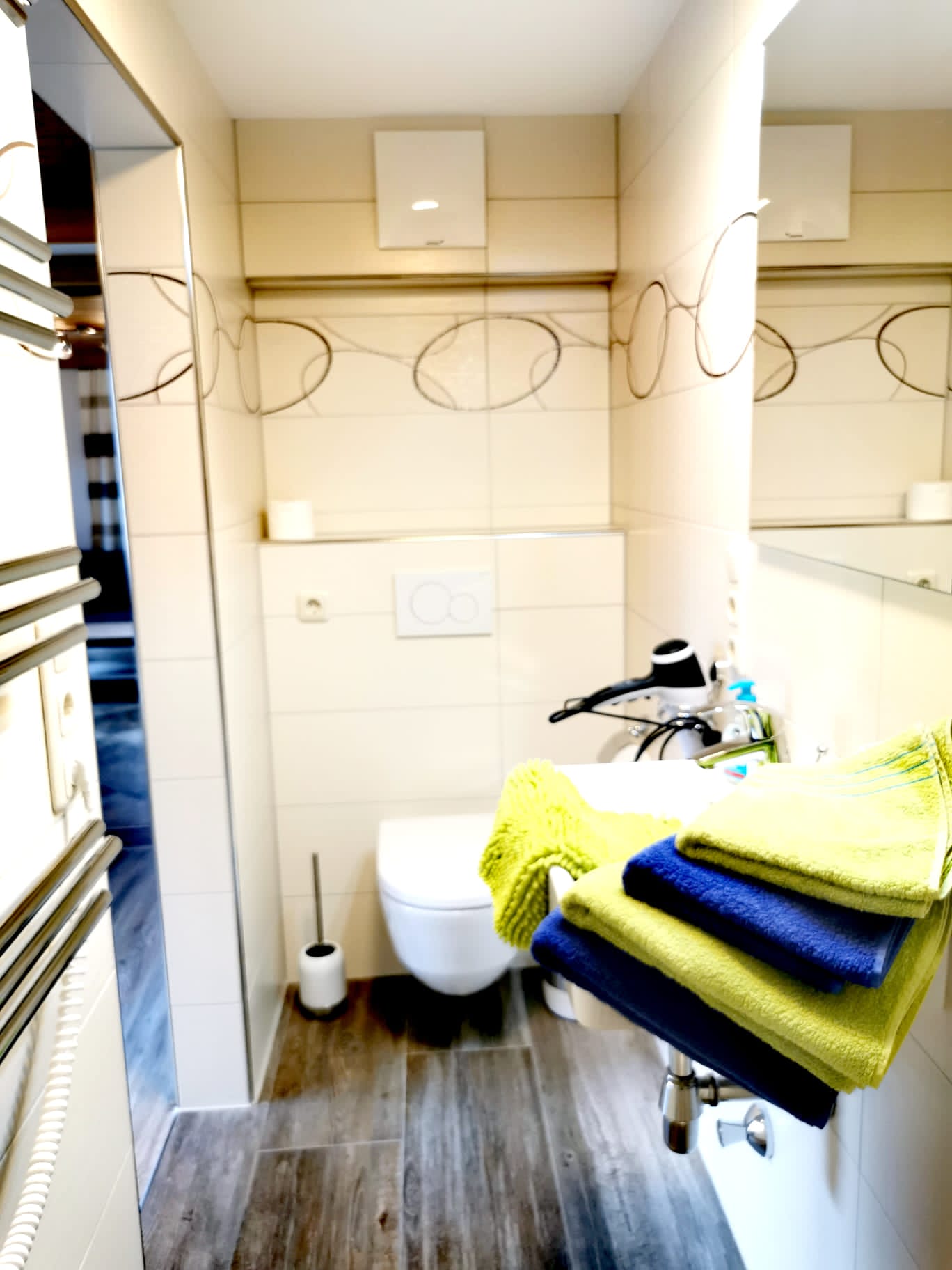 • Ein modernes Bad mit Dusche, WC, Föhn und ausreichend Handtüchern