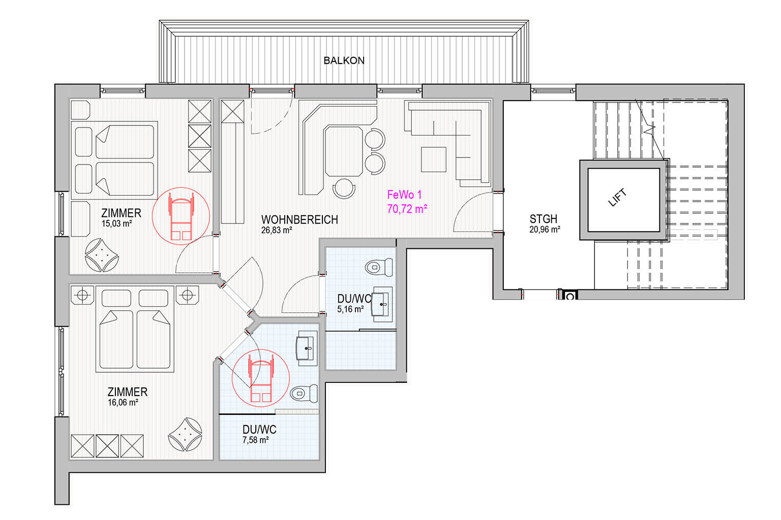 • 2 barrierefreie Badezimmer mit Dusche & WC (davon eines mit dem Schlafzimmer verbunden)