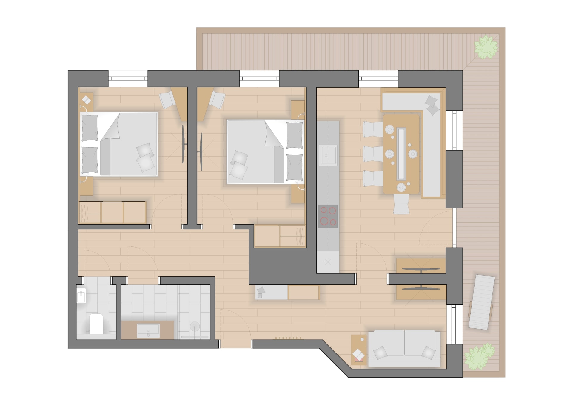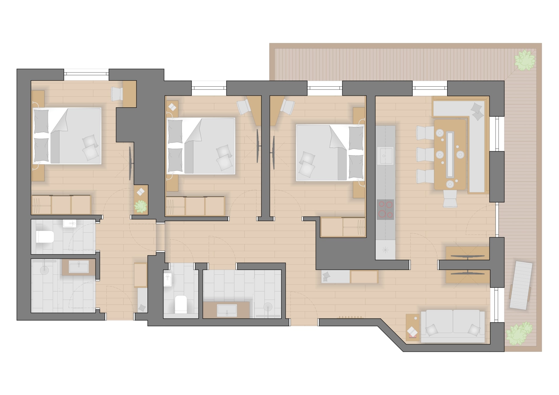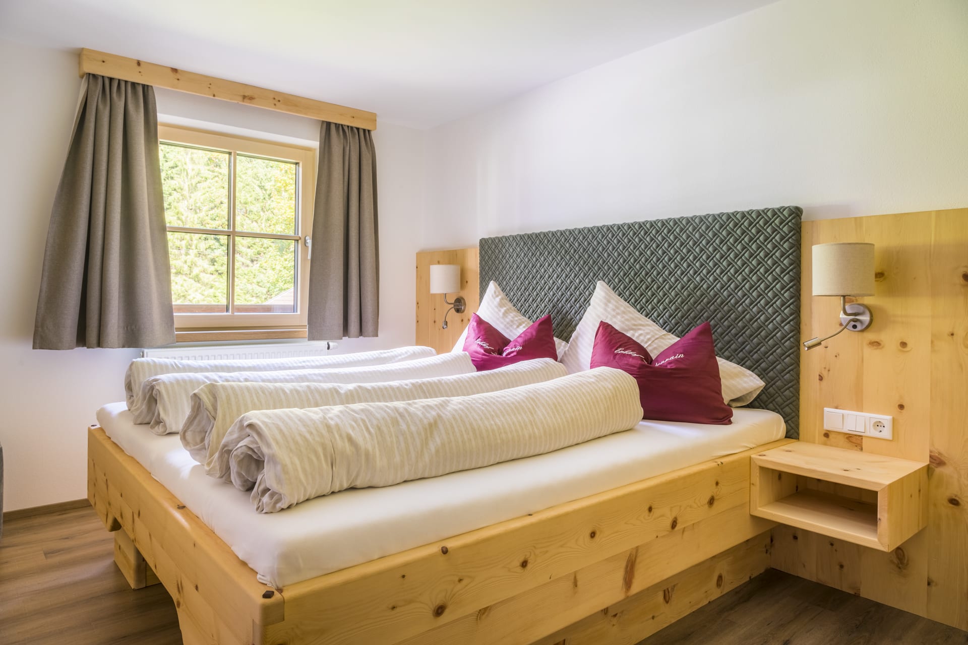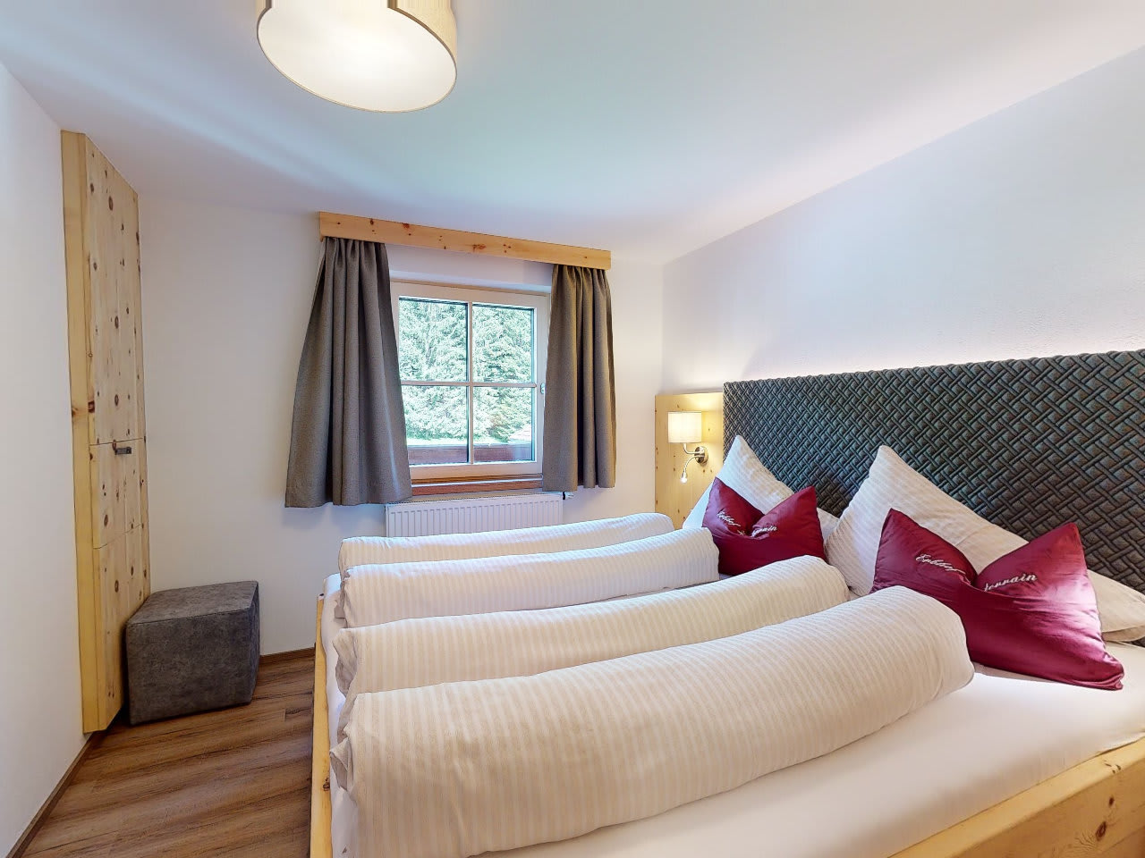 Ausgestattet mit einem 4-Platten-Herd, Backofen, Mikrowelle, Kühlschrank, Wasserkocher und kompletter Küchenausstattung sowie Reinigungsutensilien, bietet sie alles, was Sie für die Zubereitung köstlicher Mahlzeiten benötigen. Ein praktischer Vorraum mit Garderobe führt Sie in Ihr Urlaubszuhause. Freuen Sie sich auf zwei bis drei separate Schlafzimmer mit Zirbenbetten und Kabel-TV.