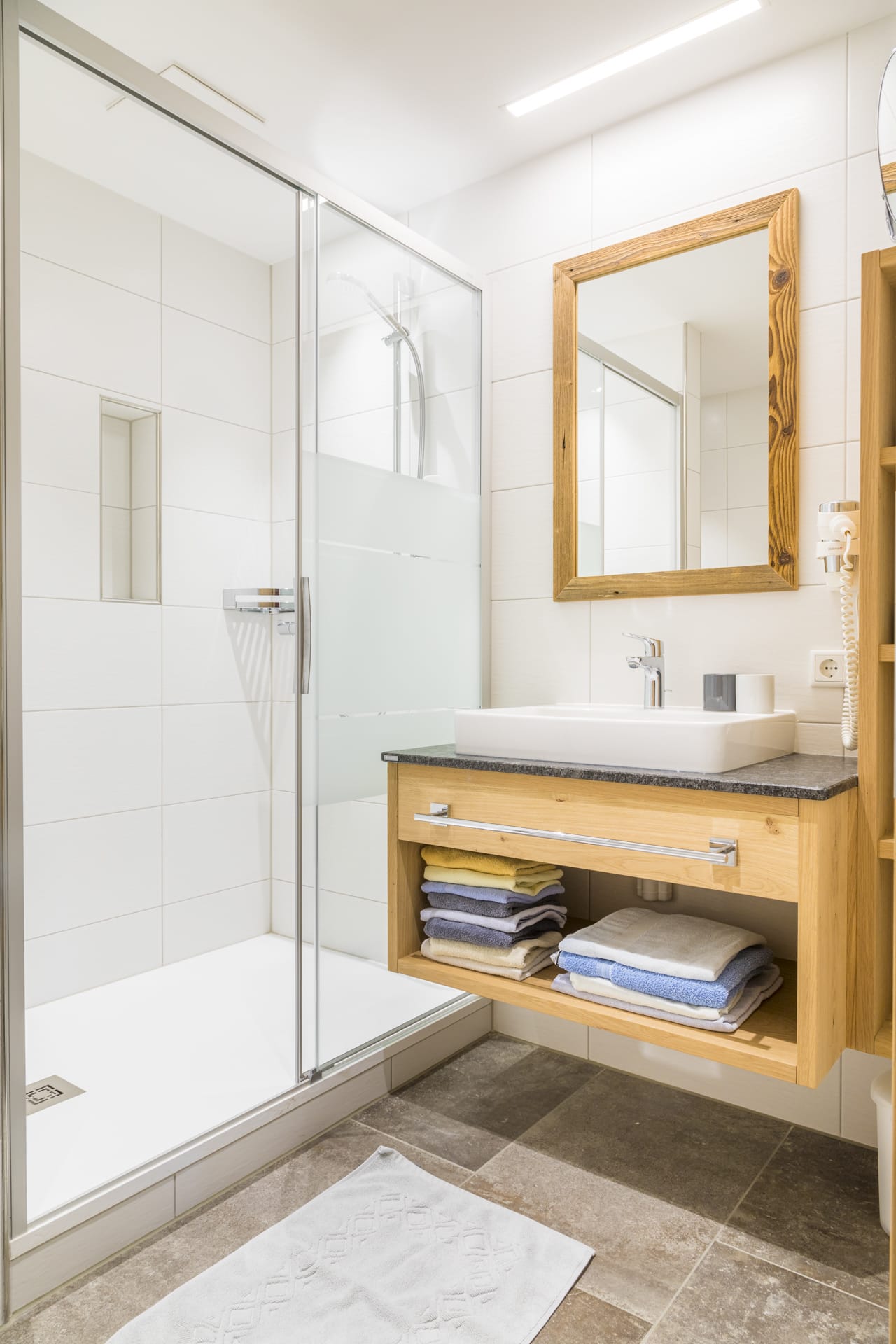 Ein modernes Badezimmer mit Dusche und ein separates WC sorgen für maximalen Komfort und Privatsphäre. Frische Hand/Duschtücund ein Haartrockner liegen für Sie bereit.
