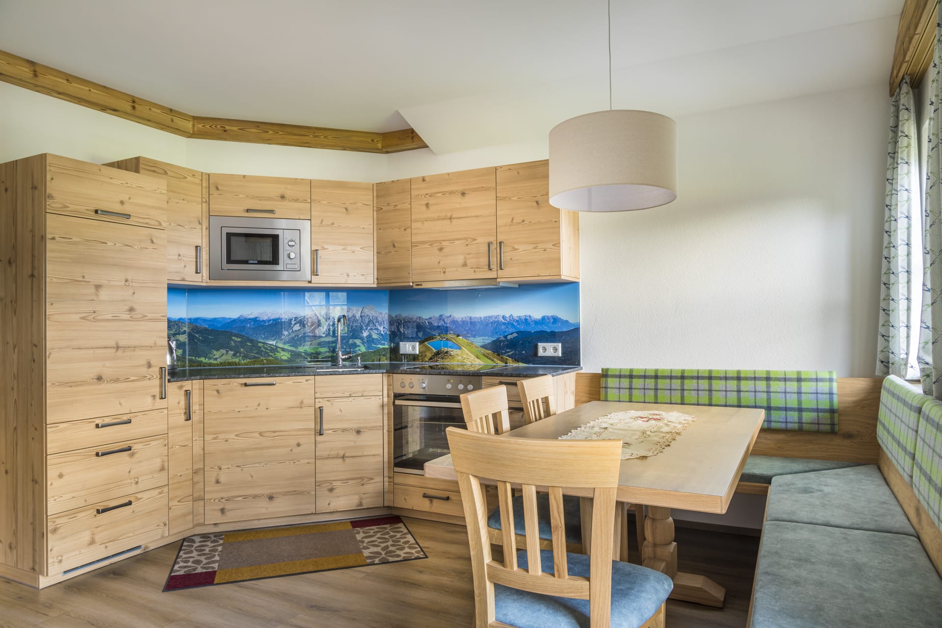 Die voll ausgestattete Wohnküche lässt keine Wünsche offen – bereiten Sie mühelos köstliche Mahlzeiten zu mit einem modernen 4-Plattenherd, Backofen, Mikrowelle, Kühlschrank, Wasserkocher und allen nötigen Küchenutensilien.