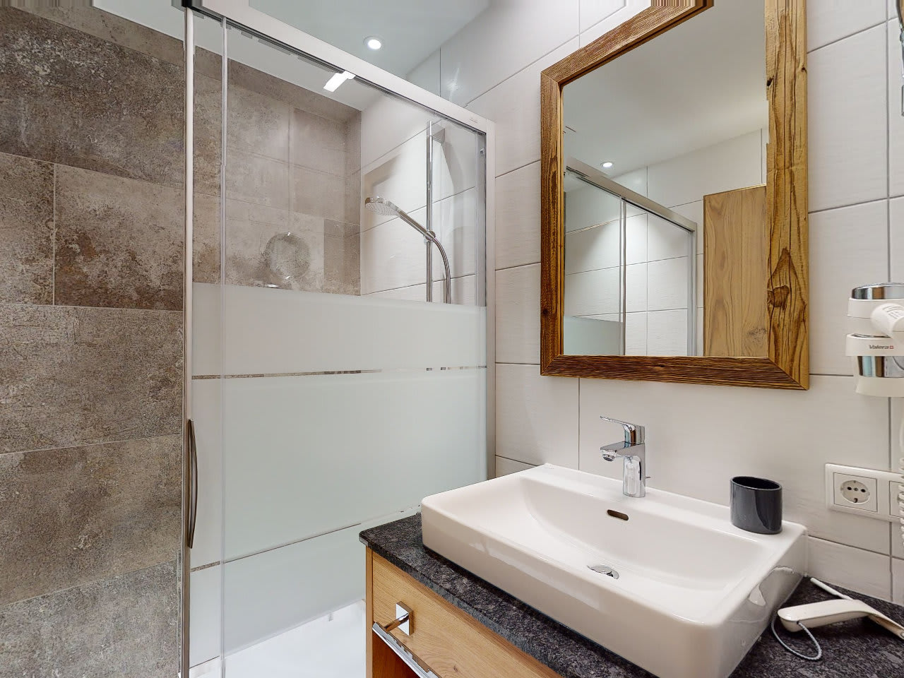 Ein modernes Badezimmer mit Dusche und ein separates WC sorgen für maximalen Komfort und Privatsphäre. Frische Hand/ Duschtücher und ein Haartrockner liegen für Sie bereit.
