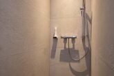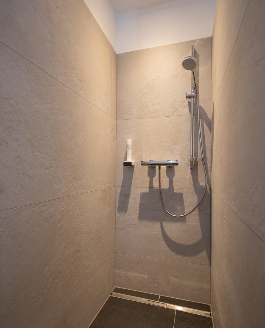 • stylisches Bad mit begehbarer Dusche, Waschtisch mit aufgesetzter Wachschüssel auf einem Steinwaschtisch, Schminkspiegel