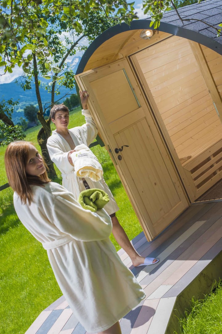 Lassen Sie den Alltag hinter sich in unserem Wellnessbereich mit Saunafassl, Infrarotkabine, Ruheraum mit Wellnessliegen und Schwaukelliegen mit großem Panoramafenster auf die Hohen Tauern. Oder nehmen Sie einfach ein Sonnenbad auf der großzügigen Terrasse. Auch unsere kleinen Gäste können den Wellnessbereich in Begleitung der Eltern nützen. Einen Leibademantel mit Saunatuch stellen wir gerne gegen Gebühr von € 5,- pro Aufenthalt zur Verfügung.