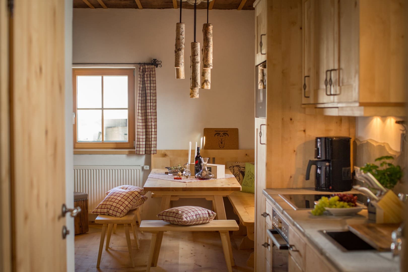 • Vollausgestattete Vollholzküche aus Birkenholz und Küchenplatte aus Rauriser Stein mit Herd, Backrohr, Mikrowelle, Kühlschrank, Geschirrspüler, Wasserkocher, Kaffeemaschine und Espressomaschine (mit Kaffeetabs der Marke Tchibo).