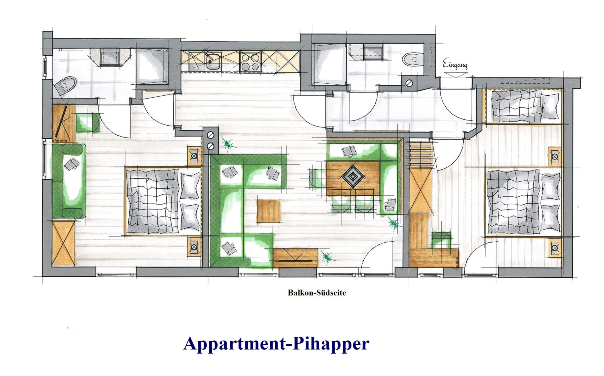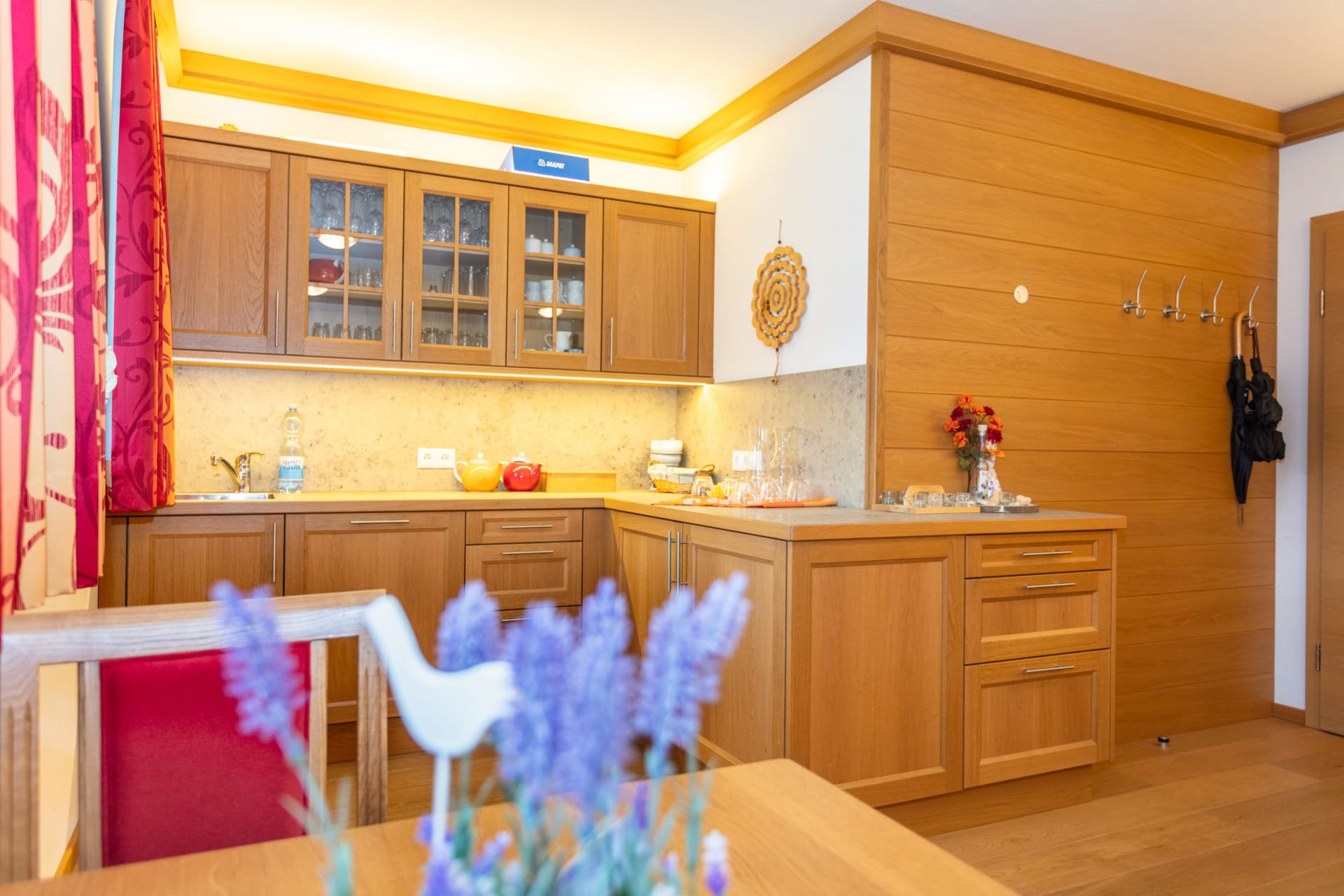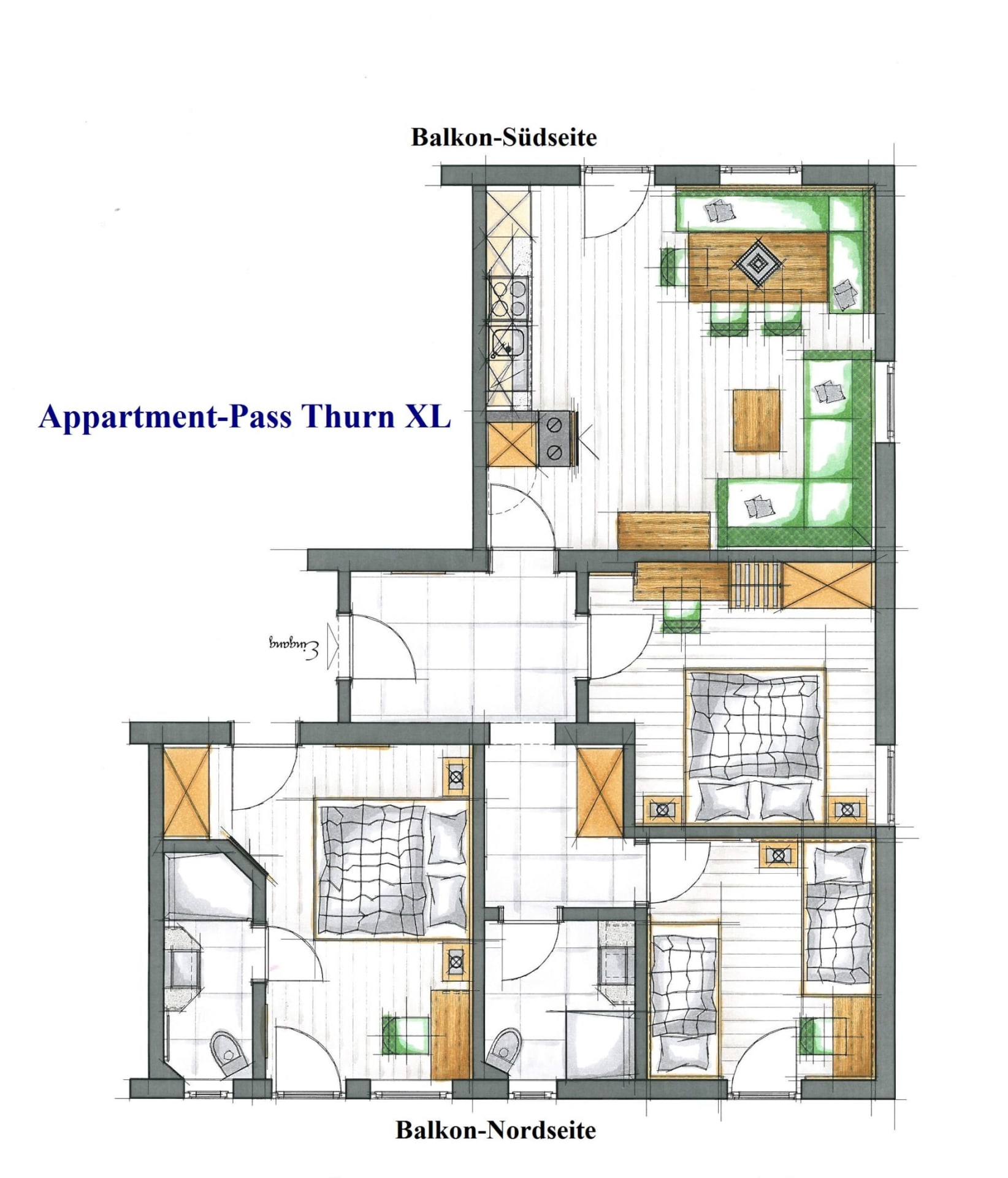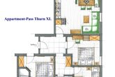Die Ferienwohnung Pass Thurn XL mit 85 m² bietet Platz für bis zu 6 Personen. Das direkt nebenan liegende Komfortzimmer mit eigenem Bad und die Ferienwohnung Pass Thurn ergeben die große Wohnung für 6 Personen.