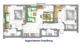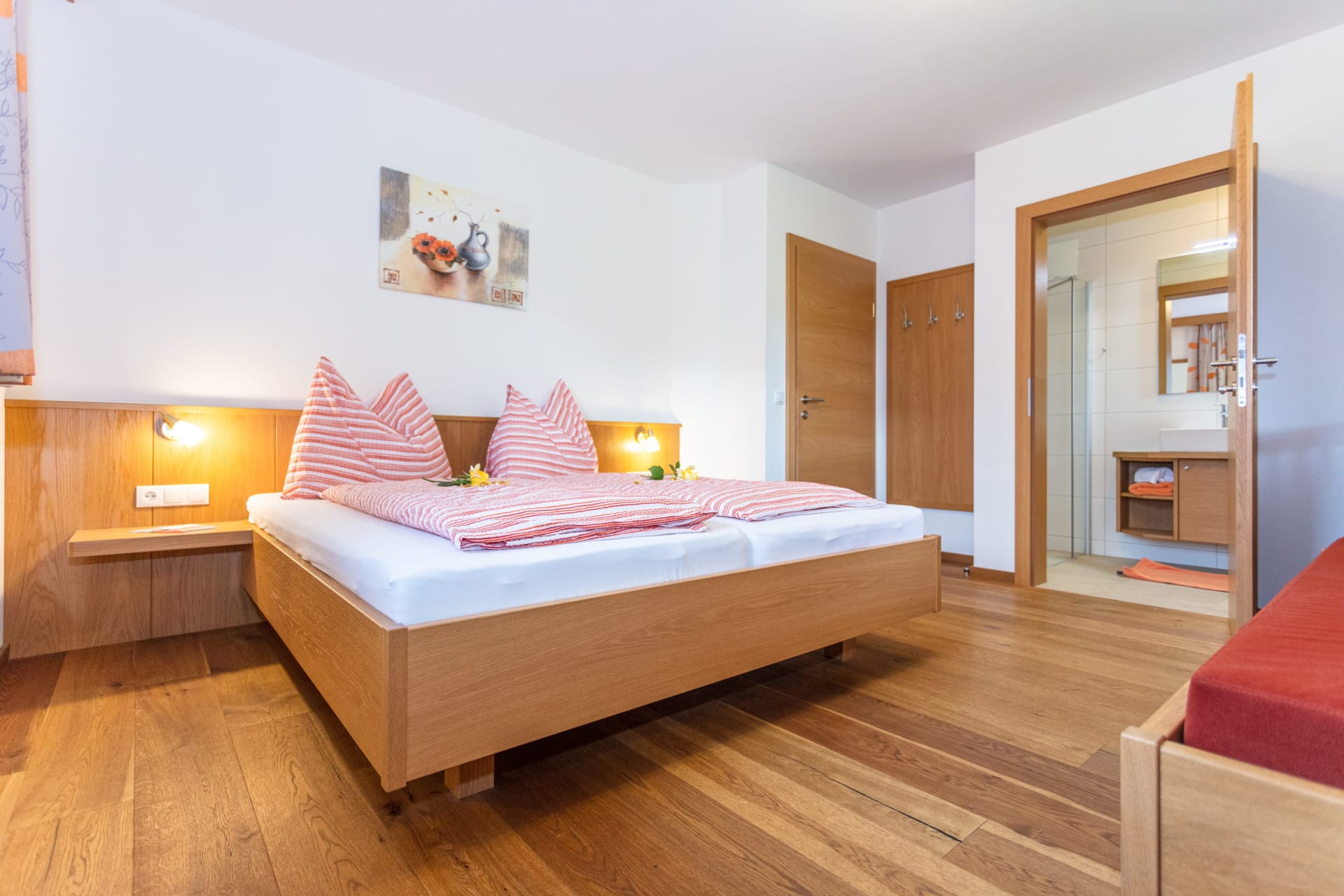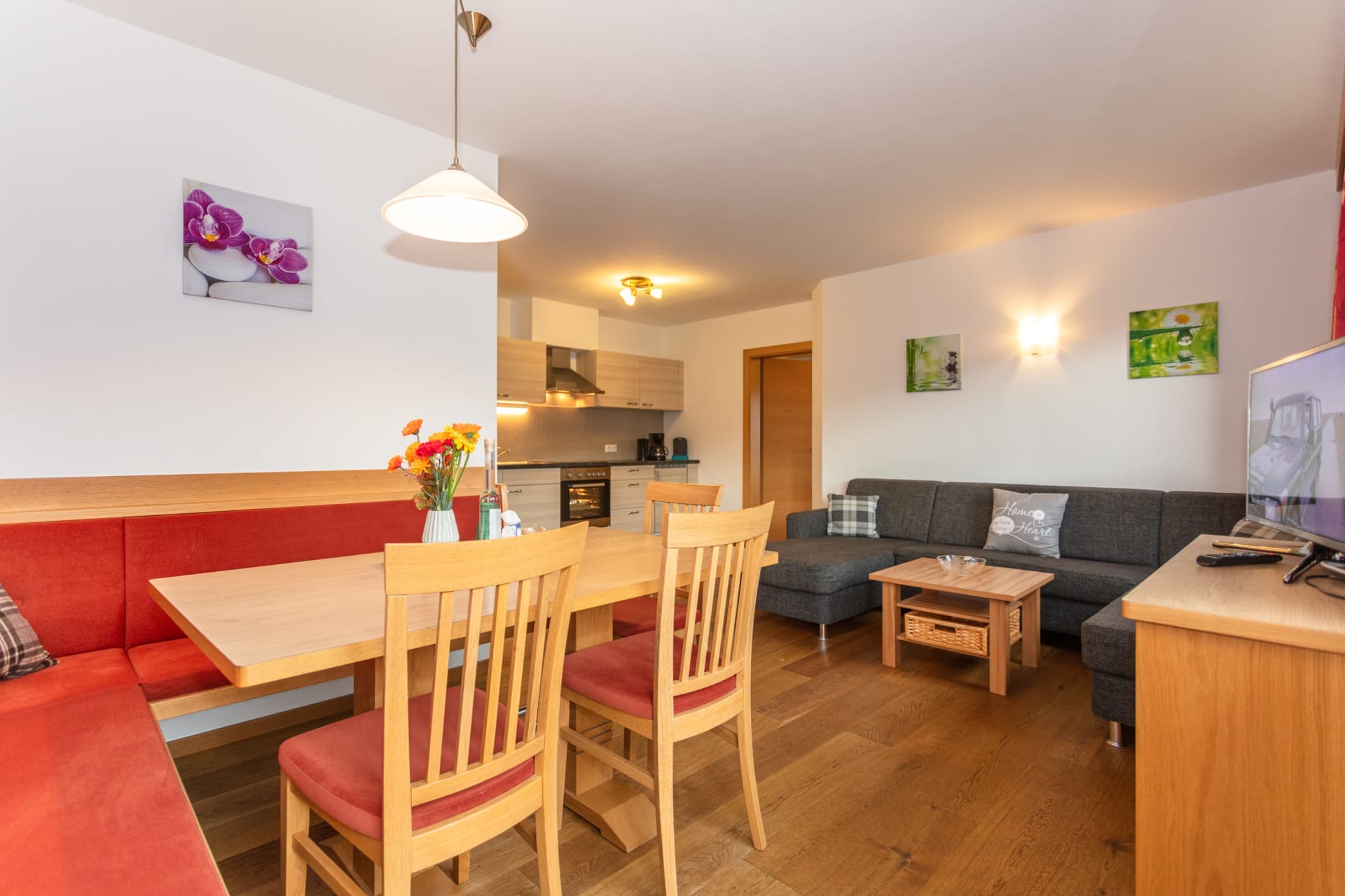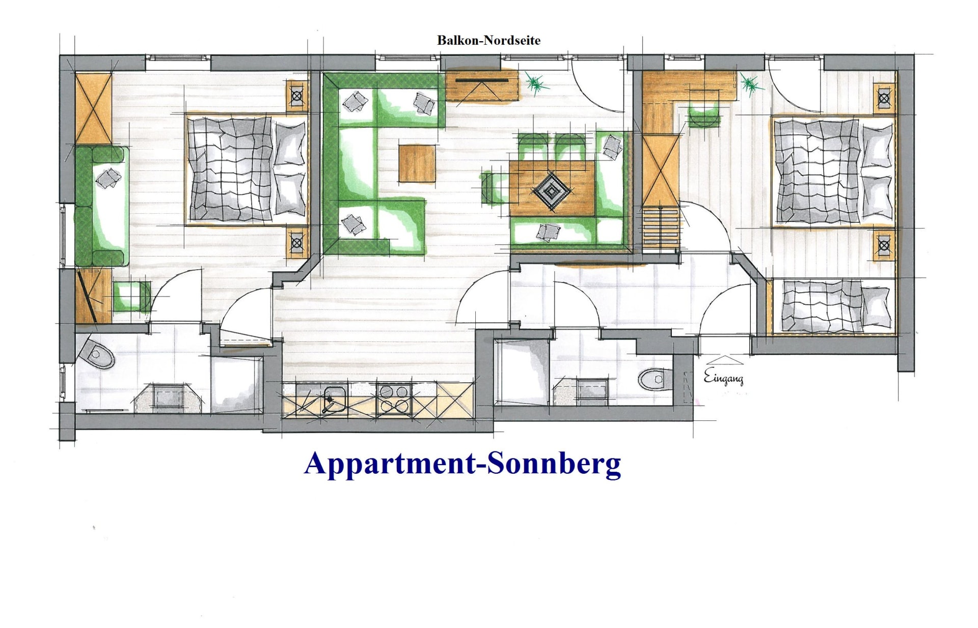 Die Ferienwohnung Sonnberg mit 70 m² bietet Platz für bis zu 6 Personen und einen erholsamen Urlaub. Der Balkon bietet einen tollen Ausblick auf die umliegende Bergwelt.