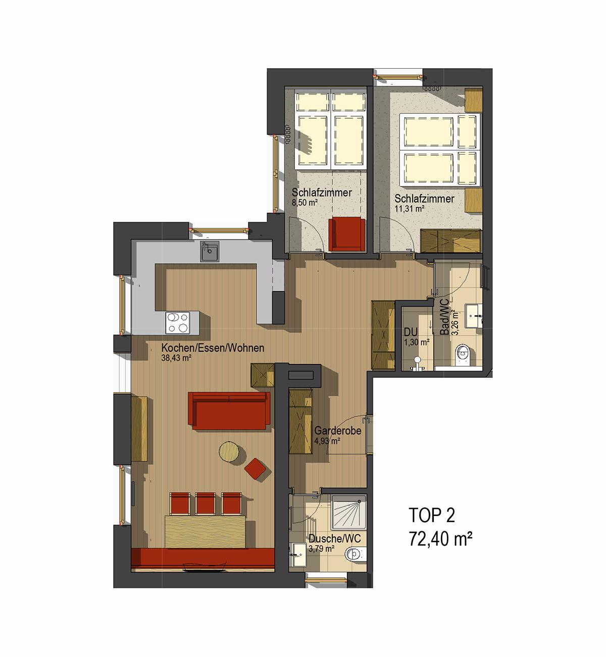 • 2 Badezimmer mit Dusche/WC, 1 Infrarotelement, Fön