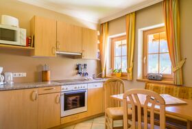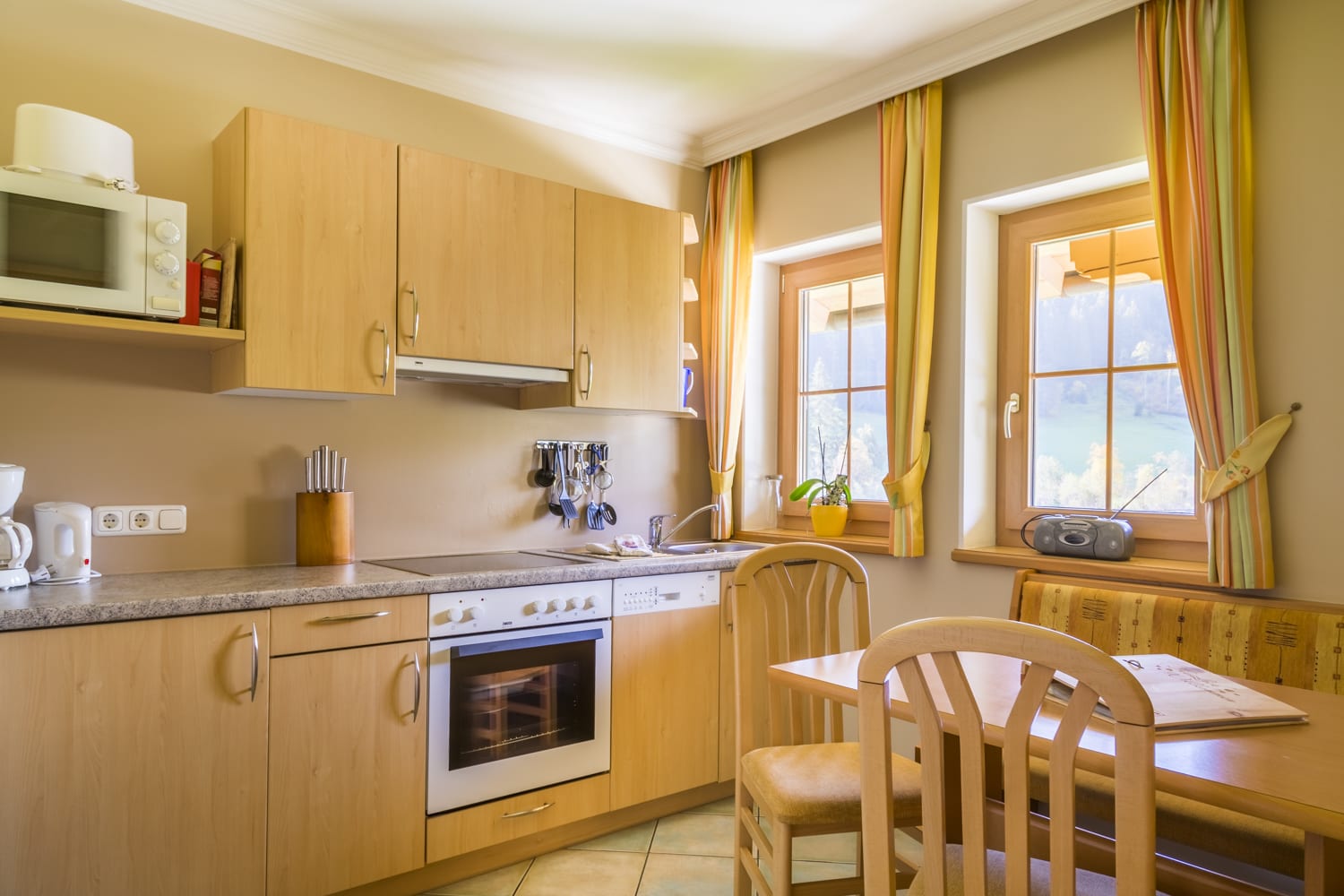 • vollausgestattete Küche (Mikrowelle, Backofen, Geschirrspüler, Wasserbecken, Kühlschrank, Herd, Geschirr, Kaffeemaschine, Gläser, Toaster …)