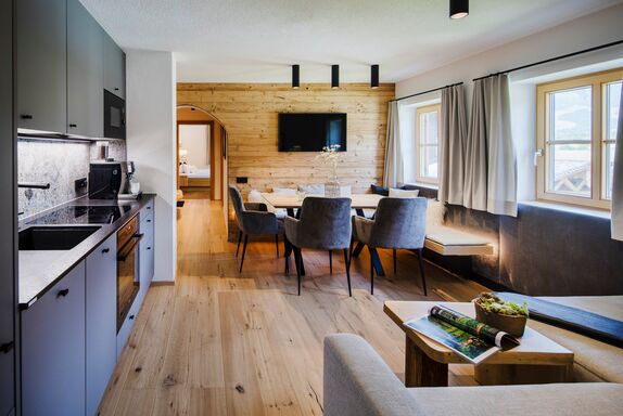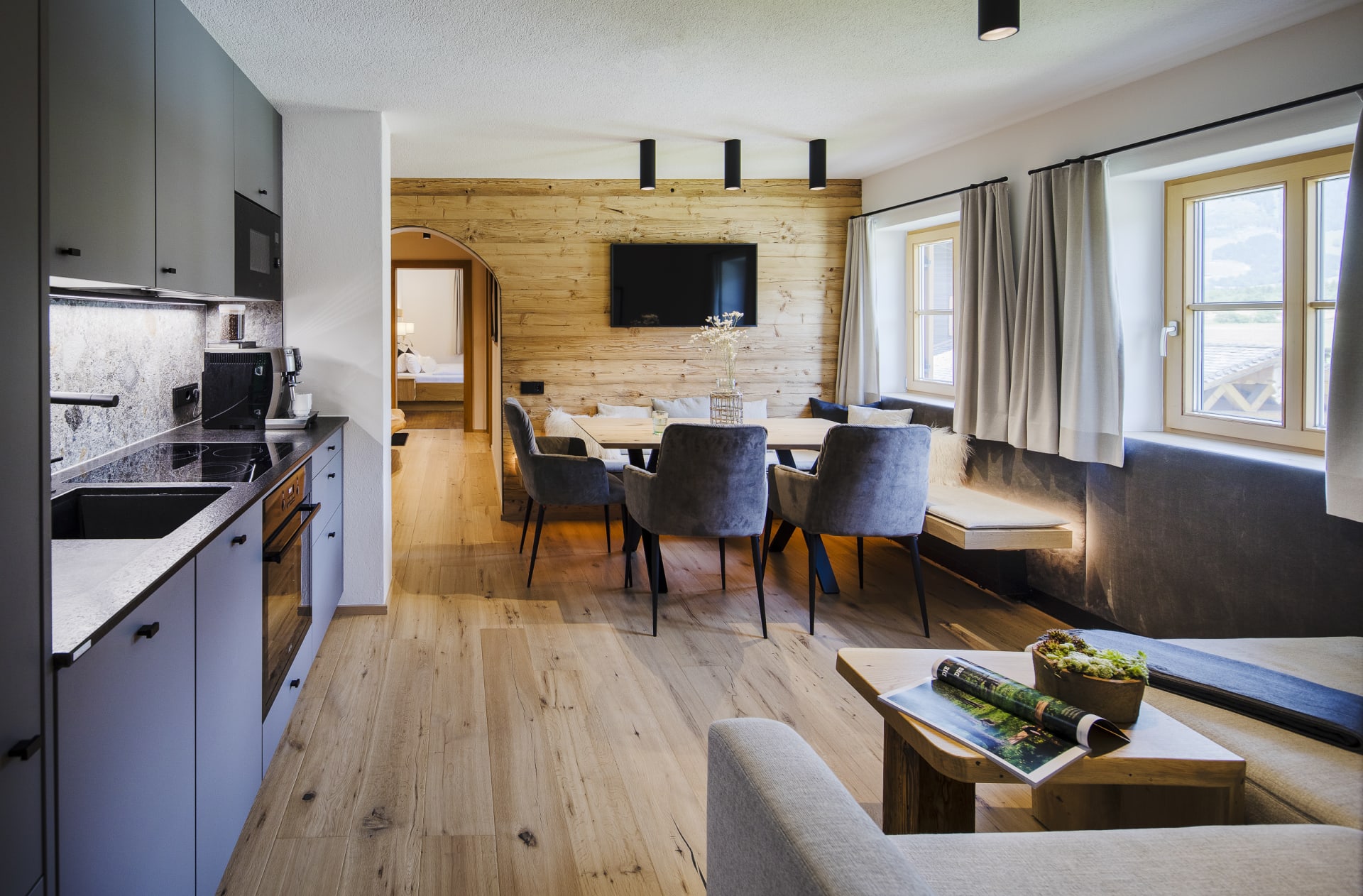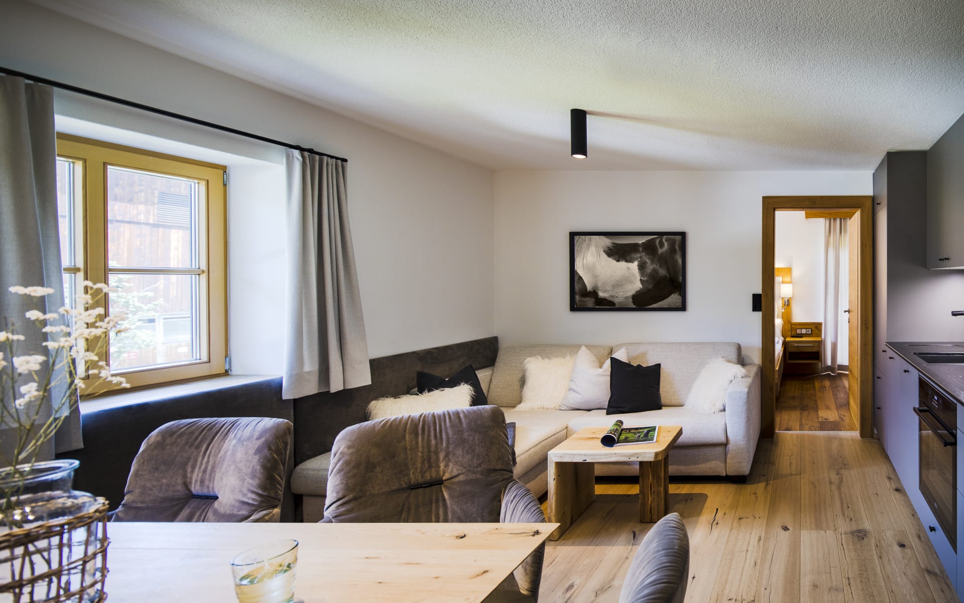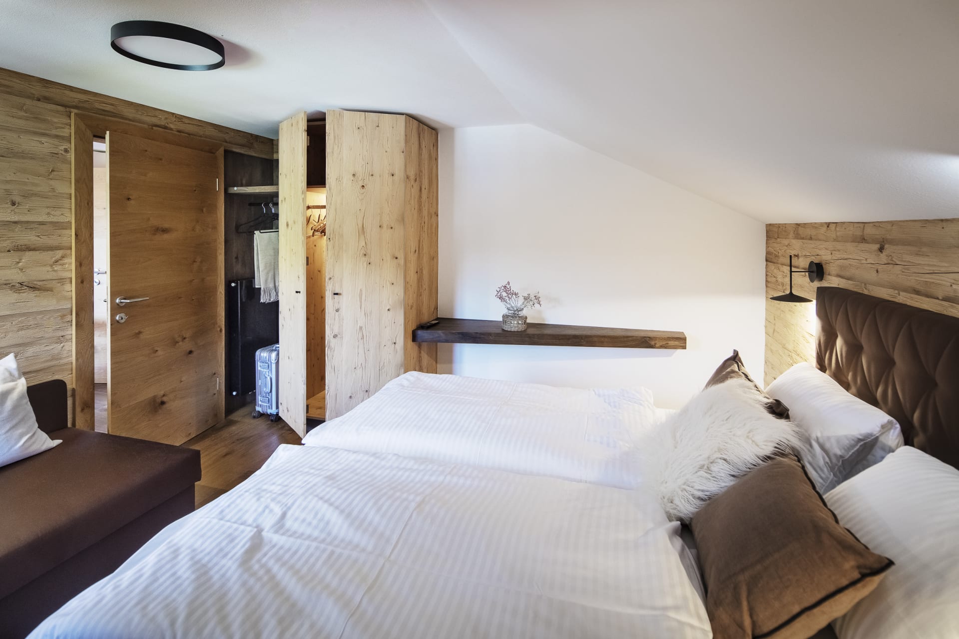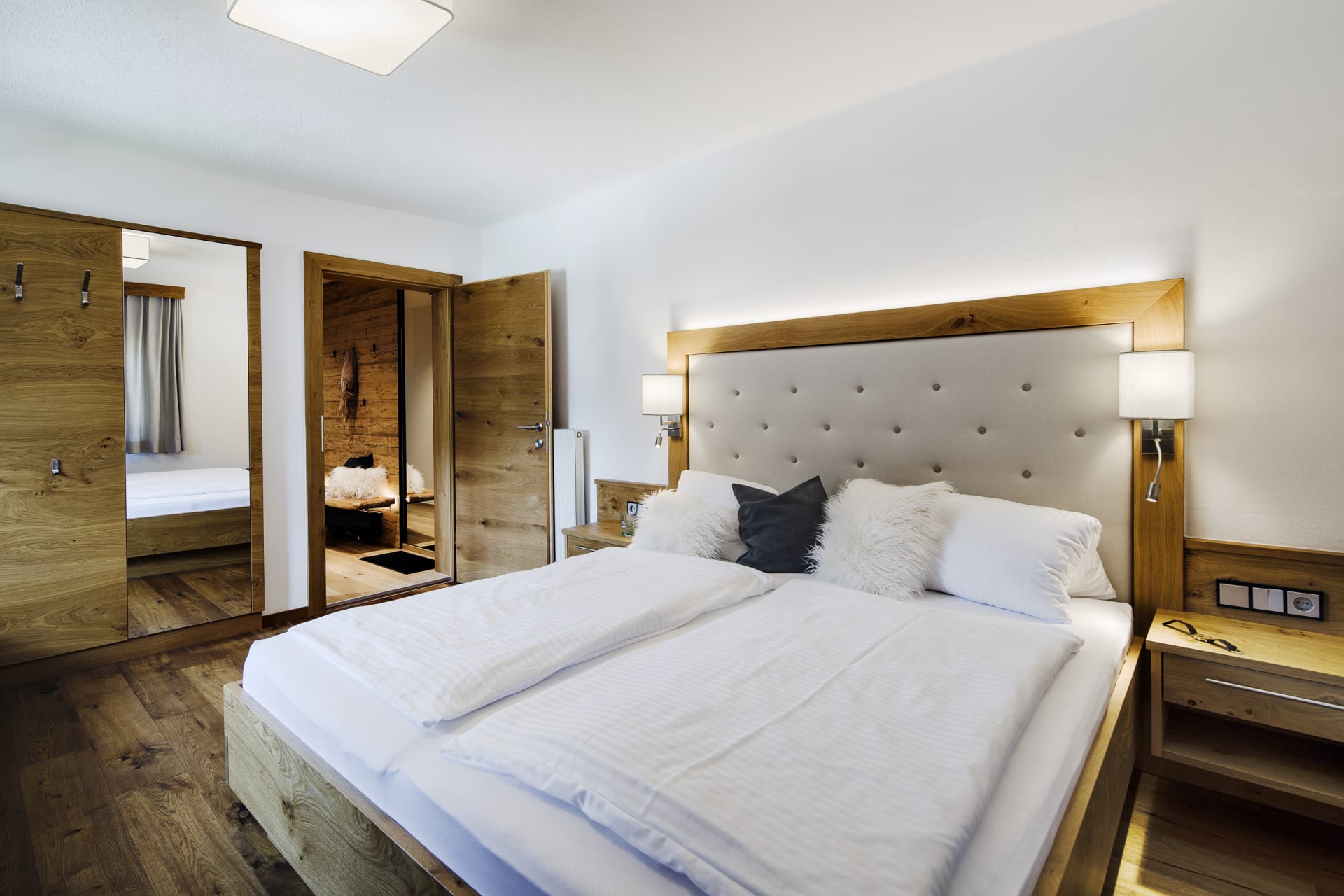 Willkommen in unseren einladenden Apartments, wo helles Holz auf hochwertige Ausstattung und herzliche Gastfreundschaft trifft. Auf großzügigen 60-65 m² erwartet Sie ein harmonisches Zuhause mit atemberaubendem Blick auf die umliegende Berglandschaft. Jedes Apartment bietet Wohlfühlatmosphäre mit zwei getrennten Schlafzimmern, ausgestattet mit zwei komfortablen Kingsize-Betten und einem Couchbett, ideal für bis zu 5 Personen.