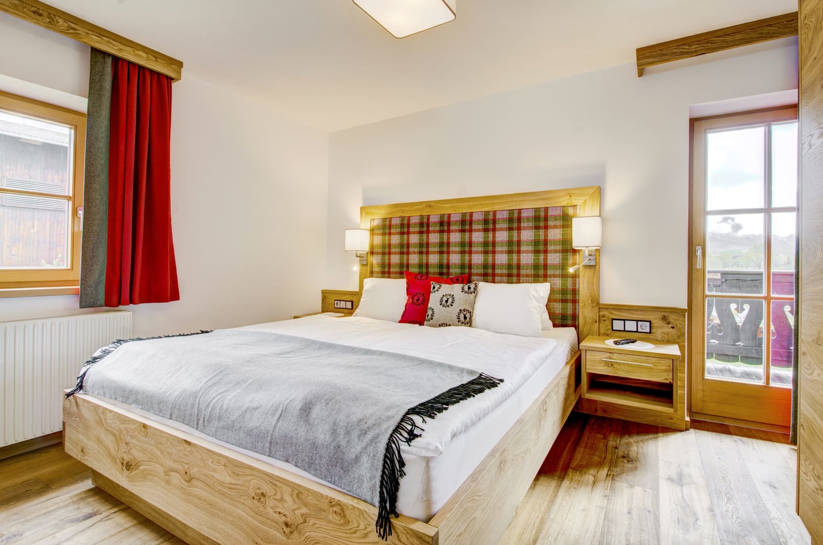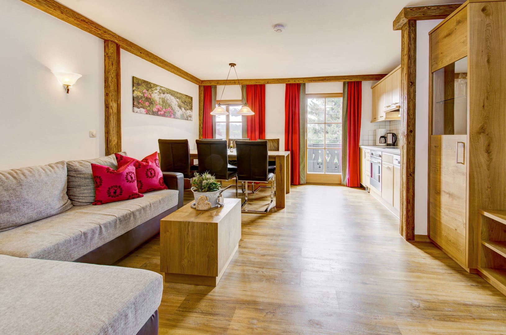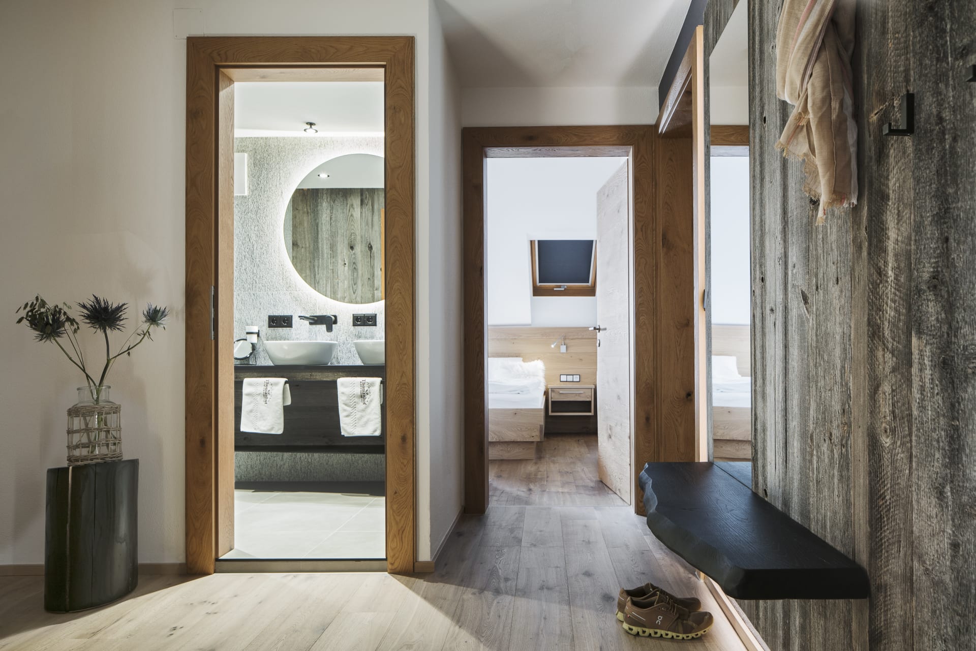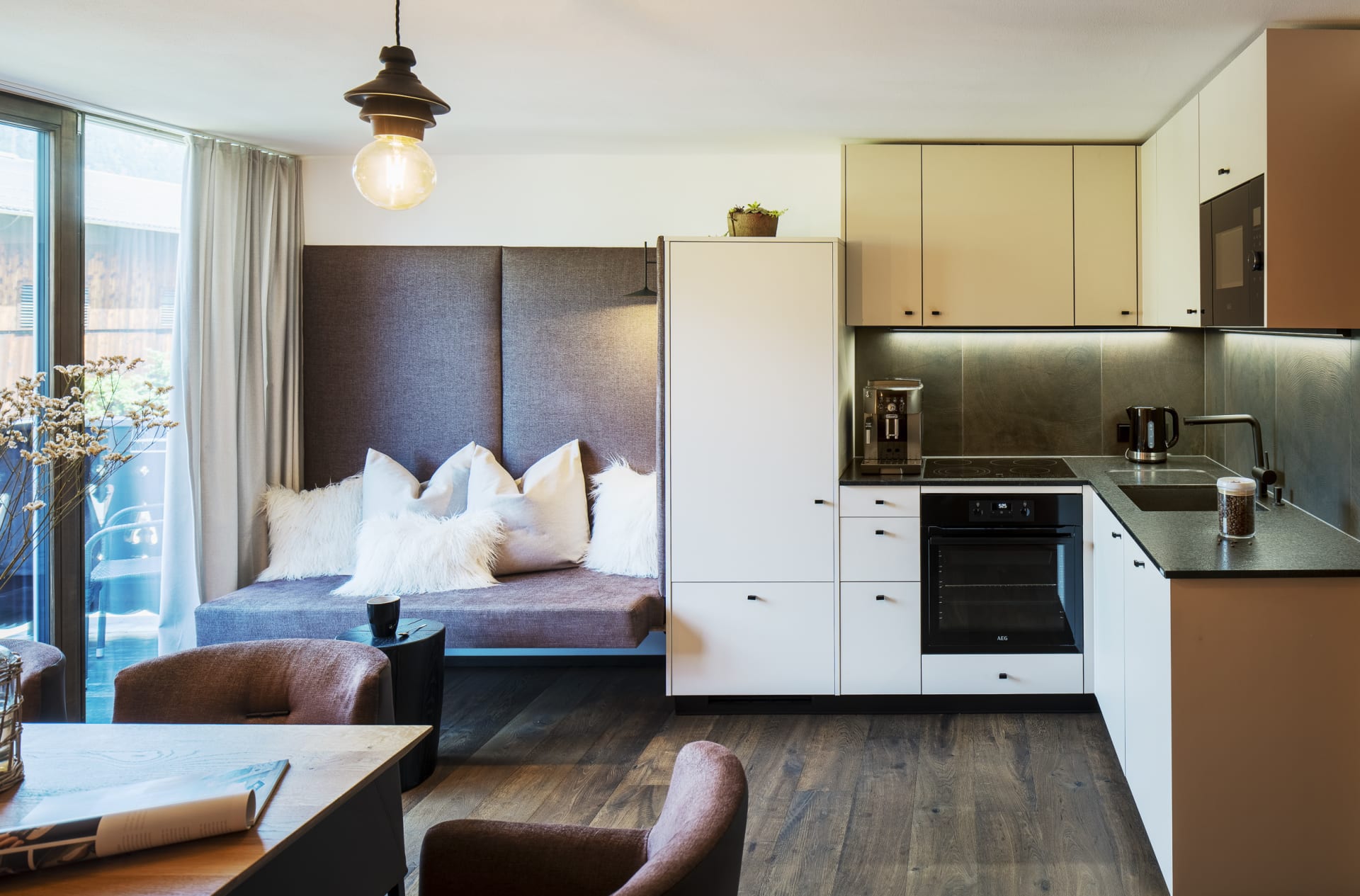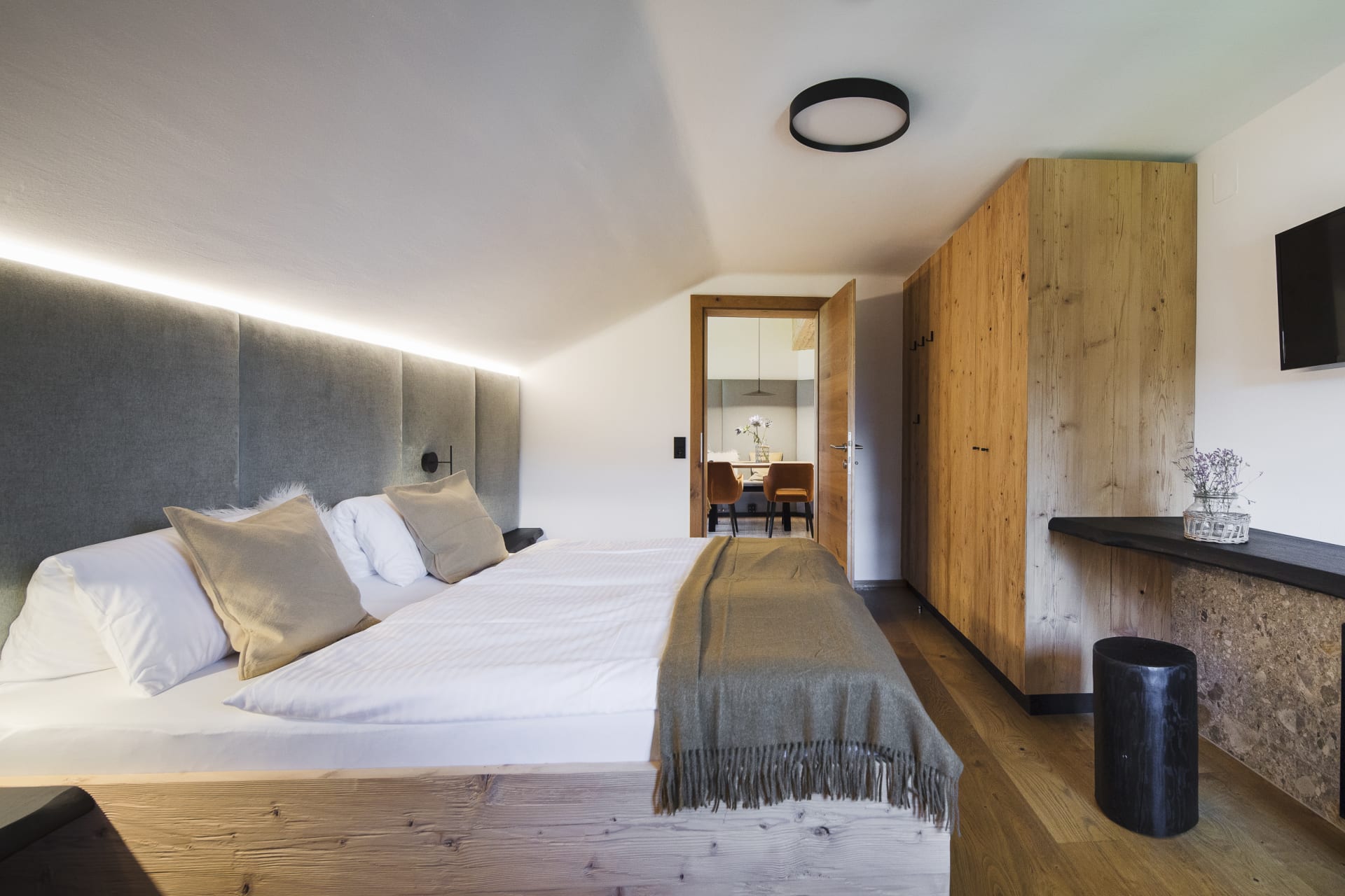 Willkommen in unseren einladenden Apartments, wo helles Holz auf hochwertige Ausstattung und herzliche Gastfreundschaft trifft. Auf großzügigen 60-65 m² erwartet Sie ein harmonisches Zuhause mit atemberaubendem Blick auf die umliegende Berglandschaft. Jedes Apartment bietet Wohlfühlatmosphäre mit zwei getrennten Schlafzimmern, ausgestattet mit zwei komfortablen Kingsize-Betten und einem Couchbett, ideal für bis zu 5 Personen.