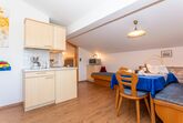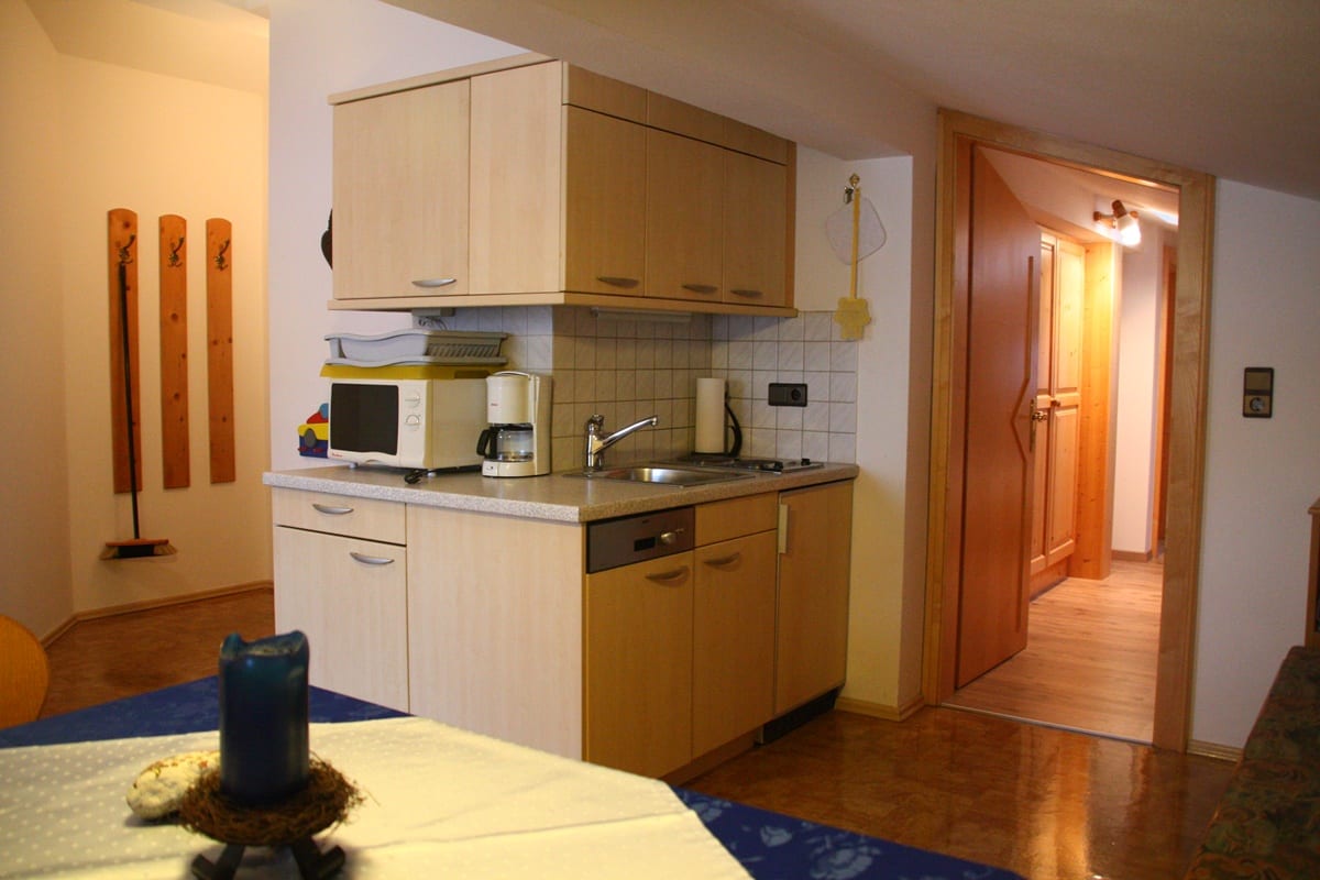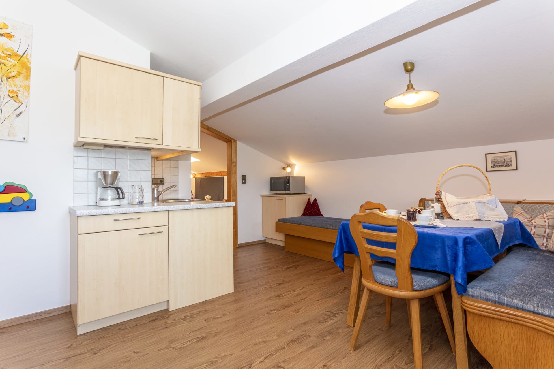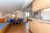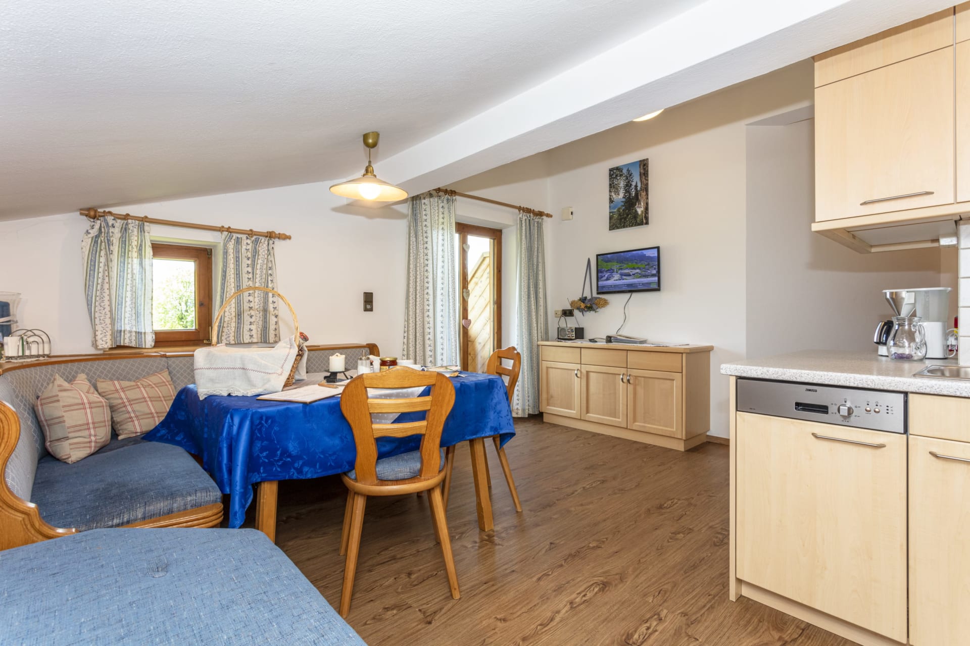• große Wohnküche mit Couch, Eckbank mit großem Tisch, Küchenblock mit Geschirr, Geschirrspülmaschine, 2 Kochplatten, Mikrowelle mit Backofenfunktion, Mixer, Kaffeemaschine, Kühlschrank, Toaster (auf Anfrage), Kabel-TV, Radio, abgeschlossenem Balkon im Dachgeschoß (2. Stock).