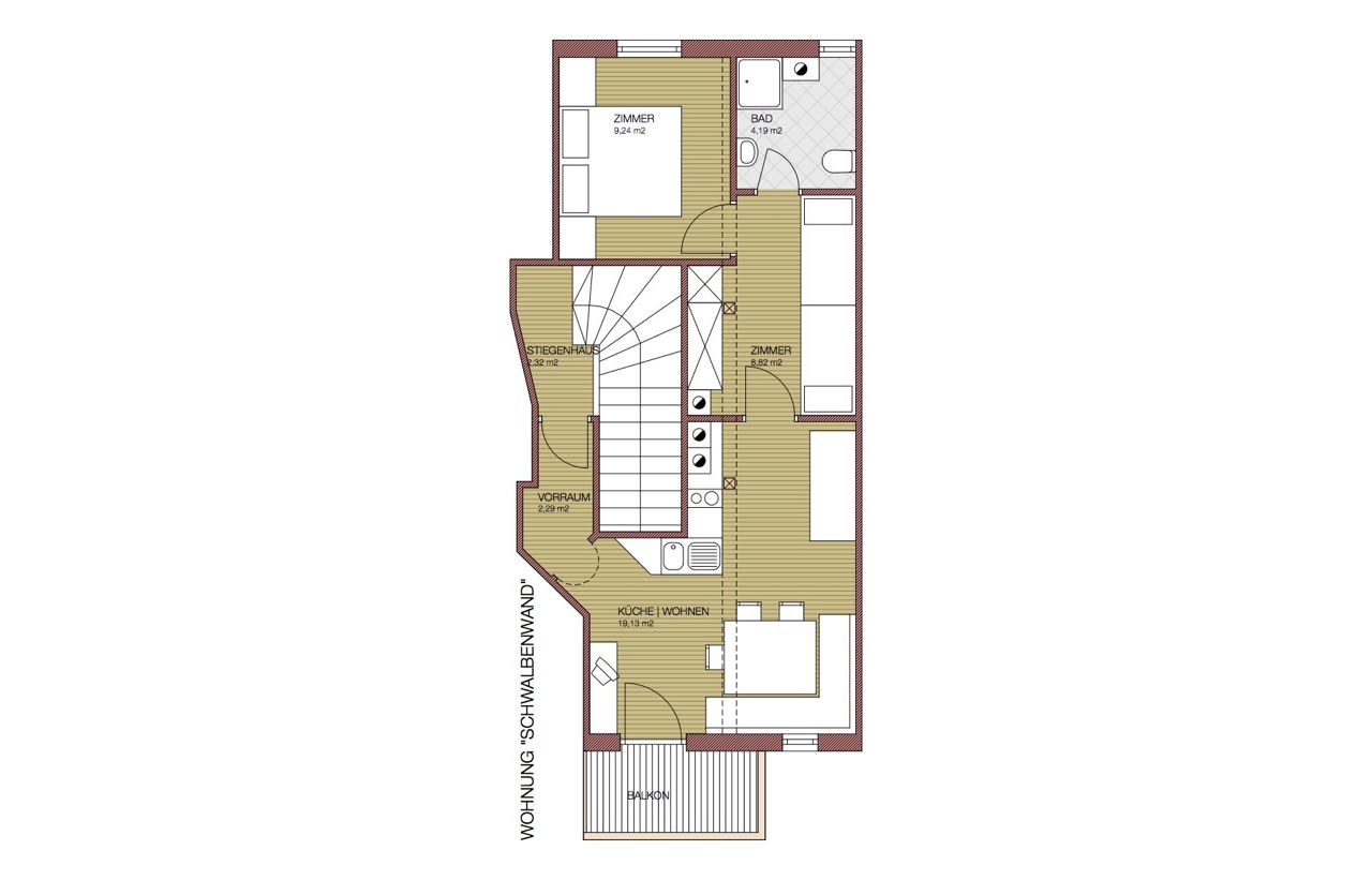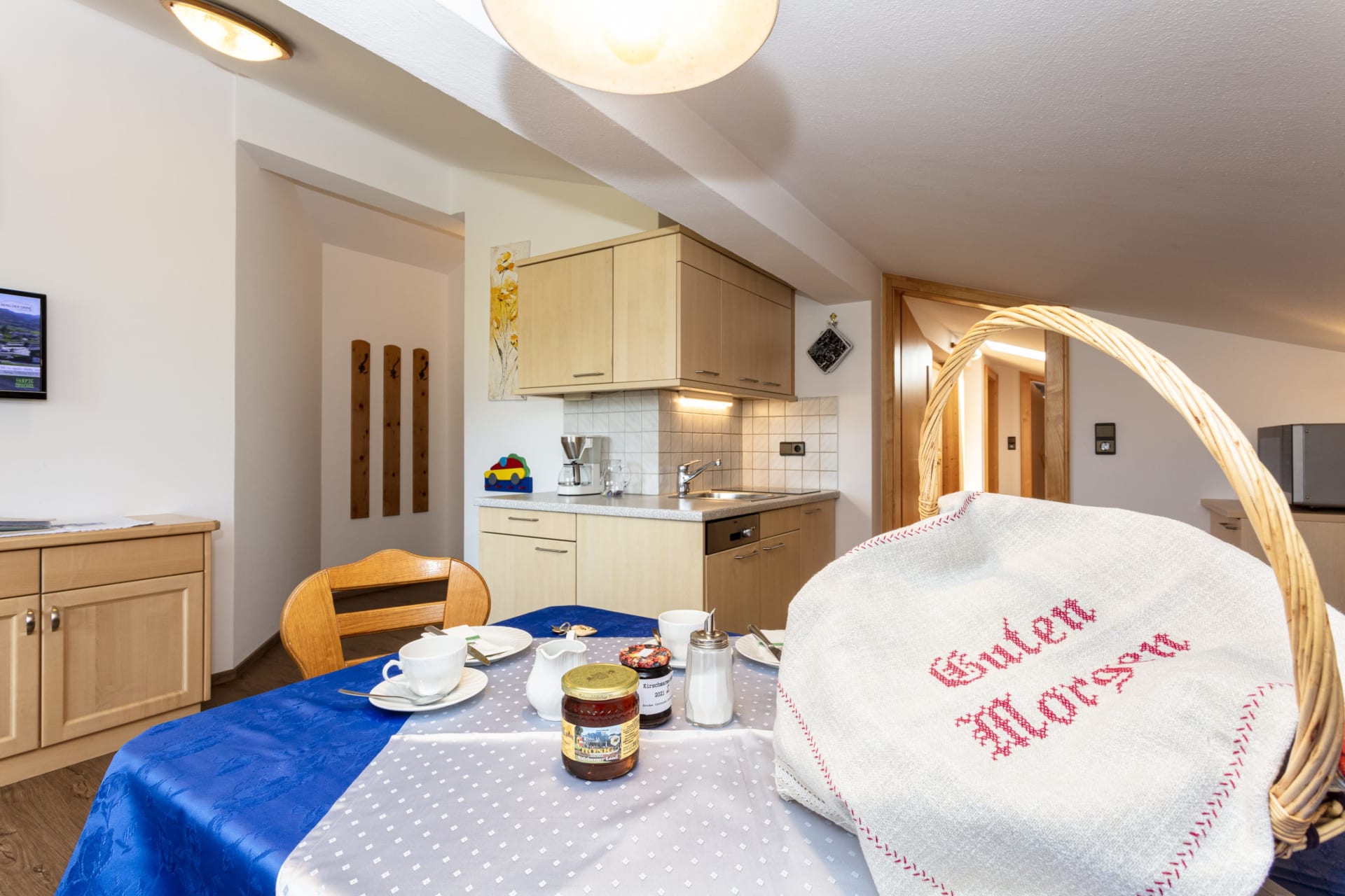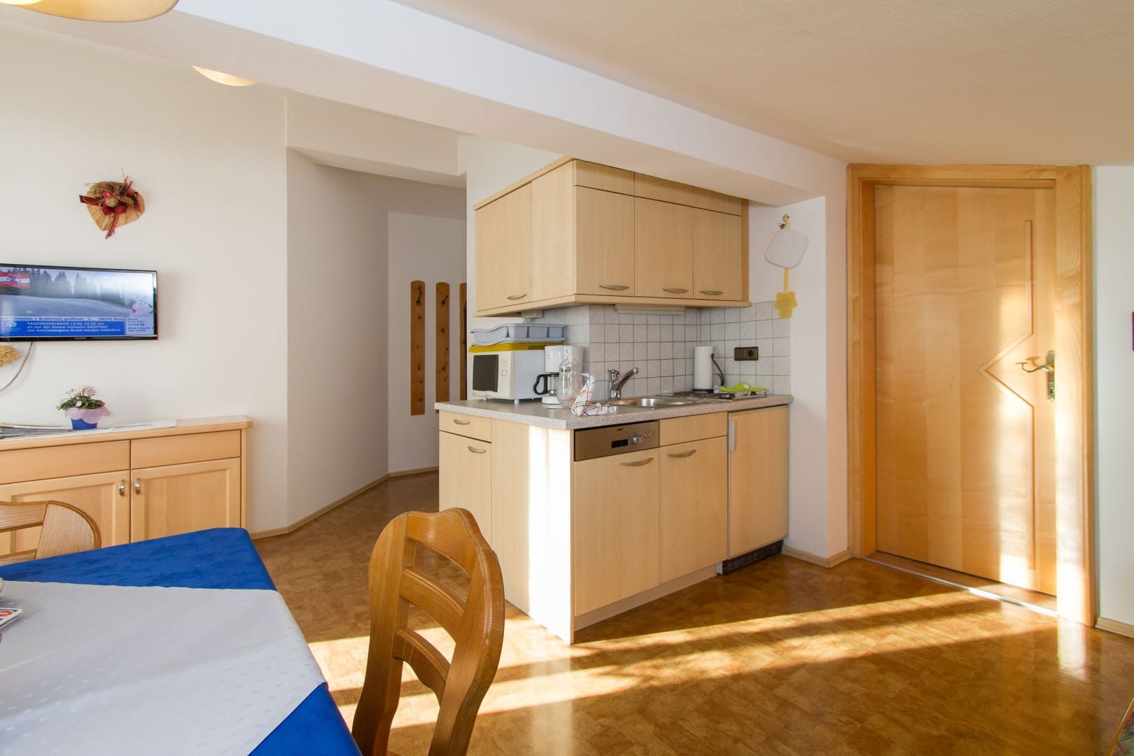 • große Wohnküche mit Couch, Eckbank mit großem Tisch, Küchenblock mit Geschirr, Geschirrspülmaschine, 2 Kochplatten, Mikrowelle mit Backofenfunktion, Mixer, Kaffeemaschine, Kühlschrank, Toaster (auf Anfrage), Kabel-TV, Radio, abgeschlossenem Balkon im Dachgeschoß (2. Stock).