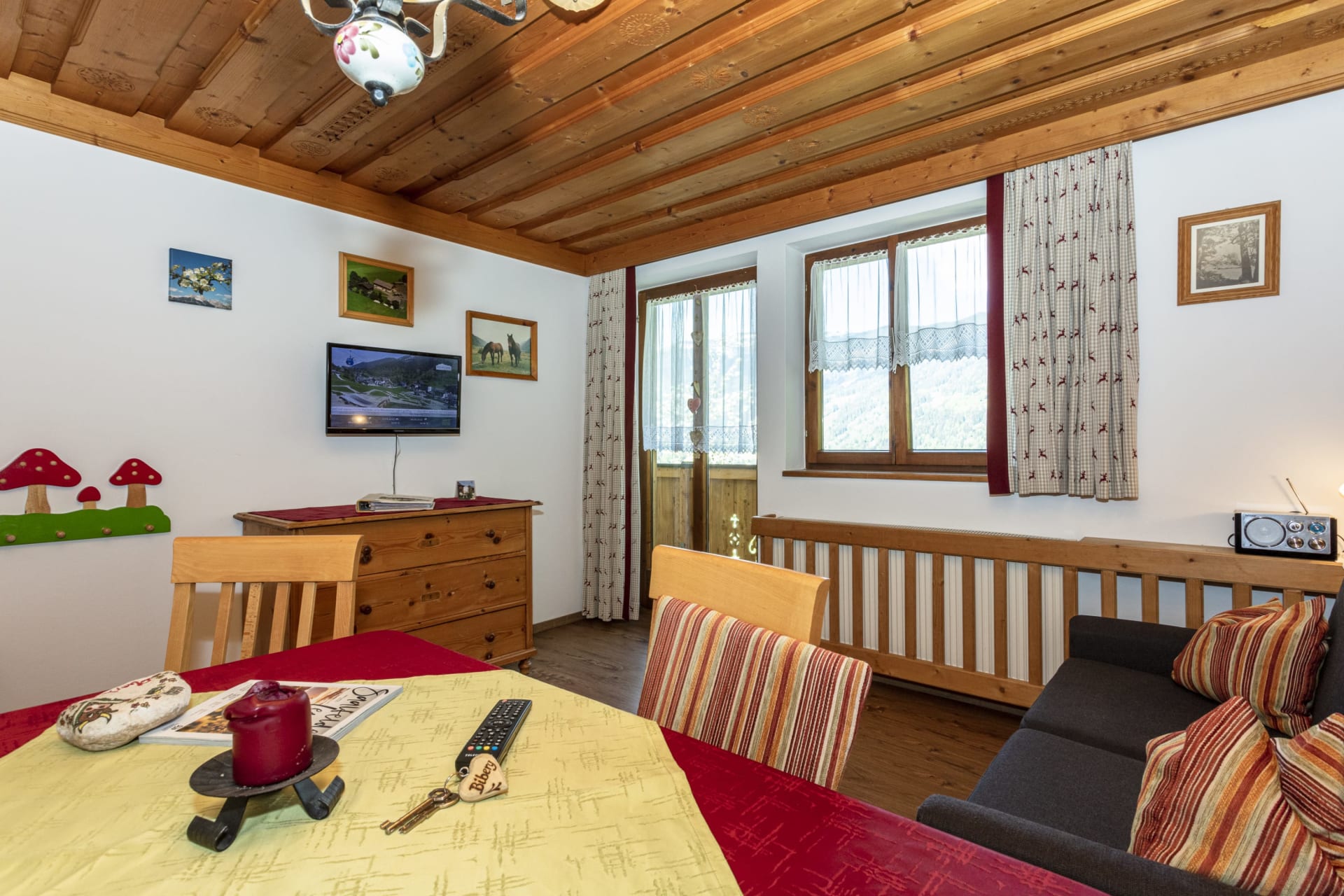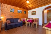 • 1 großem Wohnraum mit Couch, Essecke mit großem (ausziehbarem) Tisch, Kabel-TV, Radio und Balkon
