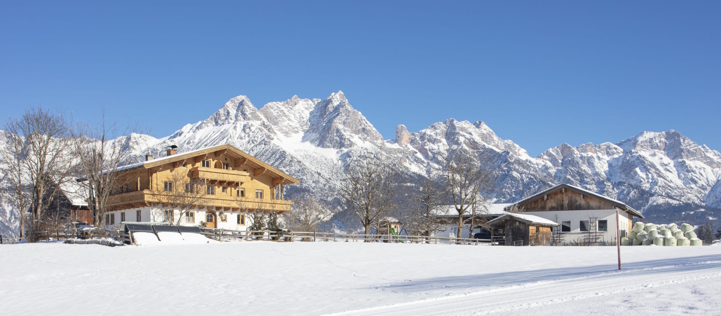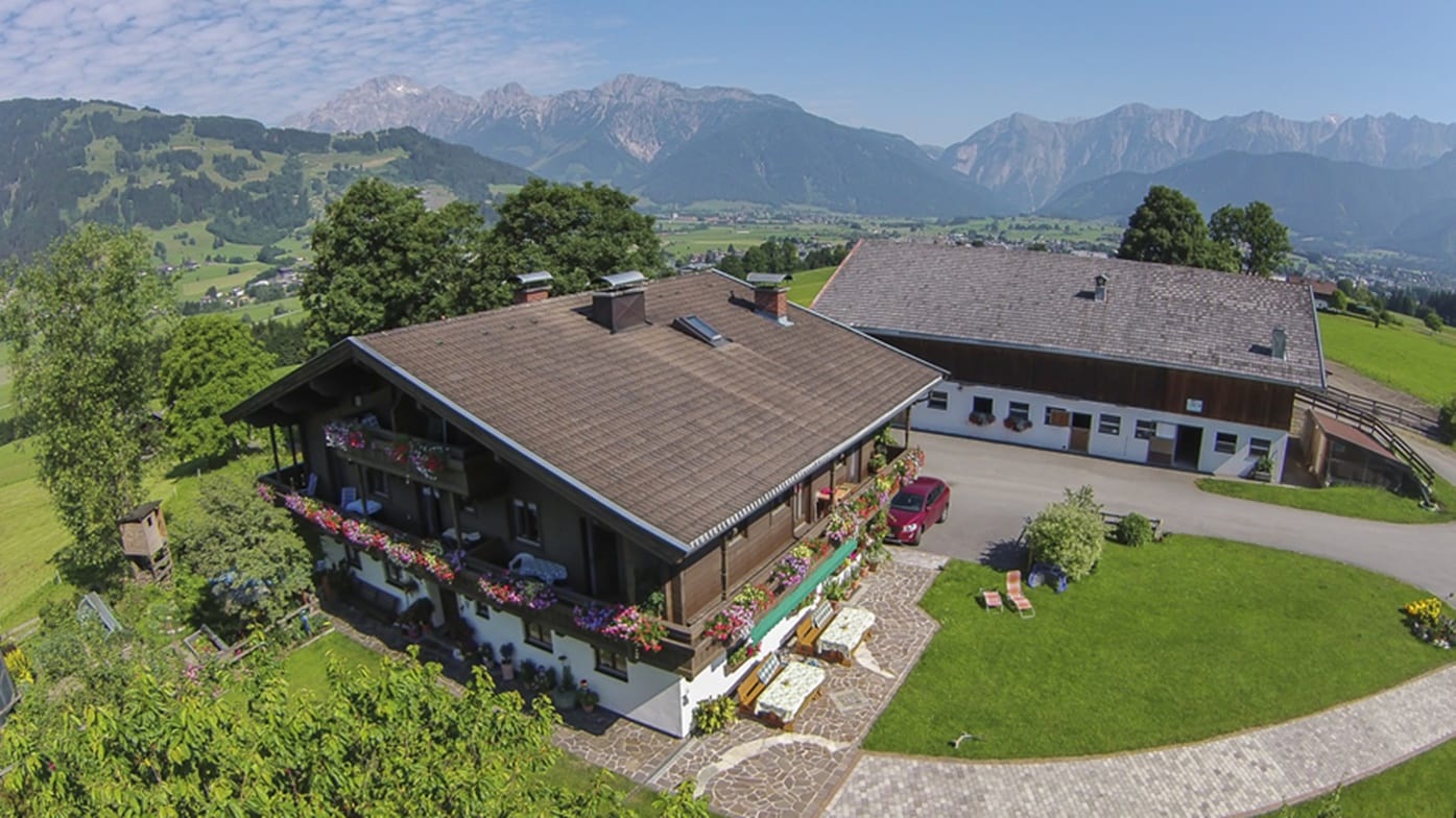 Unser Biobauernhof mit 2 gemütlichen Ferienwohnungen liegt inmitten des Saalfeldener Beckens auf einer kleinen Anhöhe und bietet ein herrliches Panorama auf die umliegenden Gebirgszüge.