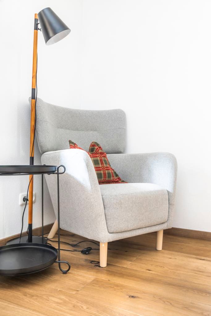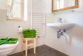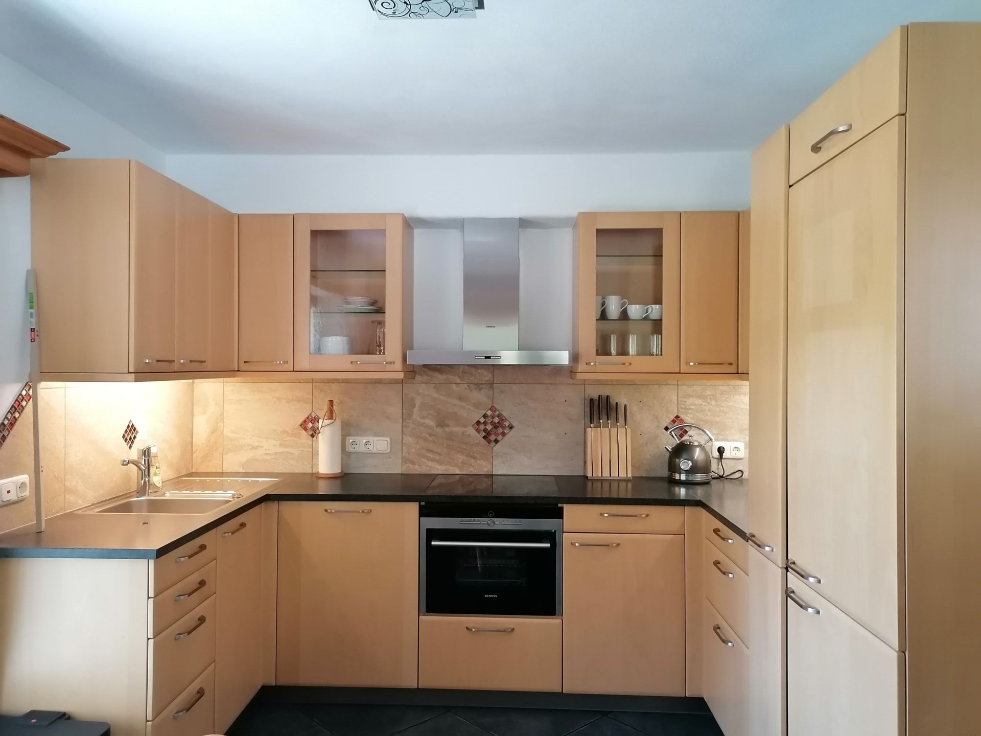 Schöne gemütlich Fewo mit Wohnküche, Balkon und Blick auf den Garten und die Wiesen. 1 Schlafzimmer mit einem Doppelbett und zwei Einzelbetten. Ein weiteres Schlafzimmer mit einem Doppelbett. Zwei separate Bäder mit Dusche und WC. Kinderbett möglich.