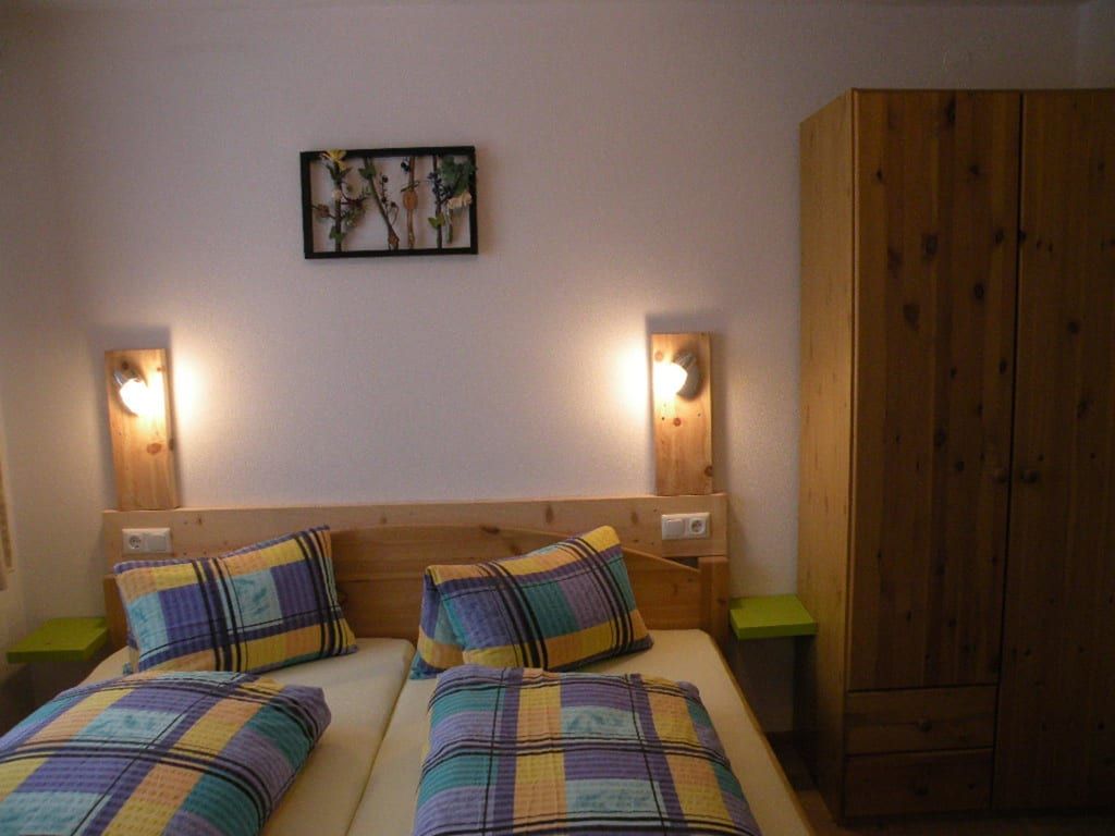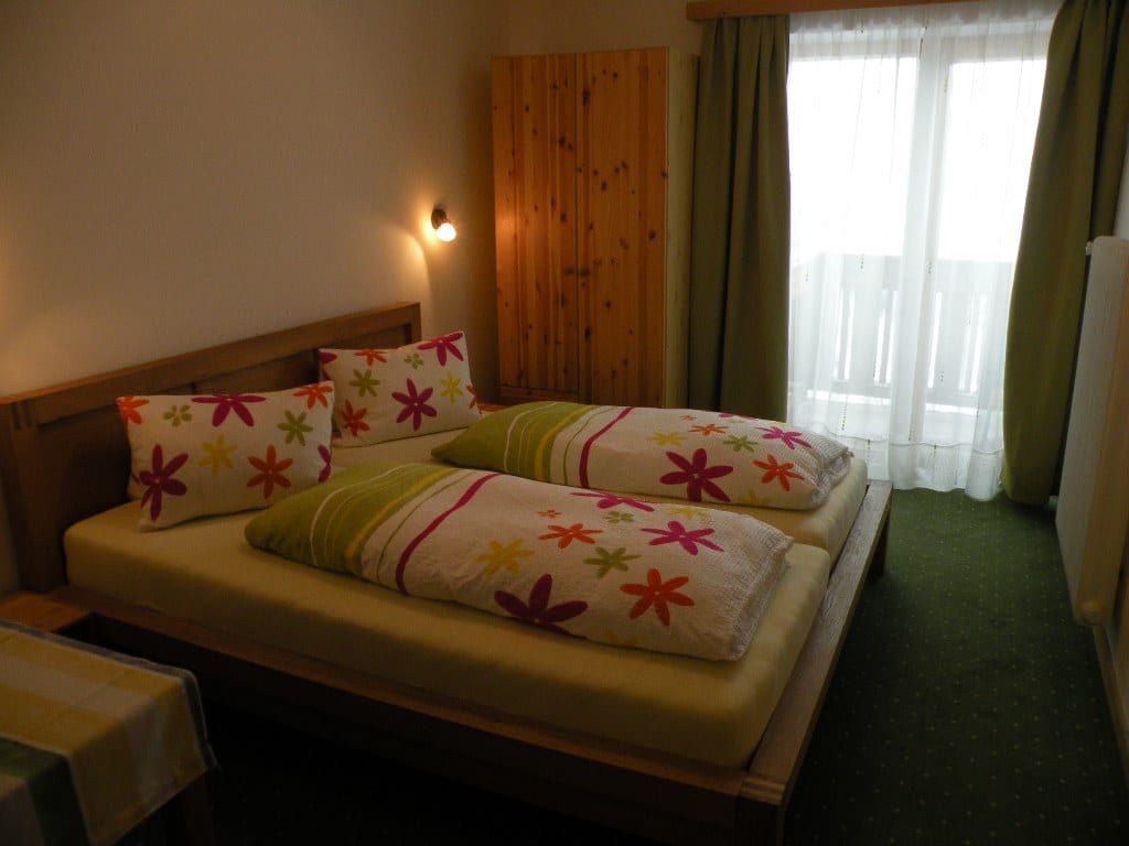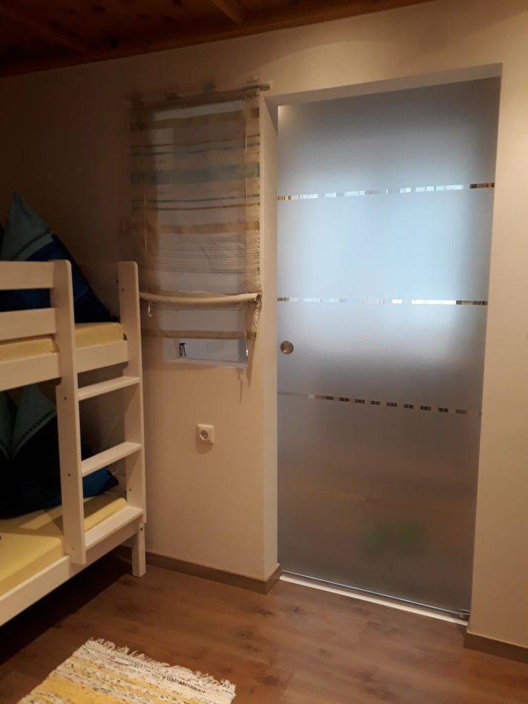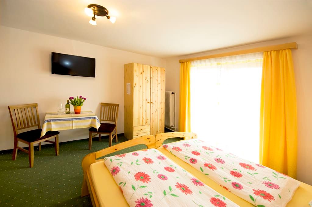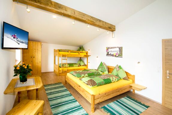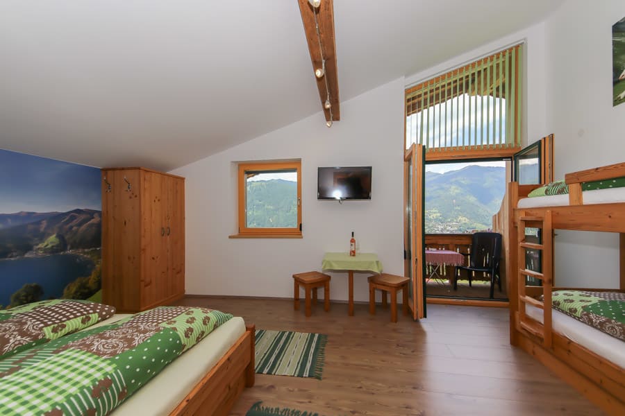 Ein großes Schlafzimmer mit Doppelbett und Etagenbett, Kasten, Sitzgelegenheit, TV und ein Balkon mit direktem Blick auf den Zeller See und die umliegenden Berge (Bettwäsche steht zur Verfügung).