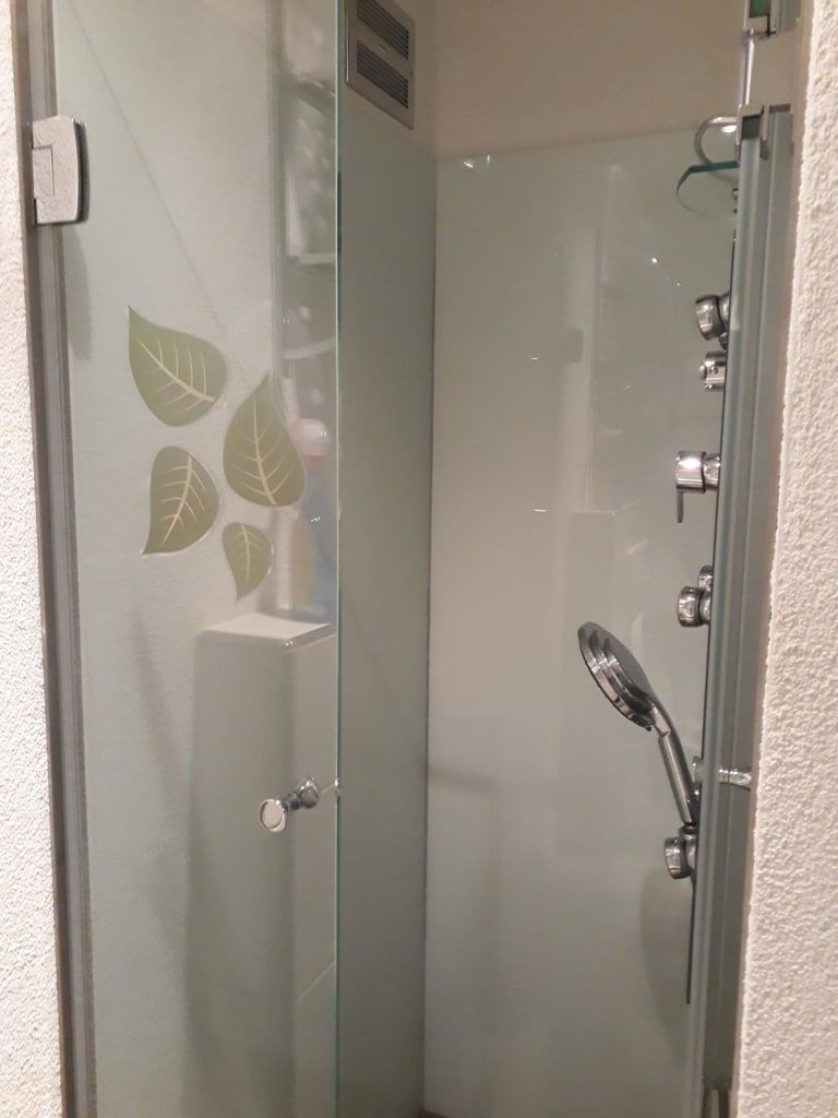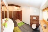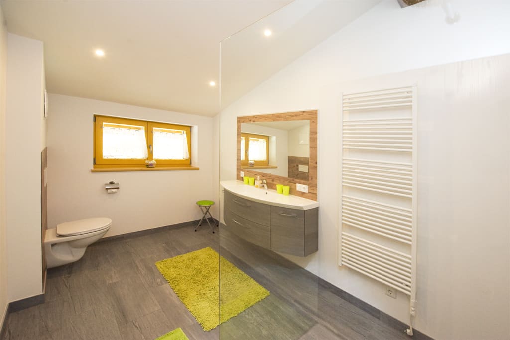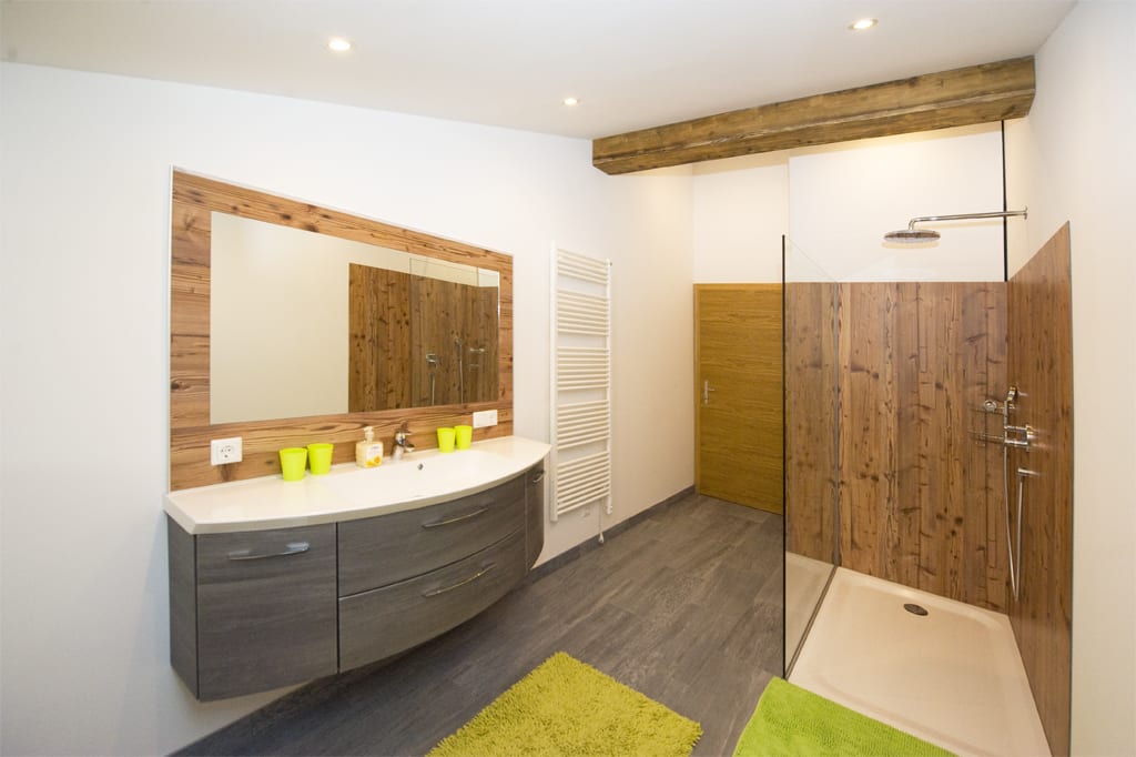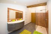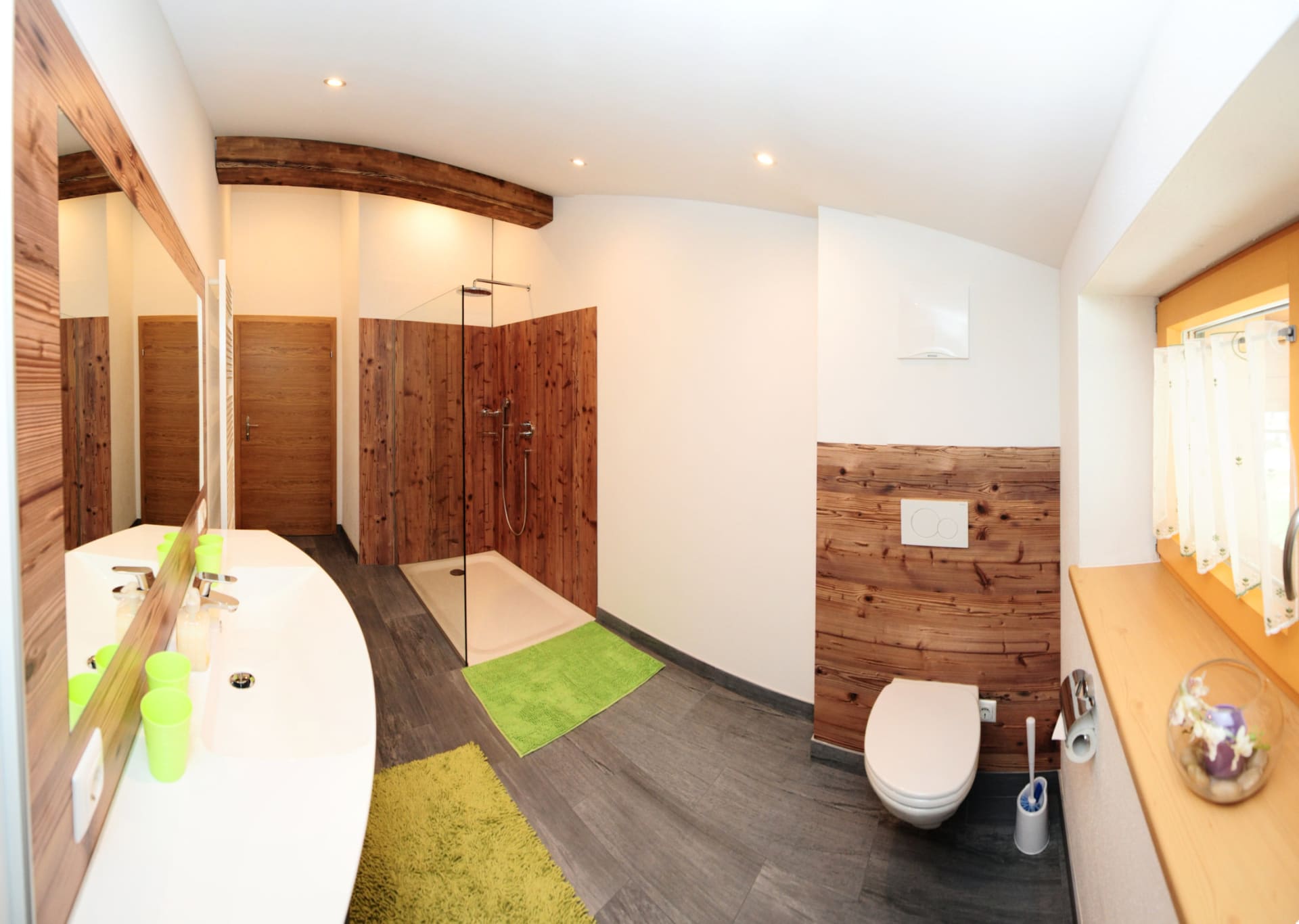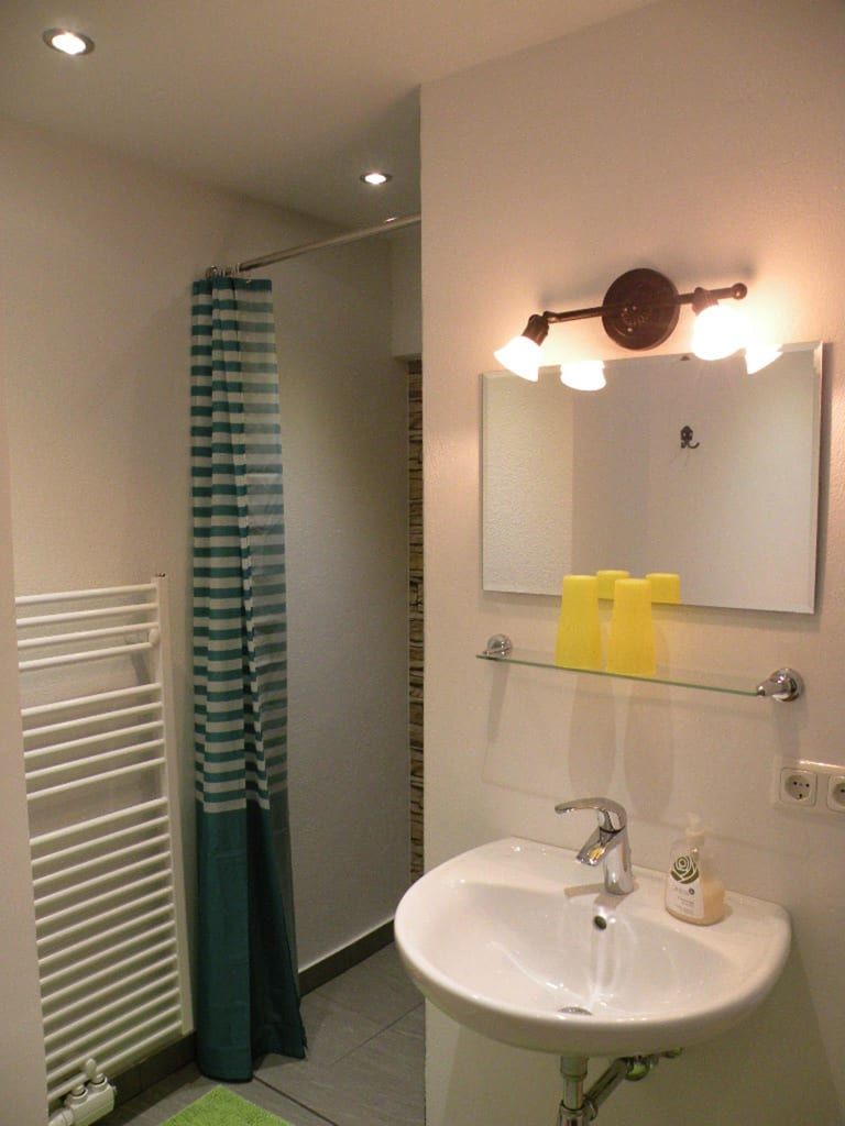 Ein großes Bad mit Waschtisch, großzügiger Dusche, WC, Handtuchtrockner und Föhn (Hand- und Badetücher stehen zur Verfügung).