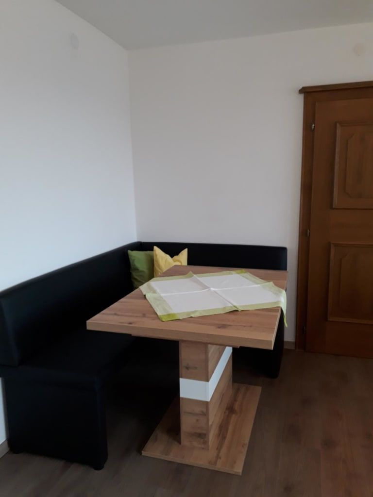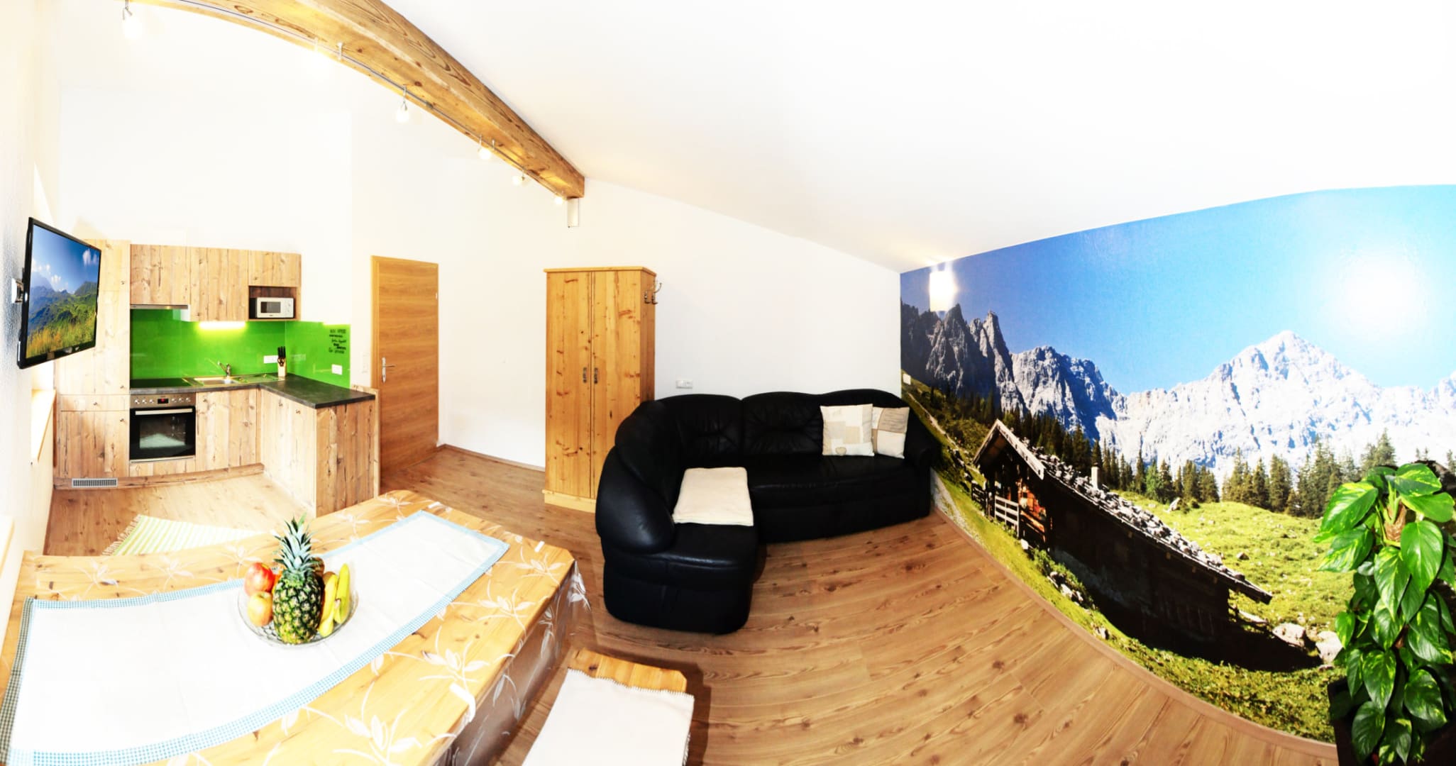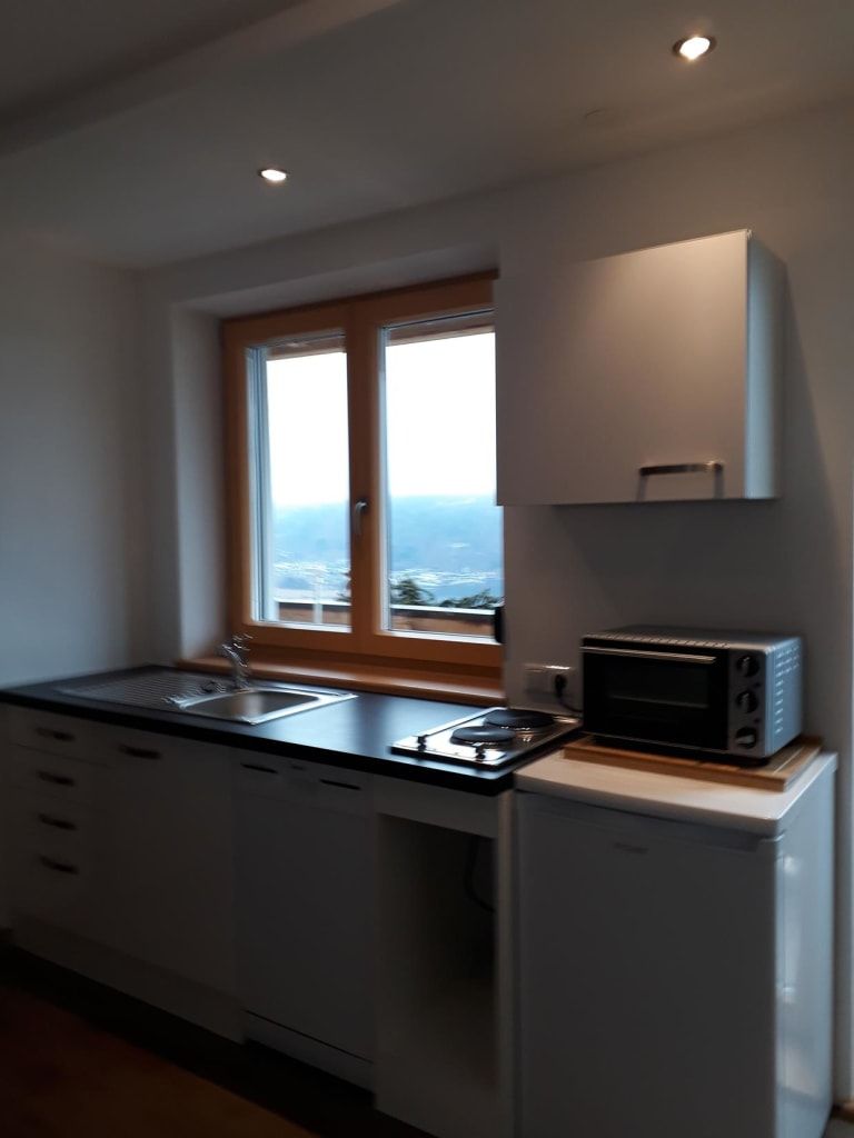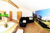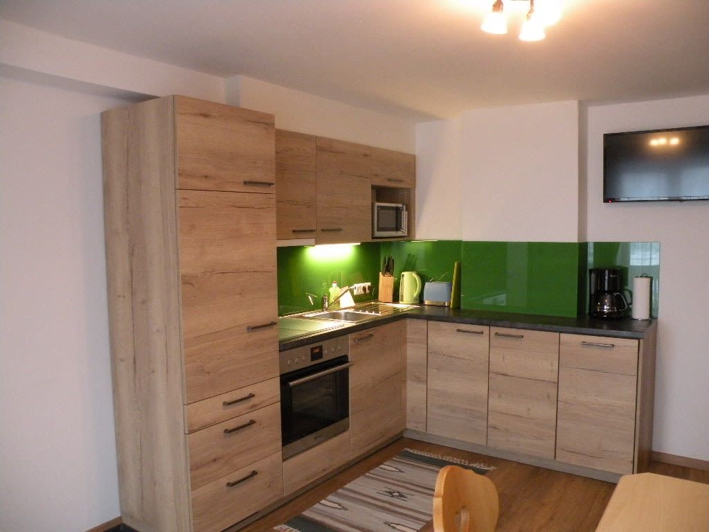 Eine Wohnküche mit einem Schlafsofa für 2 Personen, Esstisch, Kasten, TV, komplett ausgestatteter Küche mit Kühlschrank und Gefrierfach, Herdplatten und Backrohr mit Dunstabzug, Geschirrspüler, Mikrowelle, Kaffeemaschine, Wasserkocher, Ess- und Kochgeschirr und Kochutensilien.
