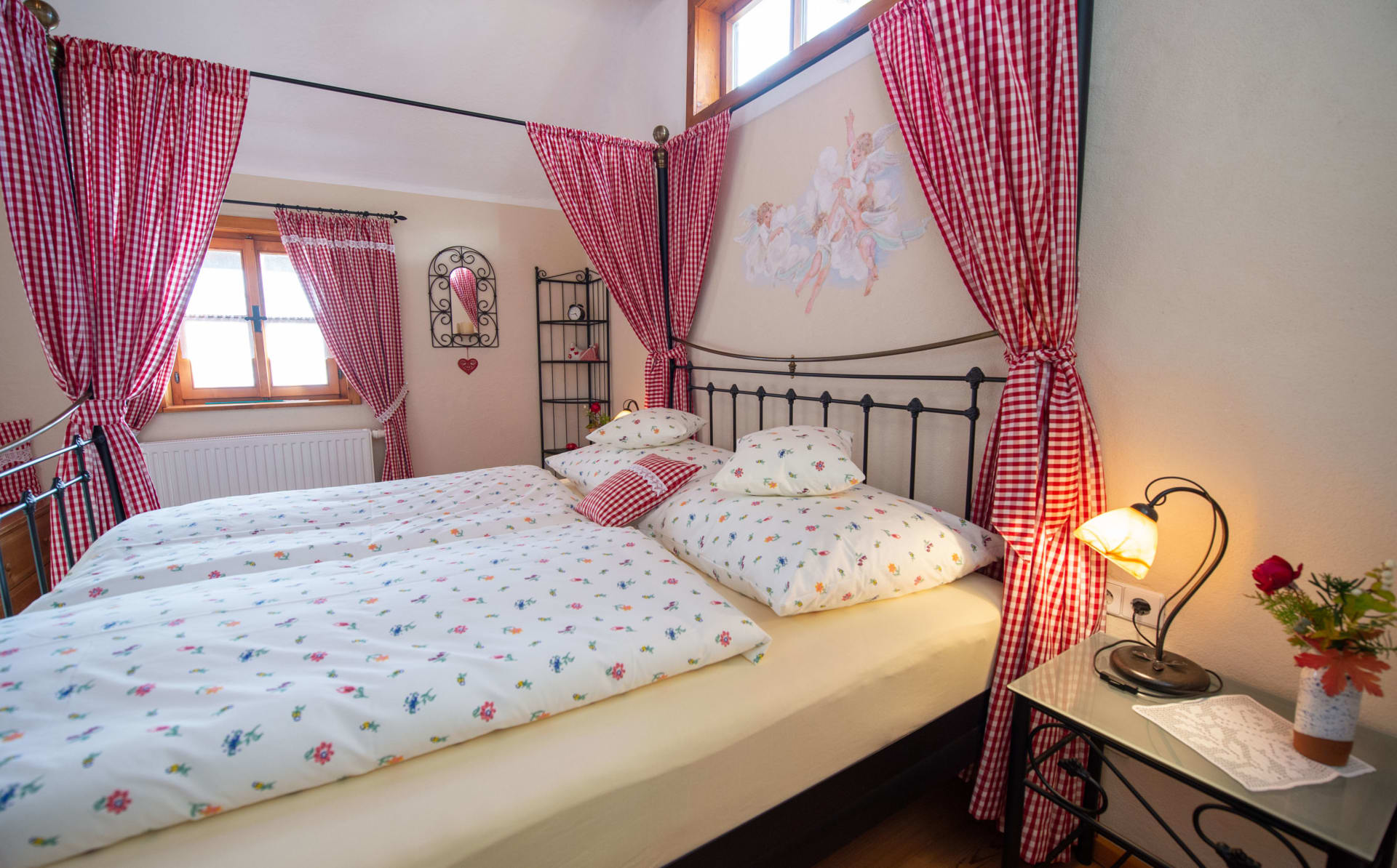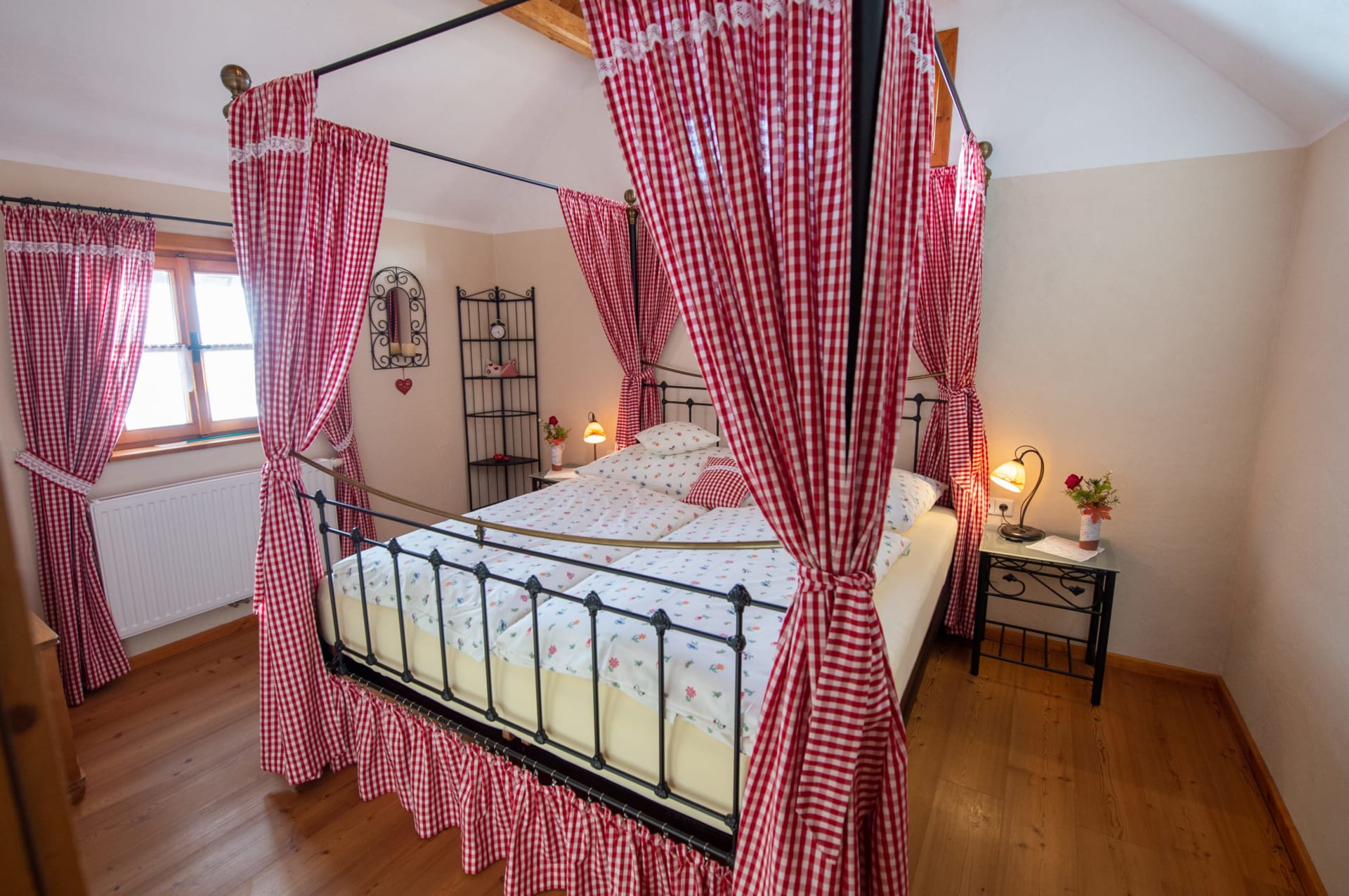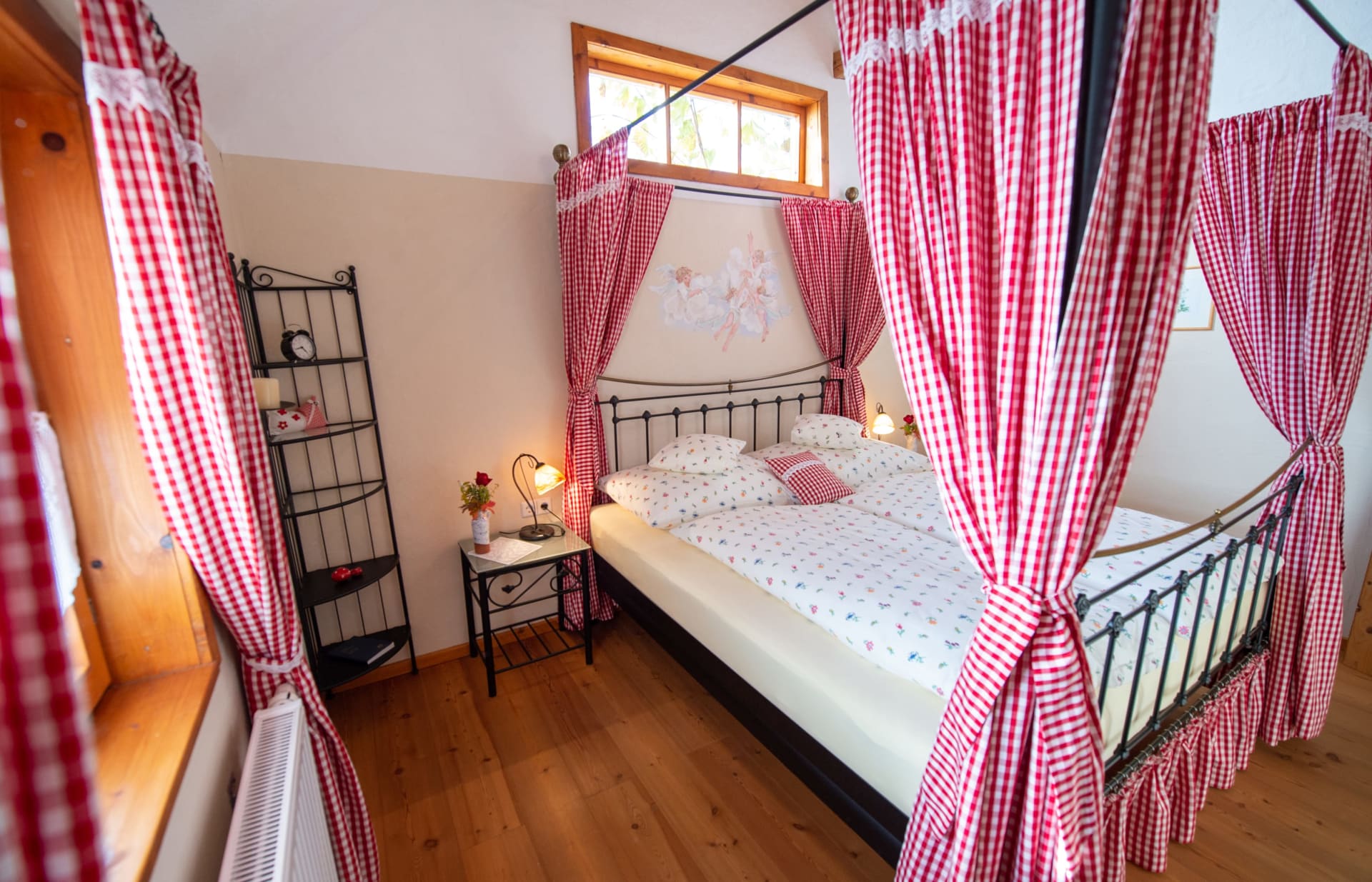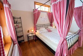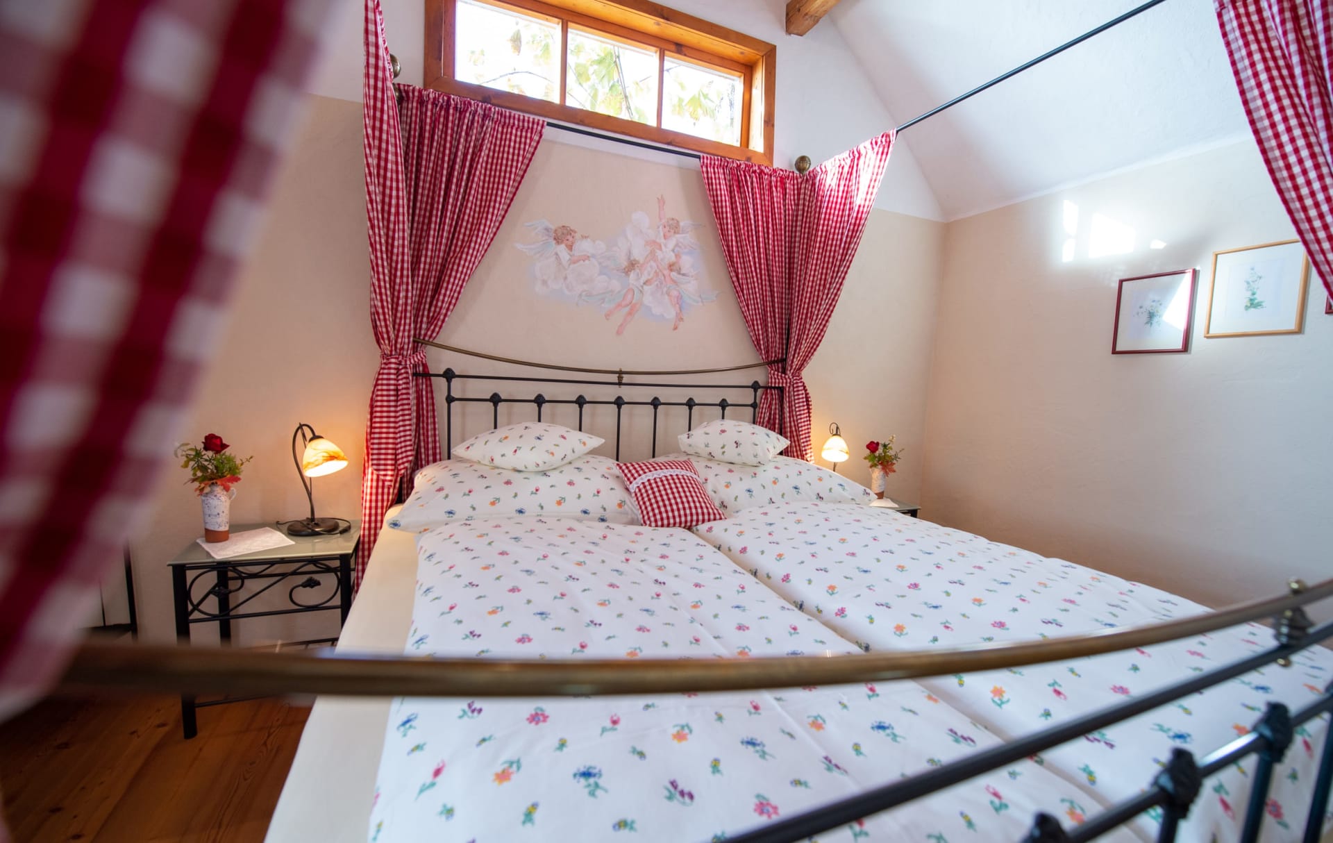 Im ersten Stock gibt es zwei getrennte Schlafräume, eines mit einem Stockbett und das zweite mit einem Himmelbett.