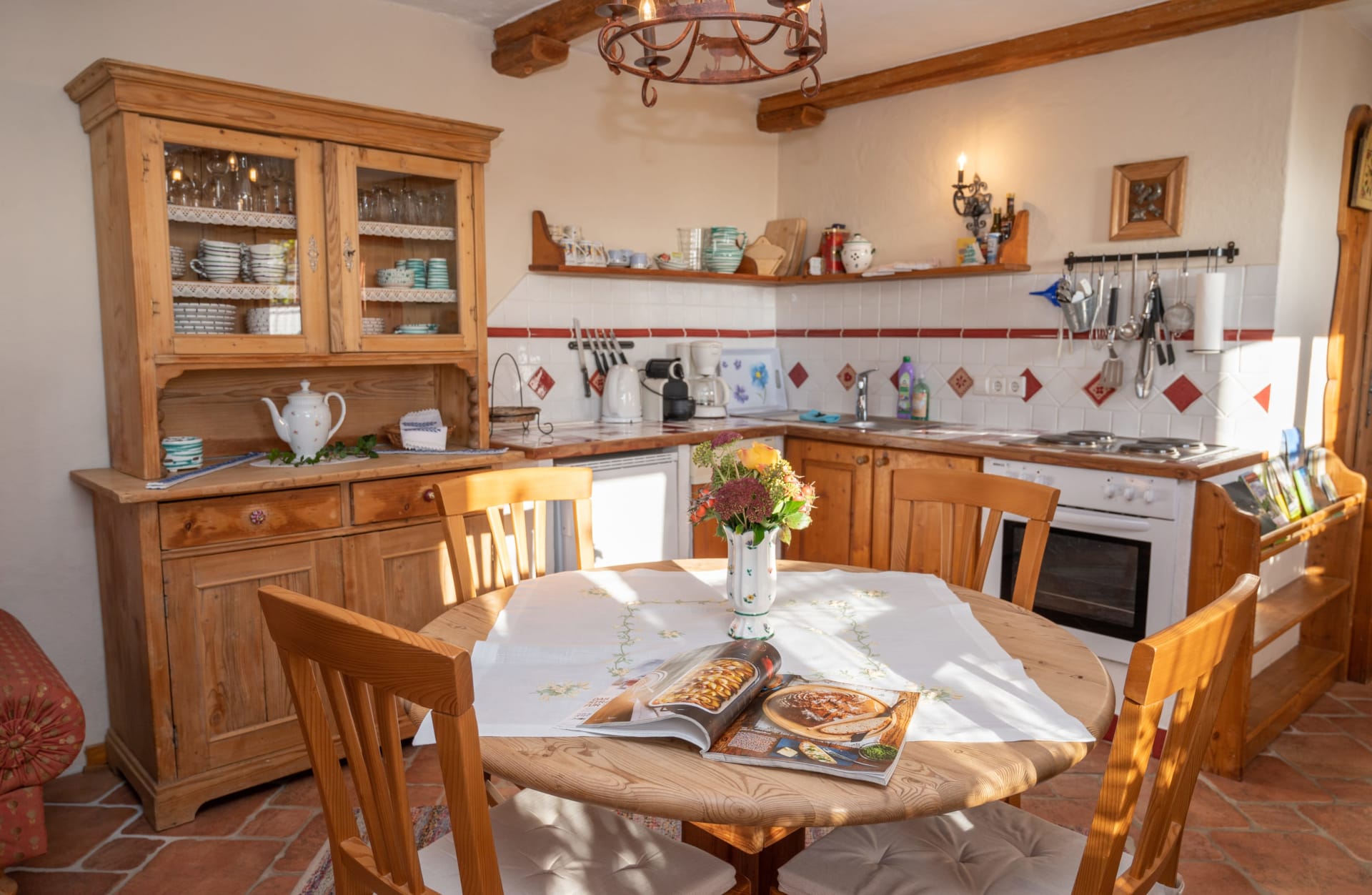 Unser Troadkasten wurde im Jahre 2006 mit viel Liebe renoviert. Er verfügt über eine geräumige Wohnküche mit Heizkamin und einer gemütlichen Knotzecke. Die Küche ist auch mit E-Herd , Geschirrspüler und Kaffeemaschine ausgestattet.