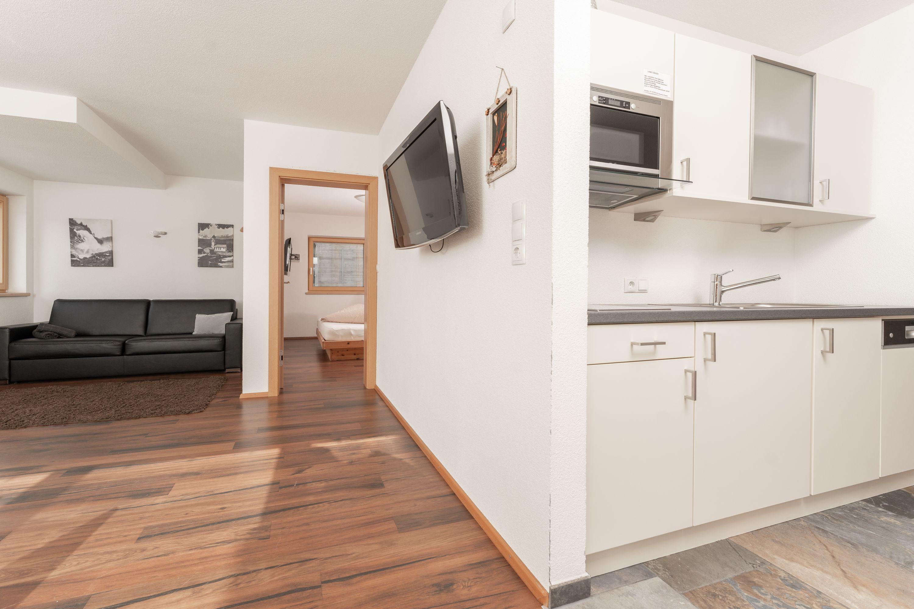 Wohlfühlplatz auf 49 m²: 1 Schlafraum mit Zirbenholz-Doppelbett, FlatTV, Bad mit DU/WC, großer Wohnraum mit Sitzecke und Schlafsofa (für 2 Kinder), Kitchenette und Balkon.