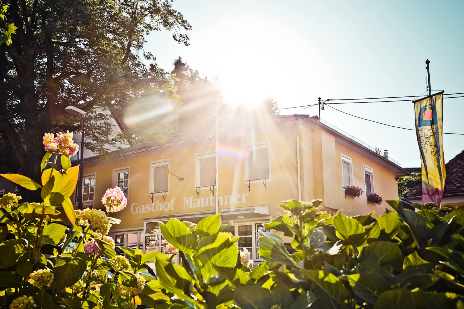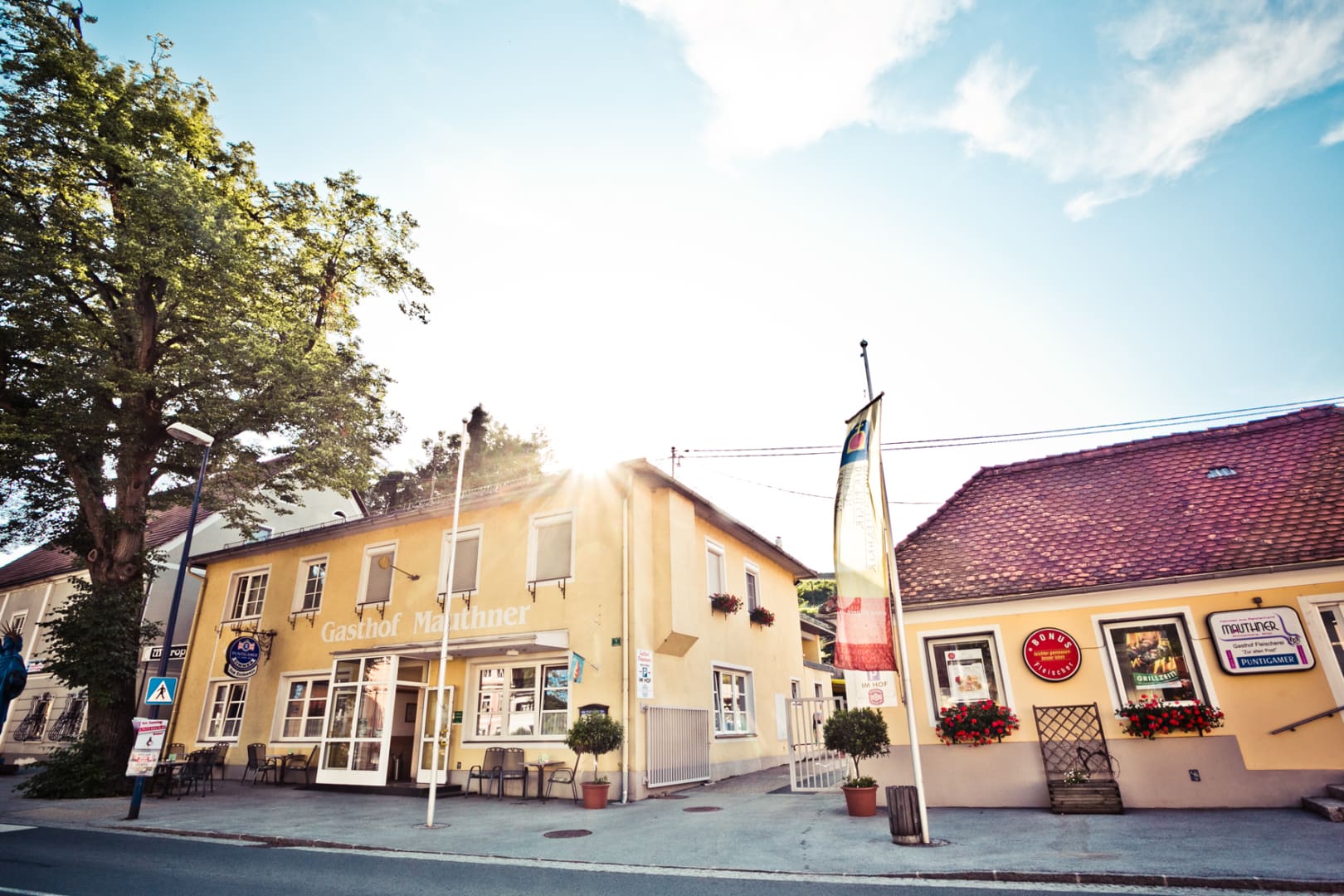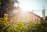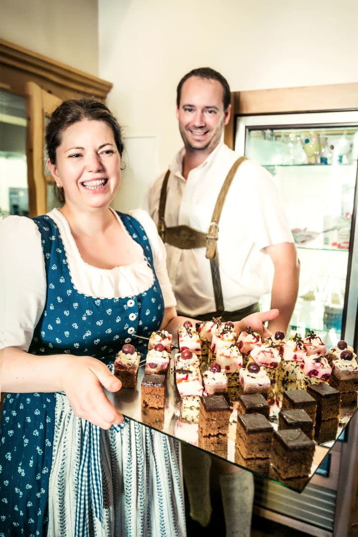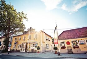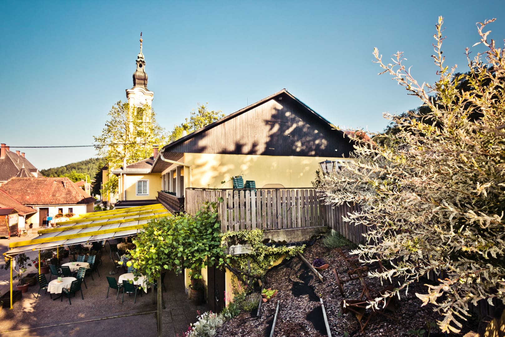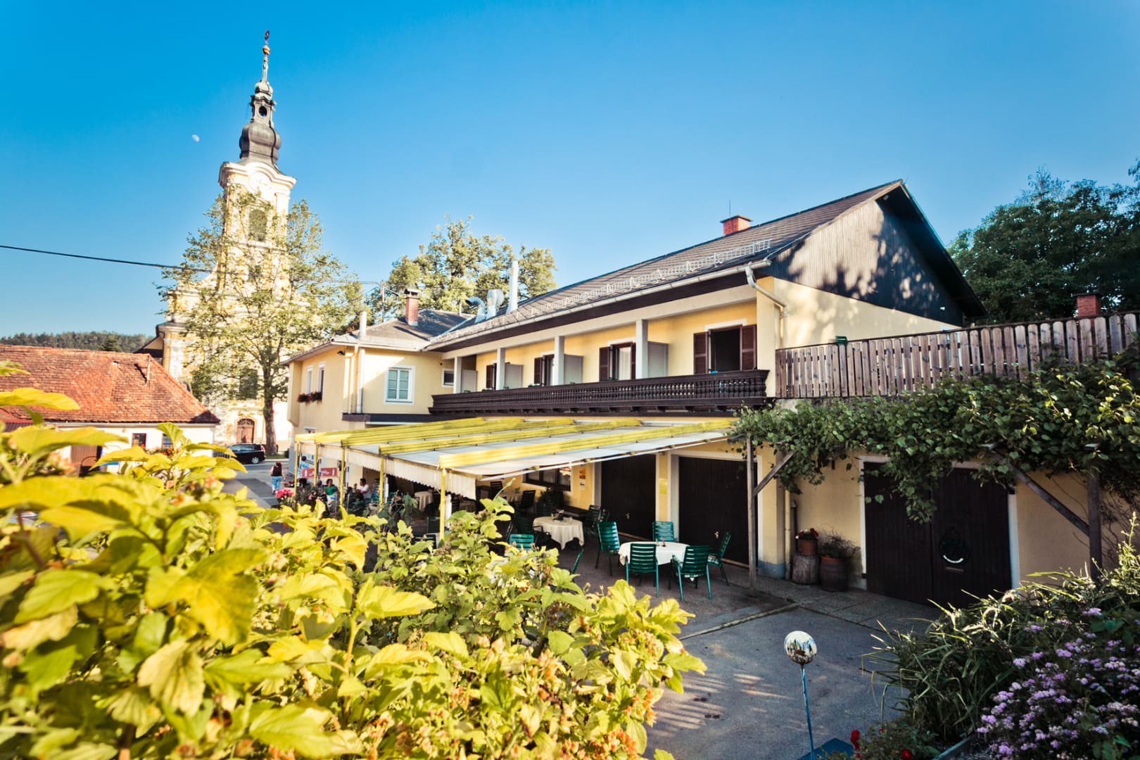 Am Marktplatz direkt gegenüber der mächtigen barocken Wallfahrtskirche Zum gegeißtelten Heiland auf der Wies gelegen, trägt das Haus seit Generationen zu Recht den Beinamen Kirchenwirt.