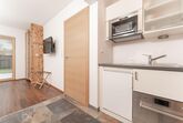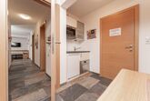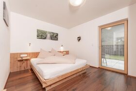 Wohlfühlplatz auf 25 m². Die Einraumsuite verfügt über 1 Schlafraum mit Zirbenholz-Doppelbett, Badezimmer mit DU/WC, Schreibtisch mit Sitzgelegenheit, Kitchenette und direktem Zugang zur Garten-Terrasse.
