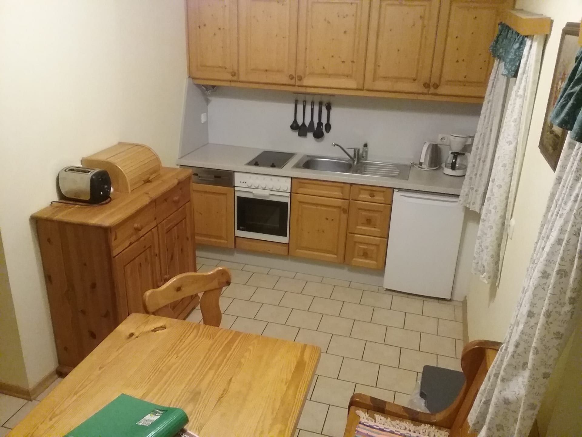 Küche ist ausgestattet mit E-Herd, Backrohr, Kühlschrank, Geschirrspüler, Kaffeemaschine und ausreichend Geschirr.
