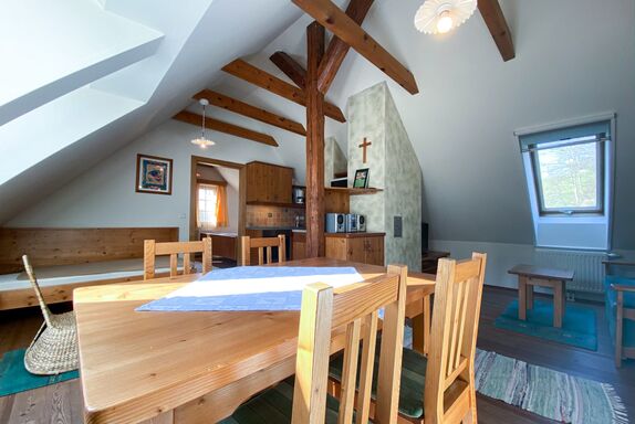 Gemütliche helle Dachgeschoßwohnung mit 1 Schlafzimmer mit Doppelbett, 1 Wohnraum mit Ausziehcouch und Einzelbett, Sitzecke, Kochnische, Sat-TV, Hifi-Anlage, ADSL-Internetanschluss, Vollholzmöbel, Bad mit Badewanne, WC extra