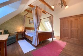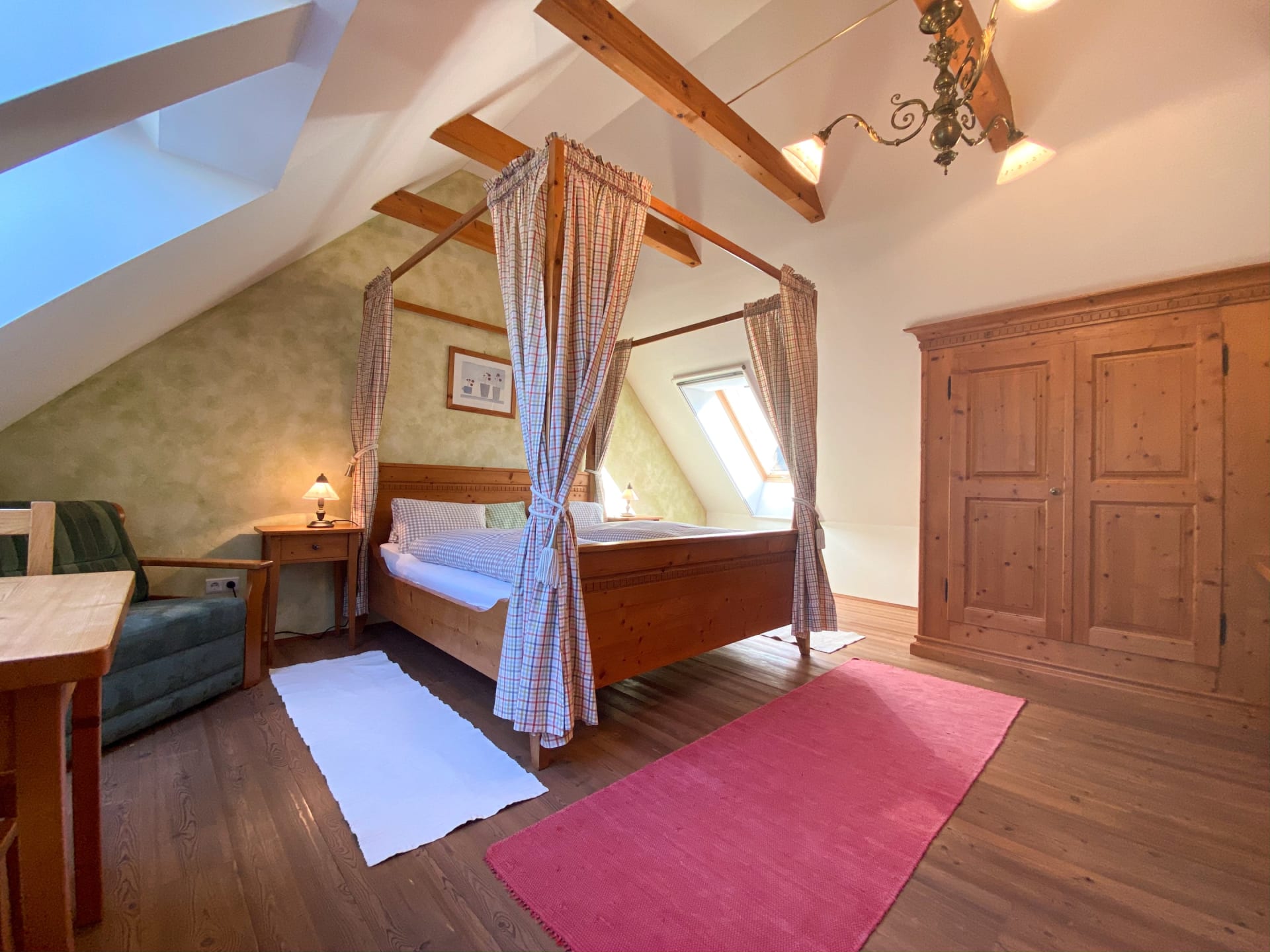 Helles Doppelzimmer mit Himmelbett im 1. Stock-Dachgeschoss, Zusatzbett für 3. Person, Vollholzmöbel, Lärchenboden geölt, Sat-TV, Hifi-Anlage, Internetzugang.