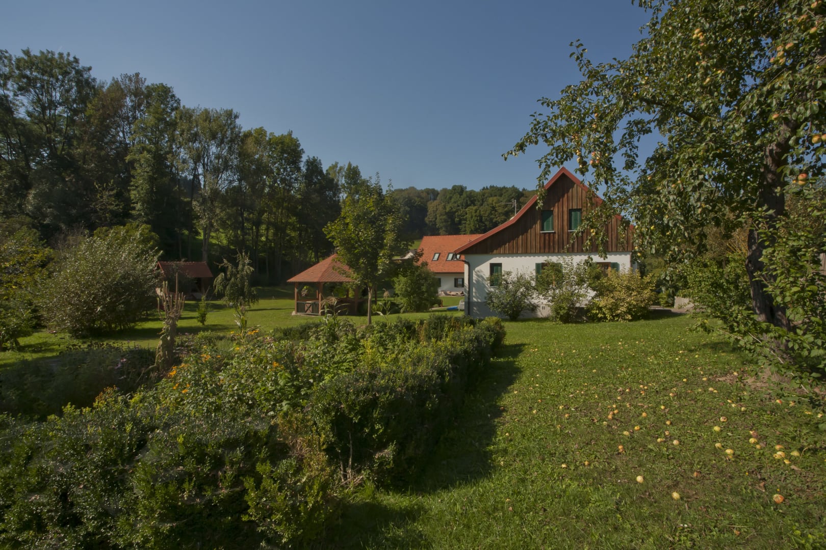 Unsere beiden Ferienhäuser im Weingarten. Das Weinberg, das traditionelle Kellerstöckl und das Nussberg das moderne Ferienhaus im Weingarten. Von dort haben Sie einen wunderbaren Ausblick ins breite Raabtal mit seinen Mais- u. Kürbisäckern, auf den gegenüberliegenden Weinberg und bis zur mächtigen Riegersburg.