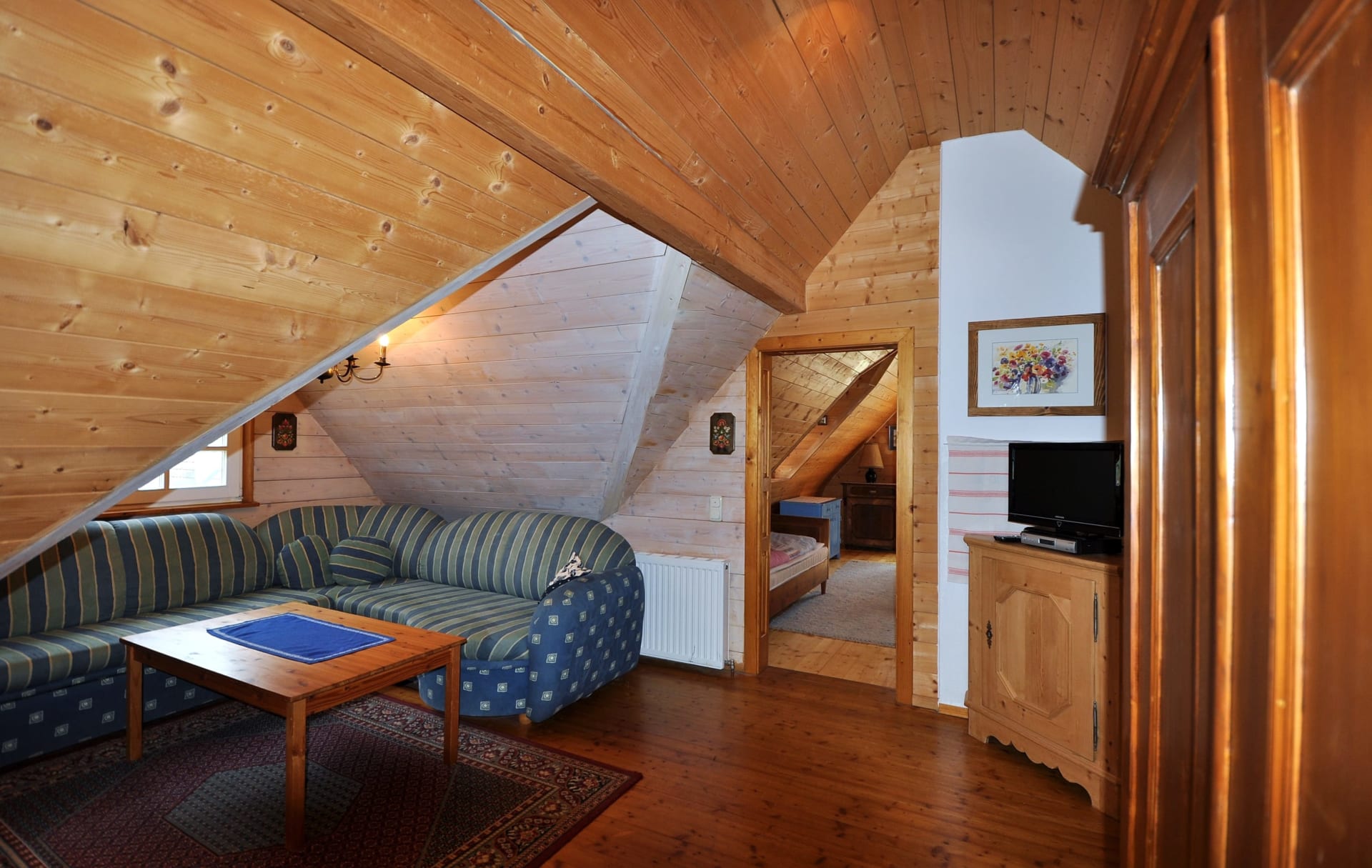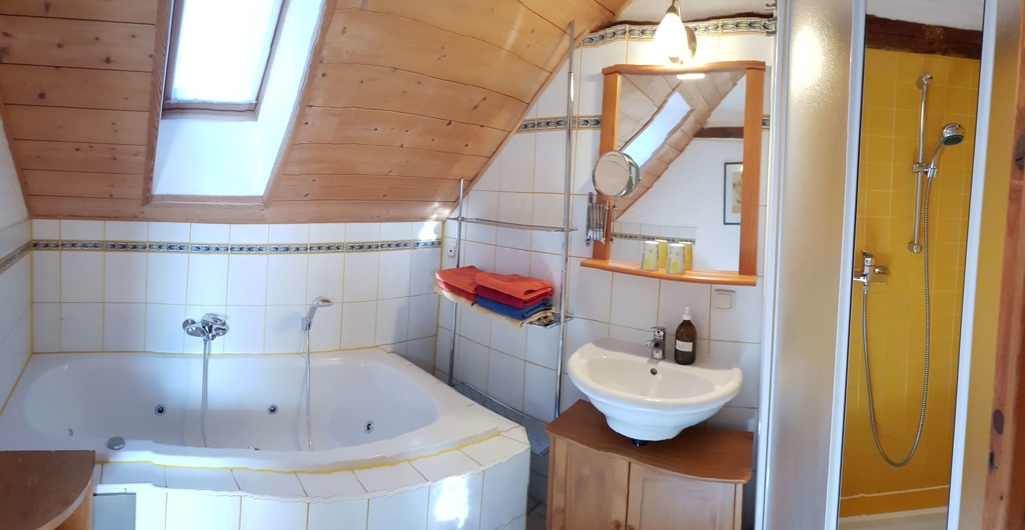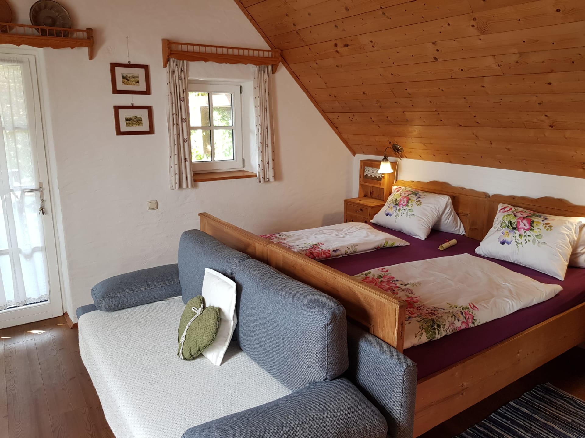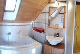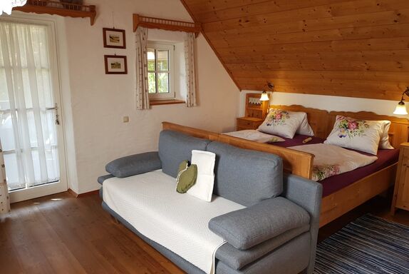 Schöne Ferienwohnung im Dachgeschoss für 2 Erwachsene und 1 Kind. Großer, überdachter und windgeschützter Balkon mit direktem Abgang in den großen Naturgarten. Komplett eingerichtetes Einraum-Apartment mit Doppelbett, Schlaf-Sofa, Küchenzeile, Bad mit Dusche und Massagewanne, WC extra. NEU: Klimaanlage