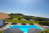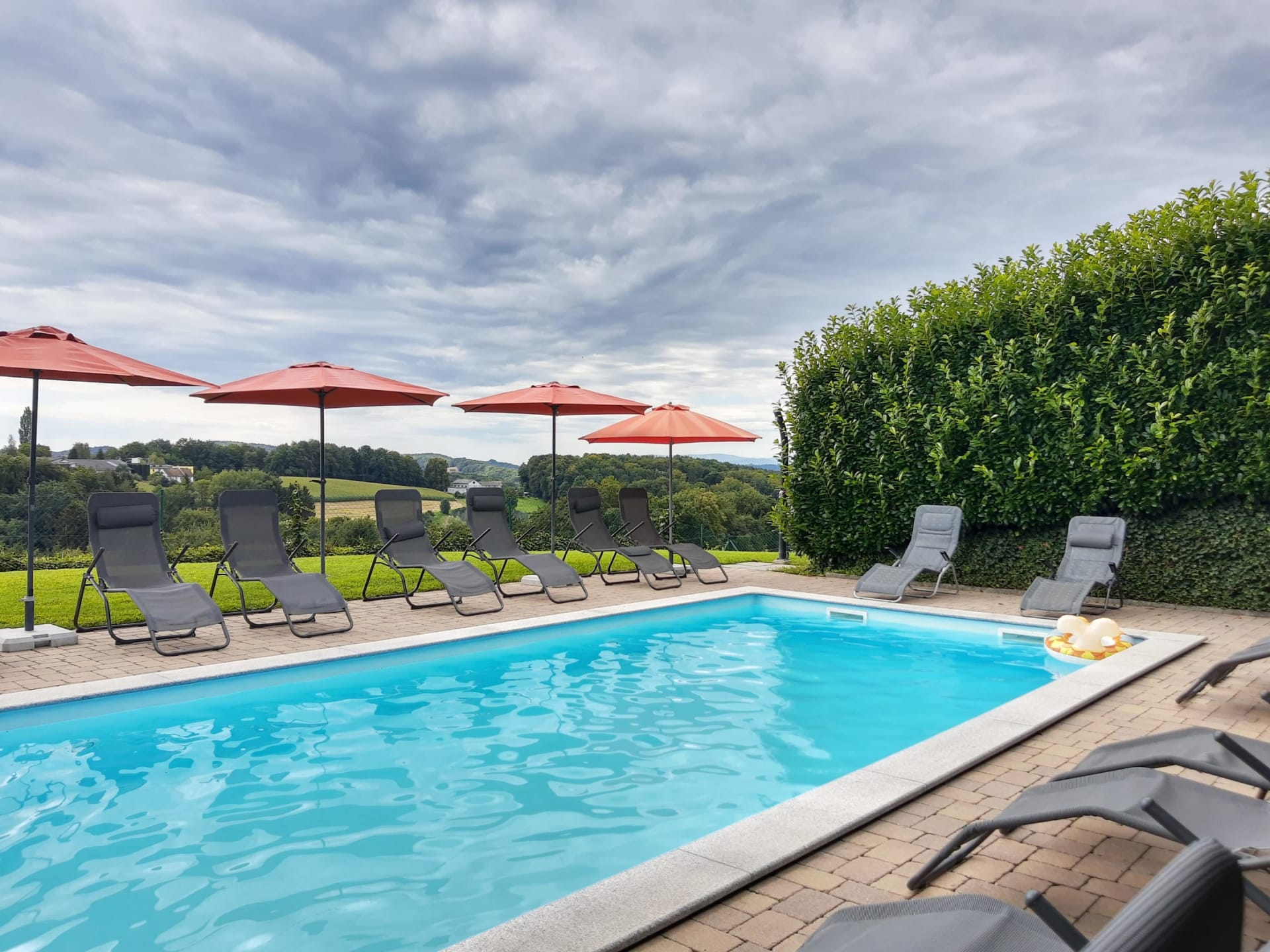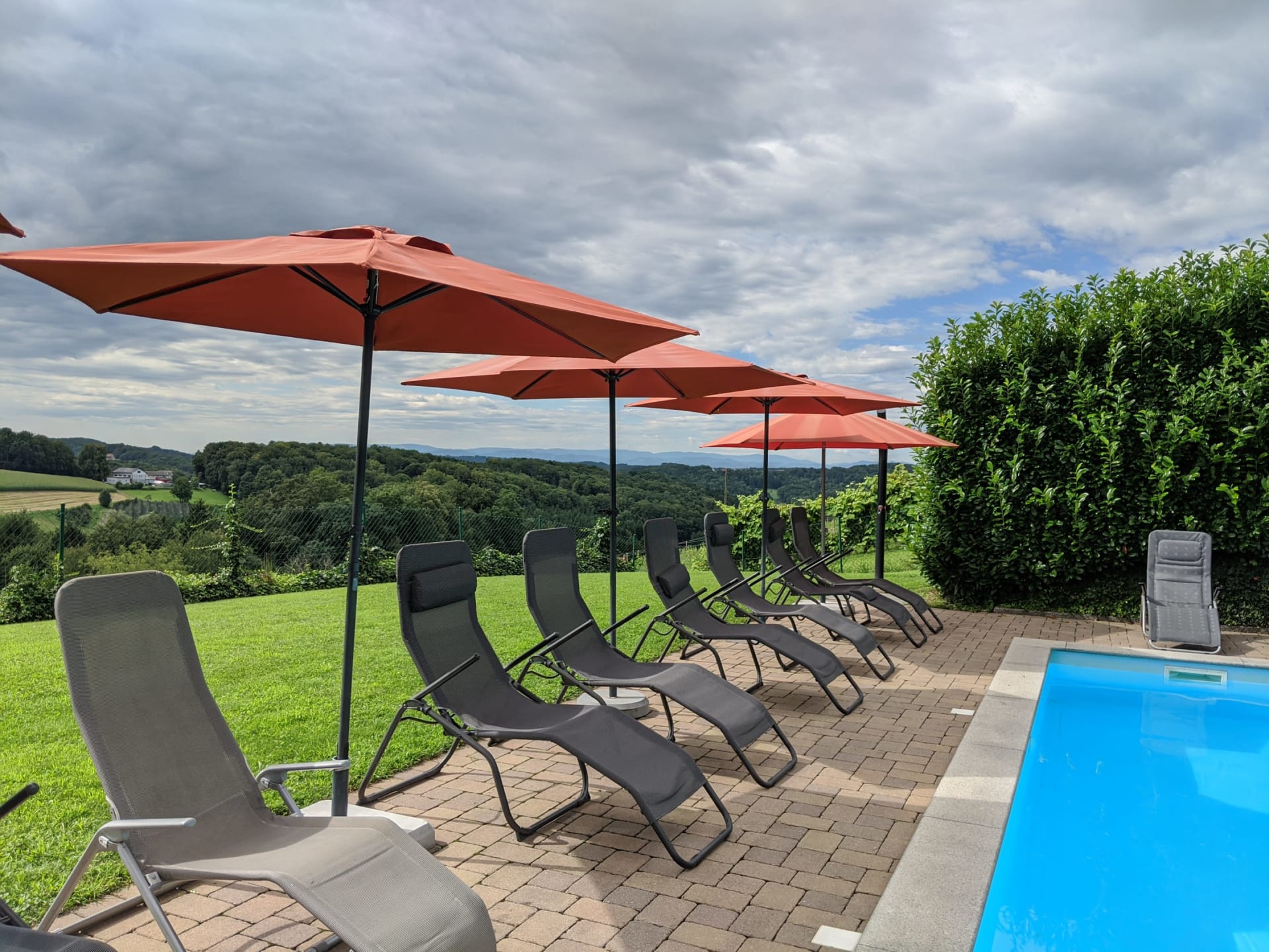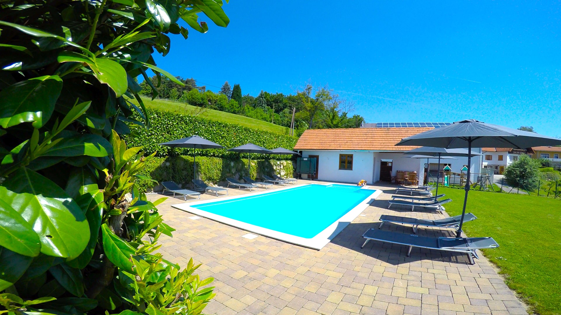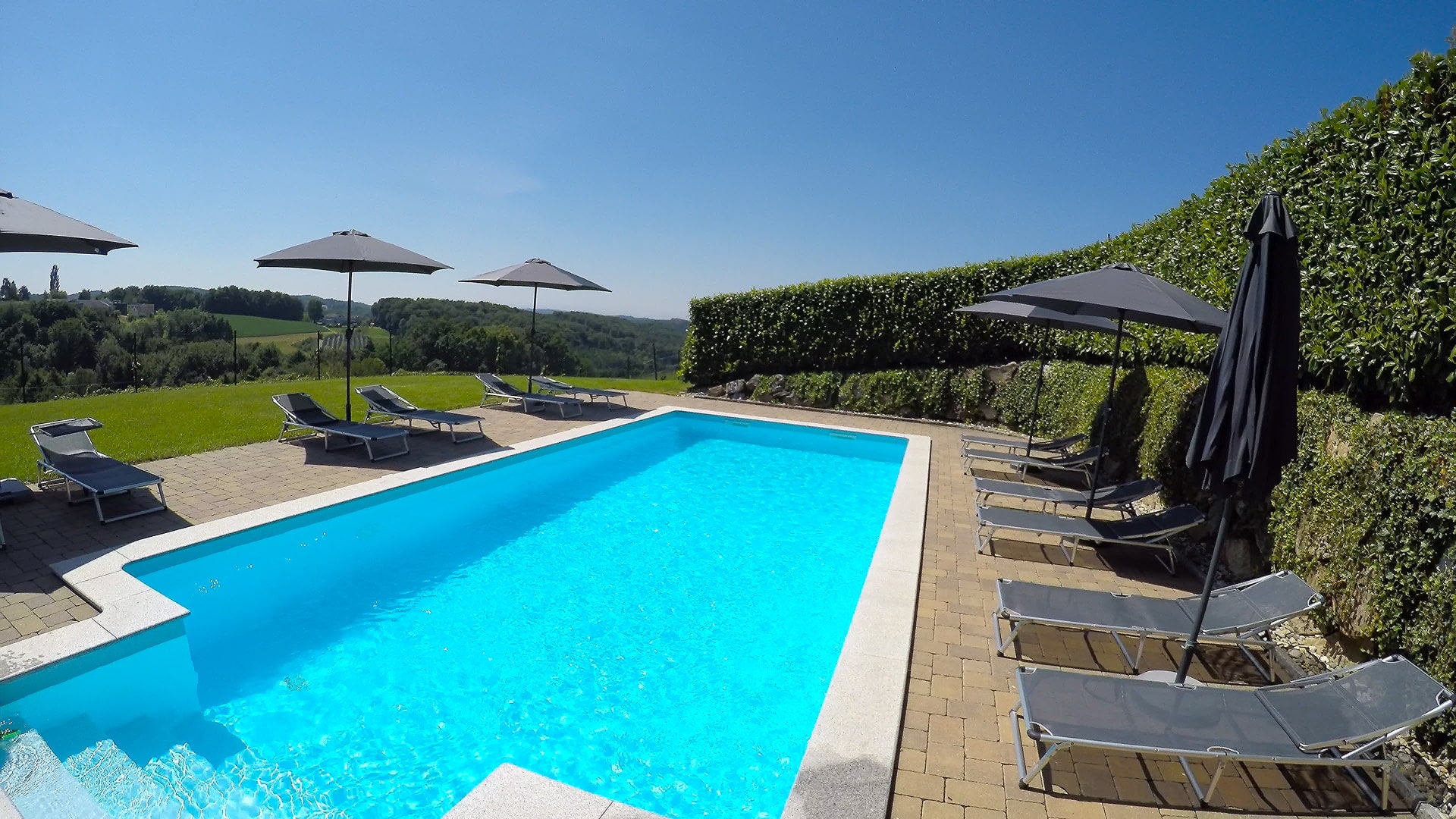 • Swimmingpool mit schöner Liegewiese, Liegestühlen und Sonnenschirme