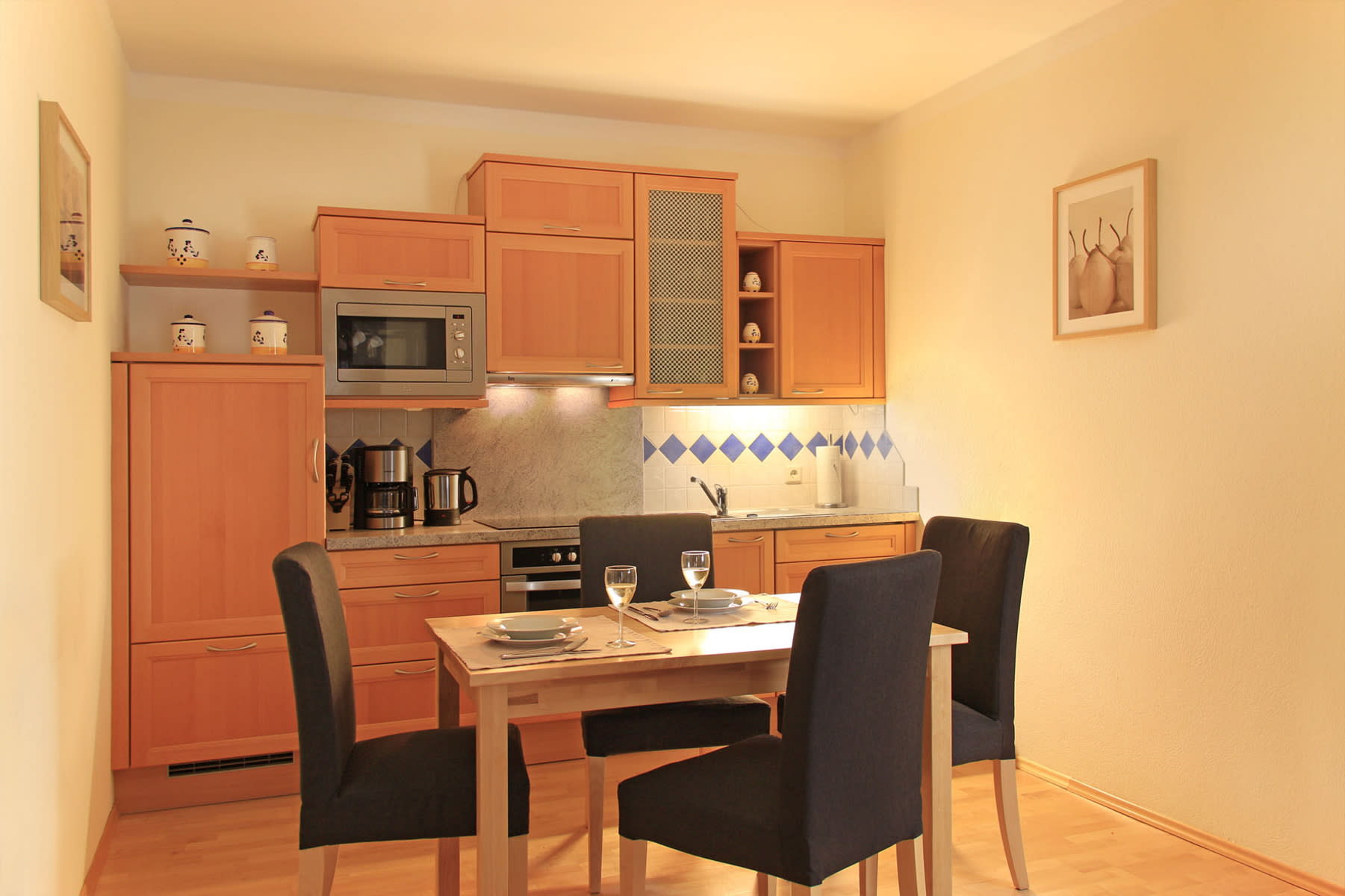 Die Ferienwohnungen verfügen über einen Vorraum mit Garderobe, Bad, WC, Doppelbettzimmer, komplett eingerichtete Einbauküche, Essbereich, der Wohnbereich verfügt über ein exklusives Ausziehsofa (Schlafplatz für 1 weitere Person), SAT-TV, Hifi. Jede Ferienwohnung verfügt über eine eigene Terrasse mit Grillmöglichkeit und bequemer Sitzgarnitur.