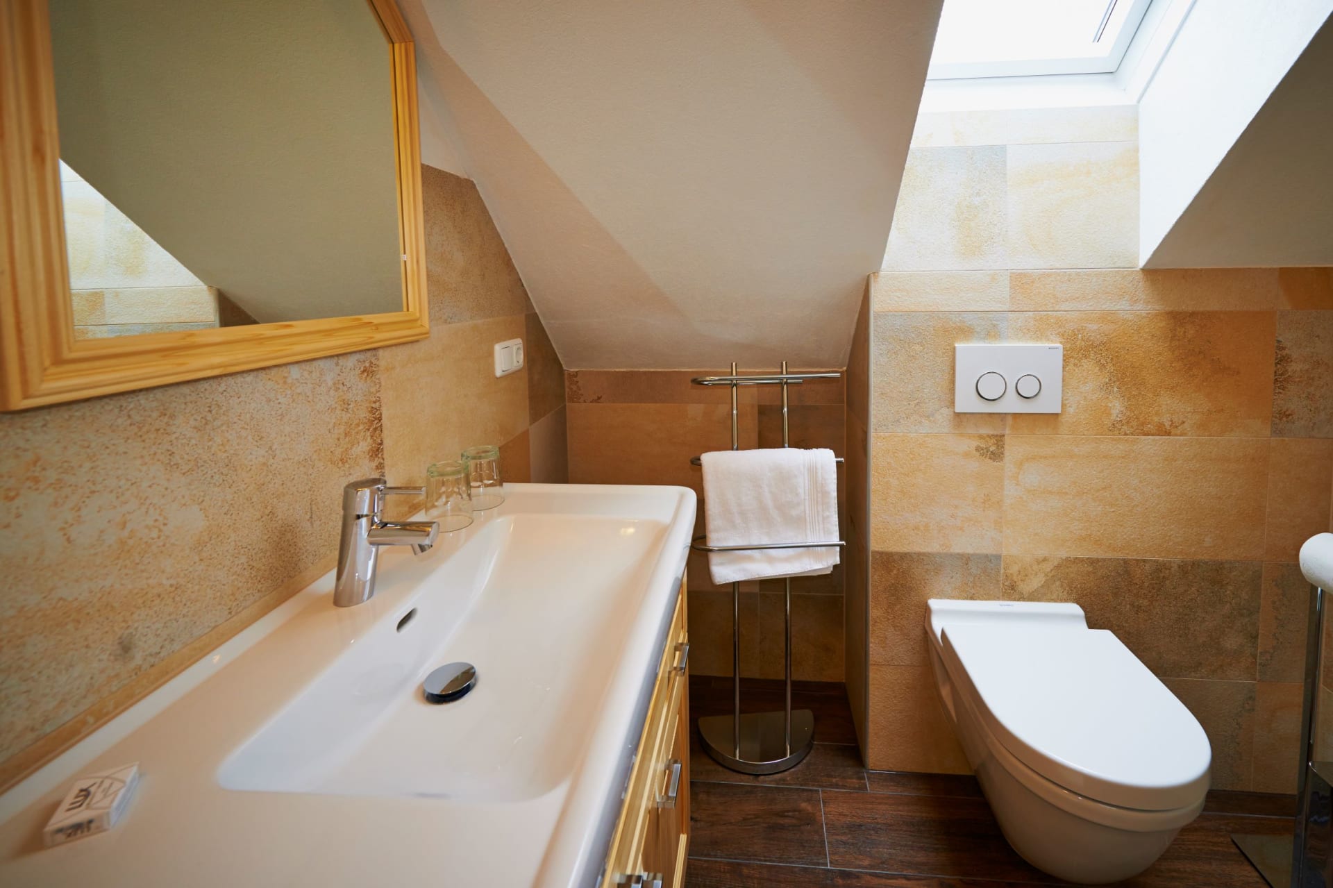 Das Zimmer ist mit einem Doppelbett und modernem Bad mit Dusche und WC ausgestattet. Ein Flachbild-Fernseher und eine Klimaanlage sind ebenfalls im Zimmer.
