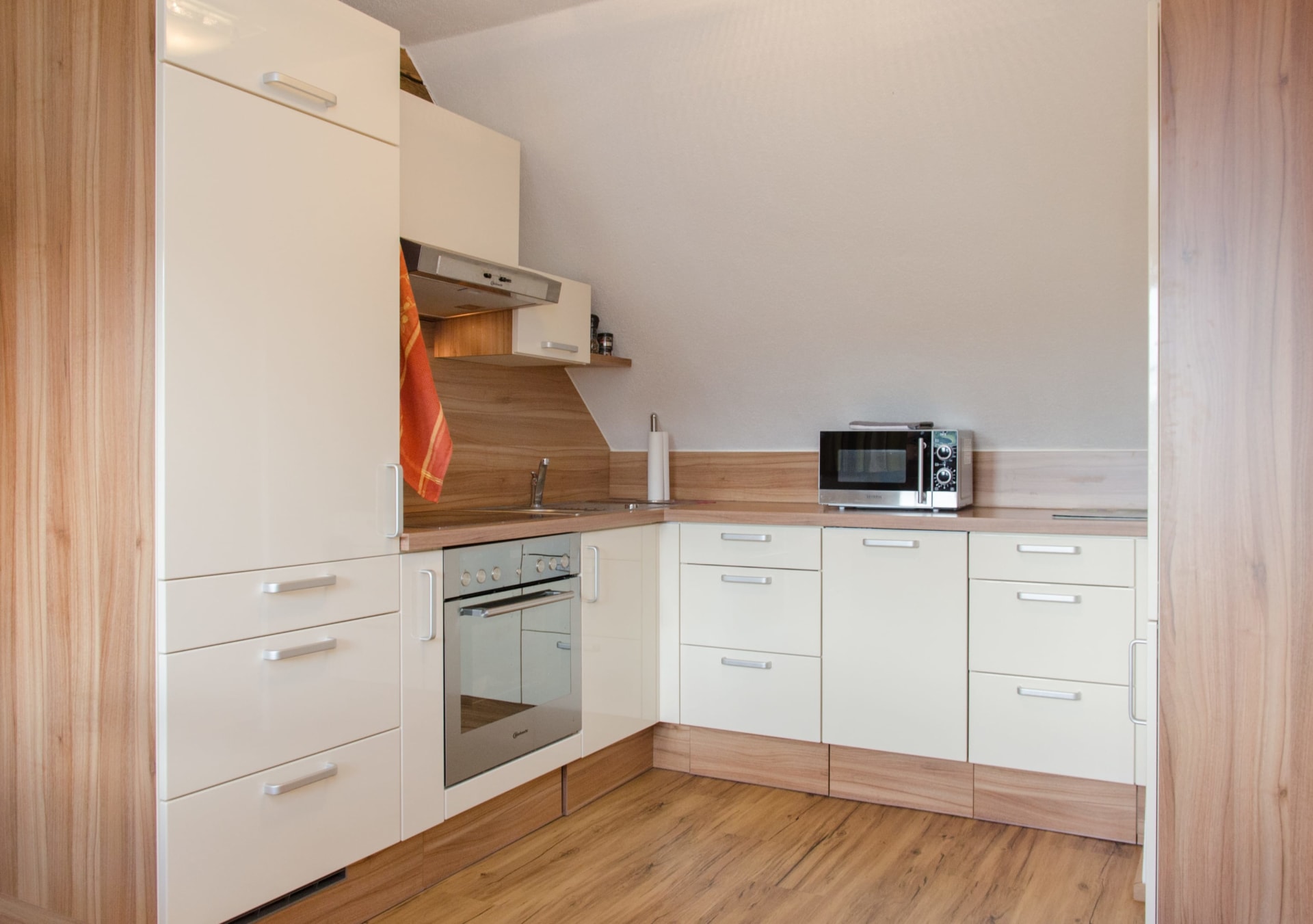 Die Ferienwohnung verfügt über ein Schlafzimmer mit Doppelbett, eine komplett ausgestattete Küche, einen Wohn-Schlaf-Bereich mit großzügiger Ausziehcouch und Terrasse.