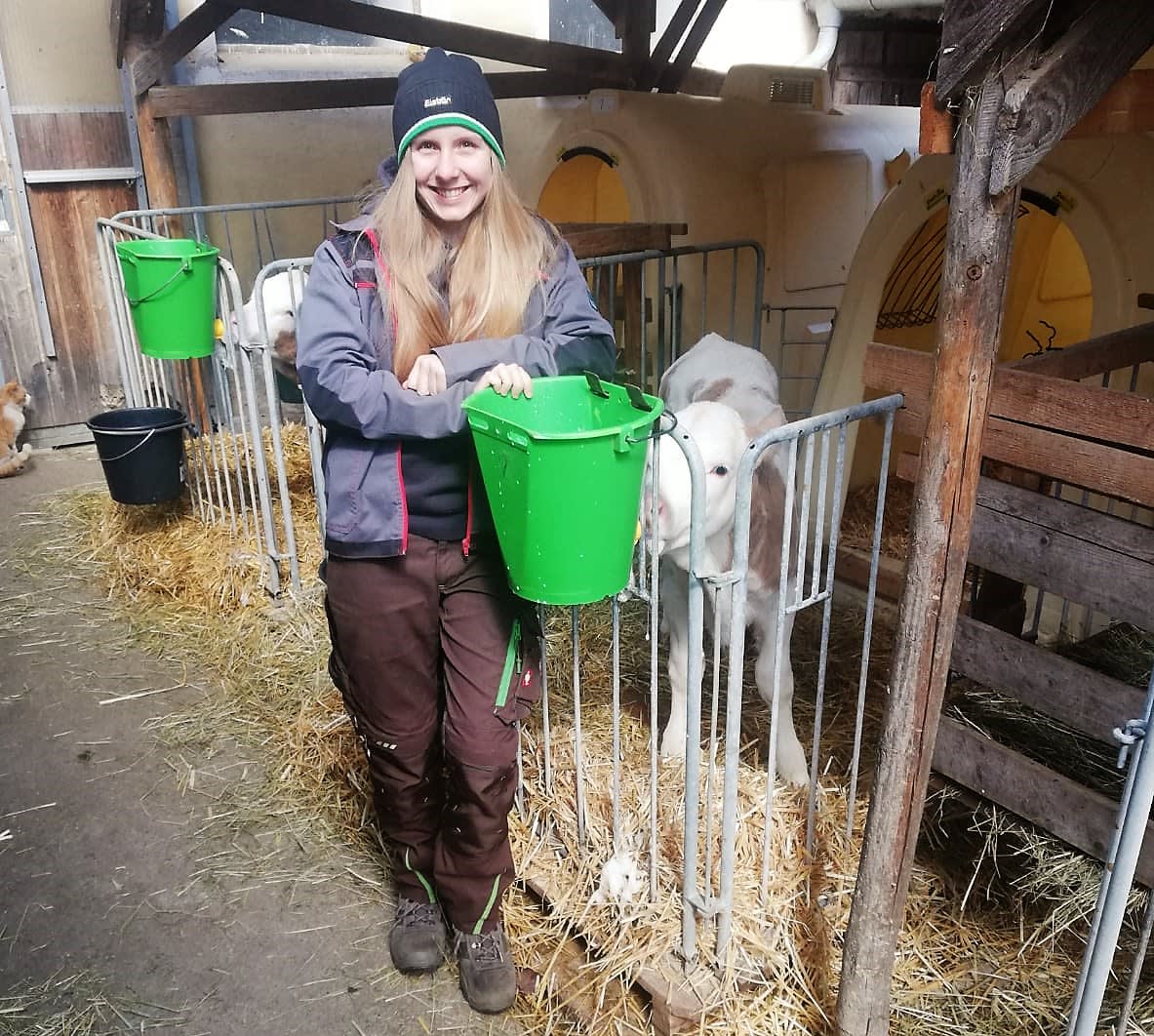 Unsere Milchkühe werden 2 mal am Tag gemolken. Sie fühlen sich im Laufstall sehr wohl und können sich frei bewegen. Die kleinen Kälber wohnen in Kälberiglus mit Vorgarten.