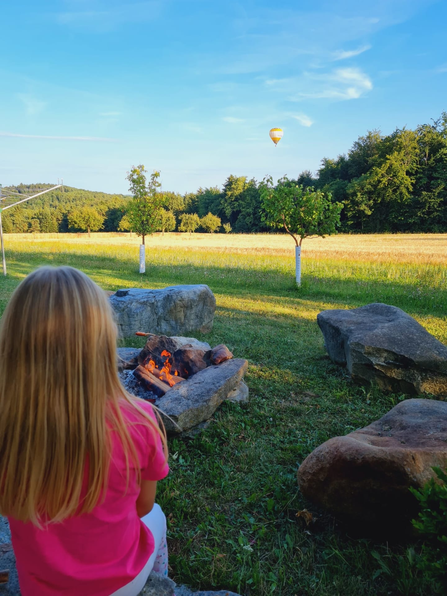 Der Lieblingsplatz der Familie ist unterm Hirschbirnbaum, wo wir oft das bunte Treiben der Heißluftballone beobachten.