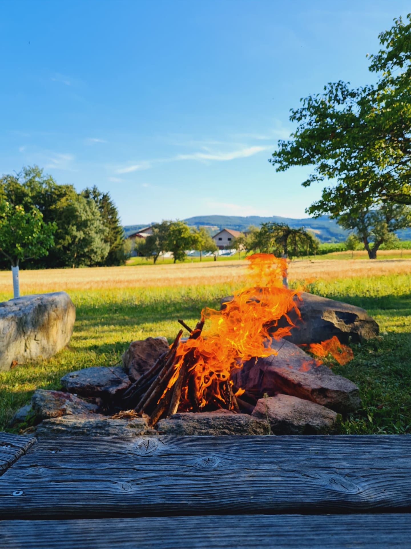 Der Lieblingsplatz der Familie ist unterm Hirschbirnbaum, wo wir oft das bunte Treiben der Heißluftballone beobachten.