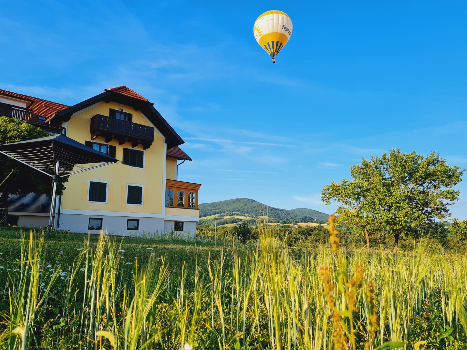 Der Lieblingsplatz der Familie ist unterm Hirschbirnbaum, wo wir oft das bunte Treiben der Heißluftballone beobachten.