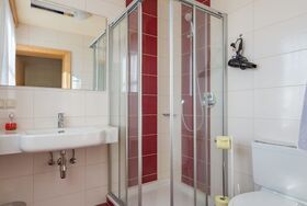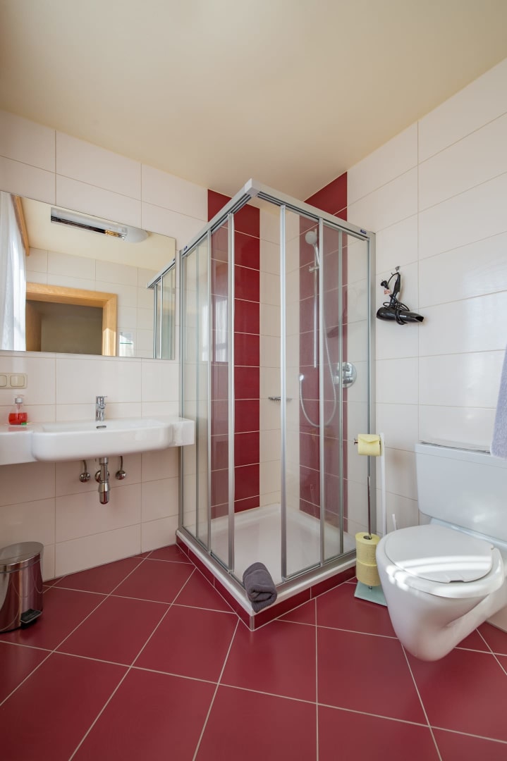 • Badezimmer mit Dusche, WC, Föhn, Kosmetikspiegel