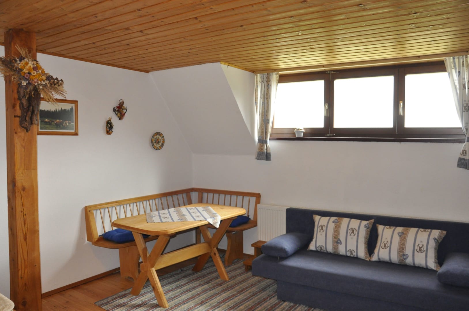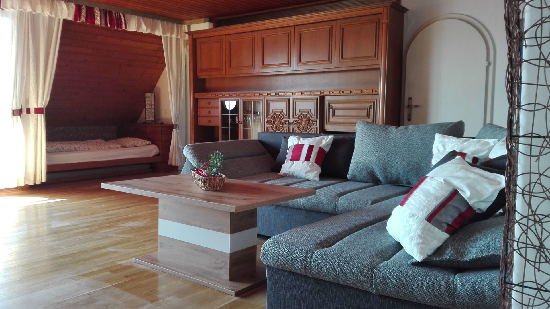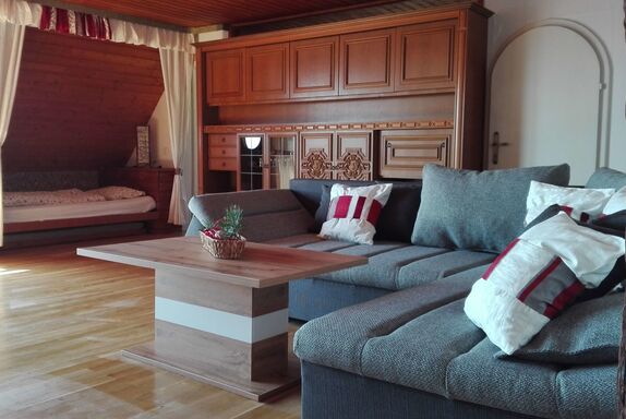 • Großes, helles Wohnzimmer mit Sitzganitur, Kachelofen, Flachbildfernseher und integriertes Einzelbett