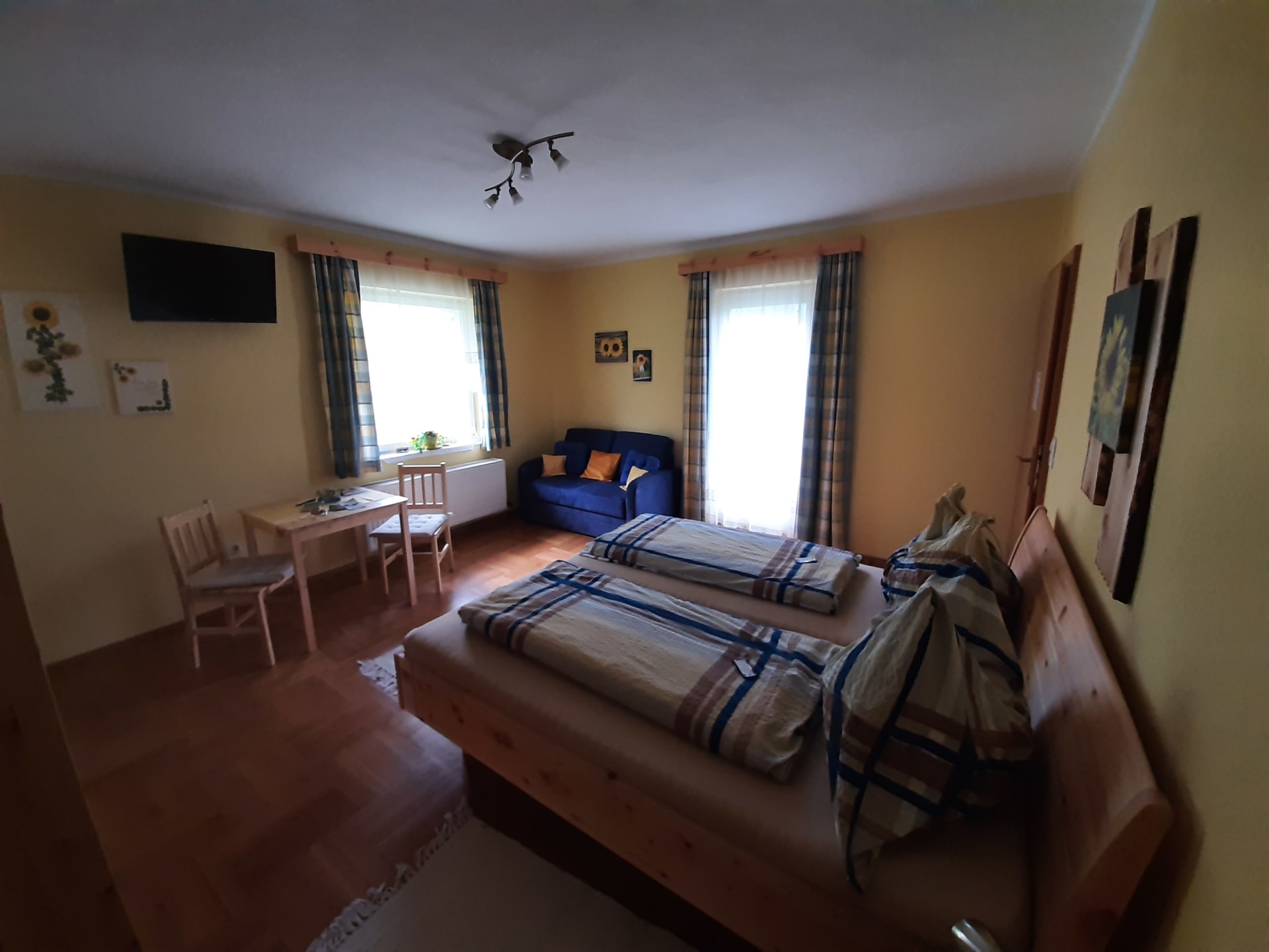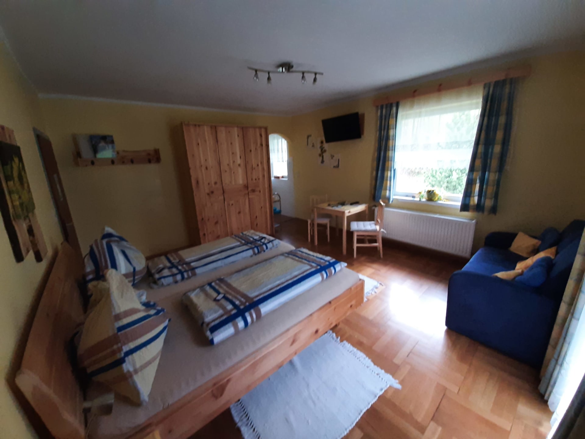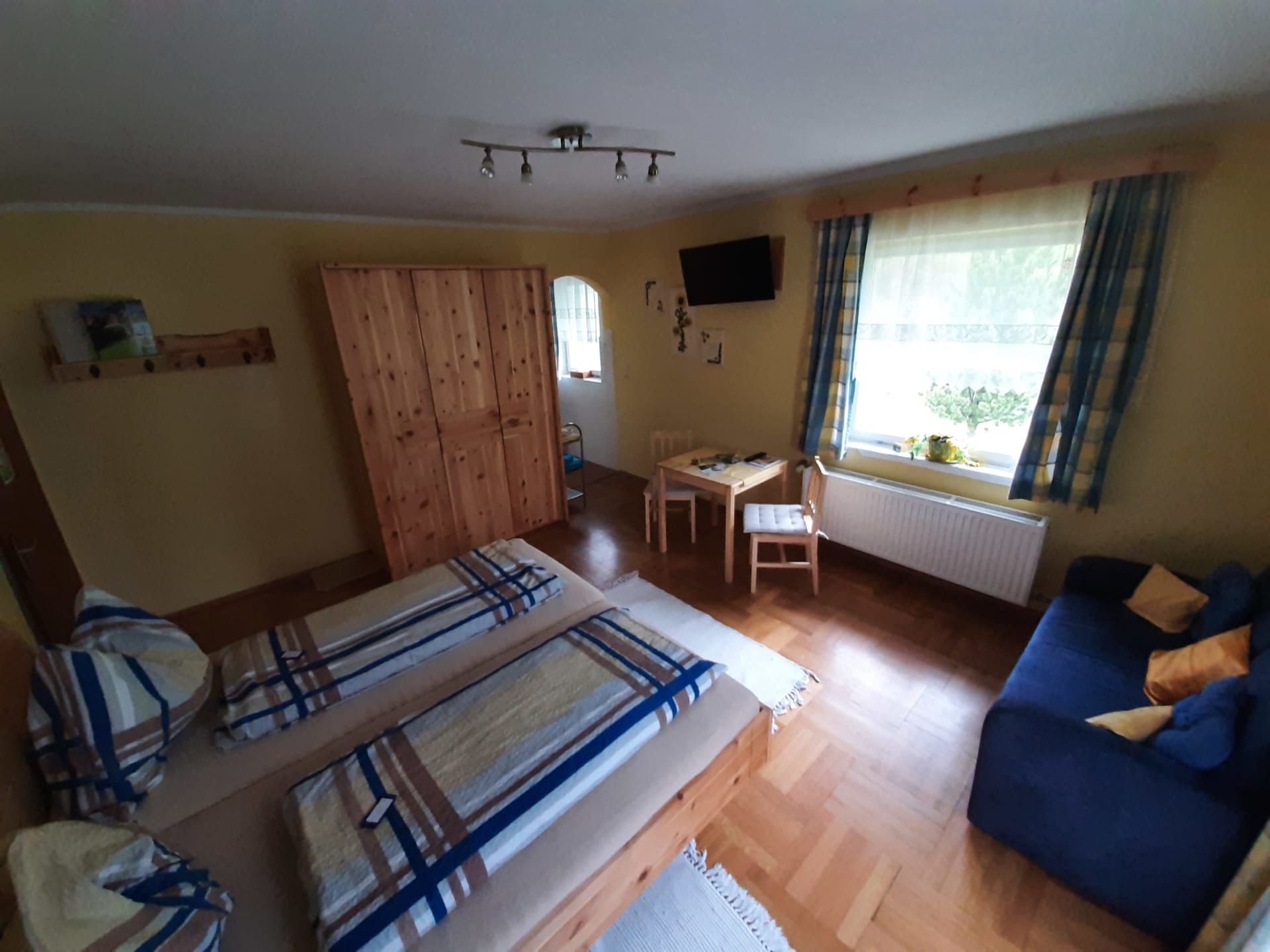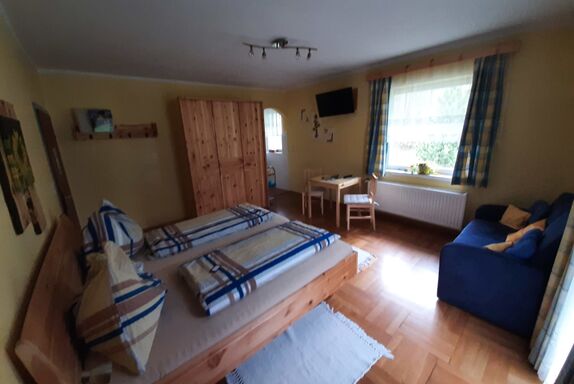 Freundlich ausgestattetes Zimmer mit Zirbenholzmöbel mit Balkon und herrlichem Blick auf St. Oswald und Umgebung. Dusche/WC getrennt, Sofa (ausziehbar), Kabel-TV, Radiowecker.