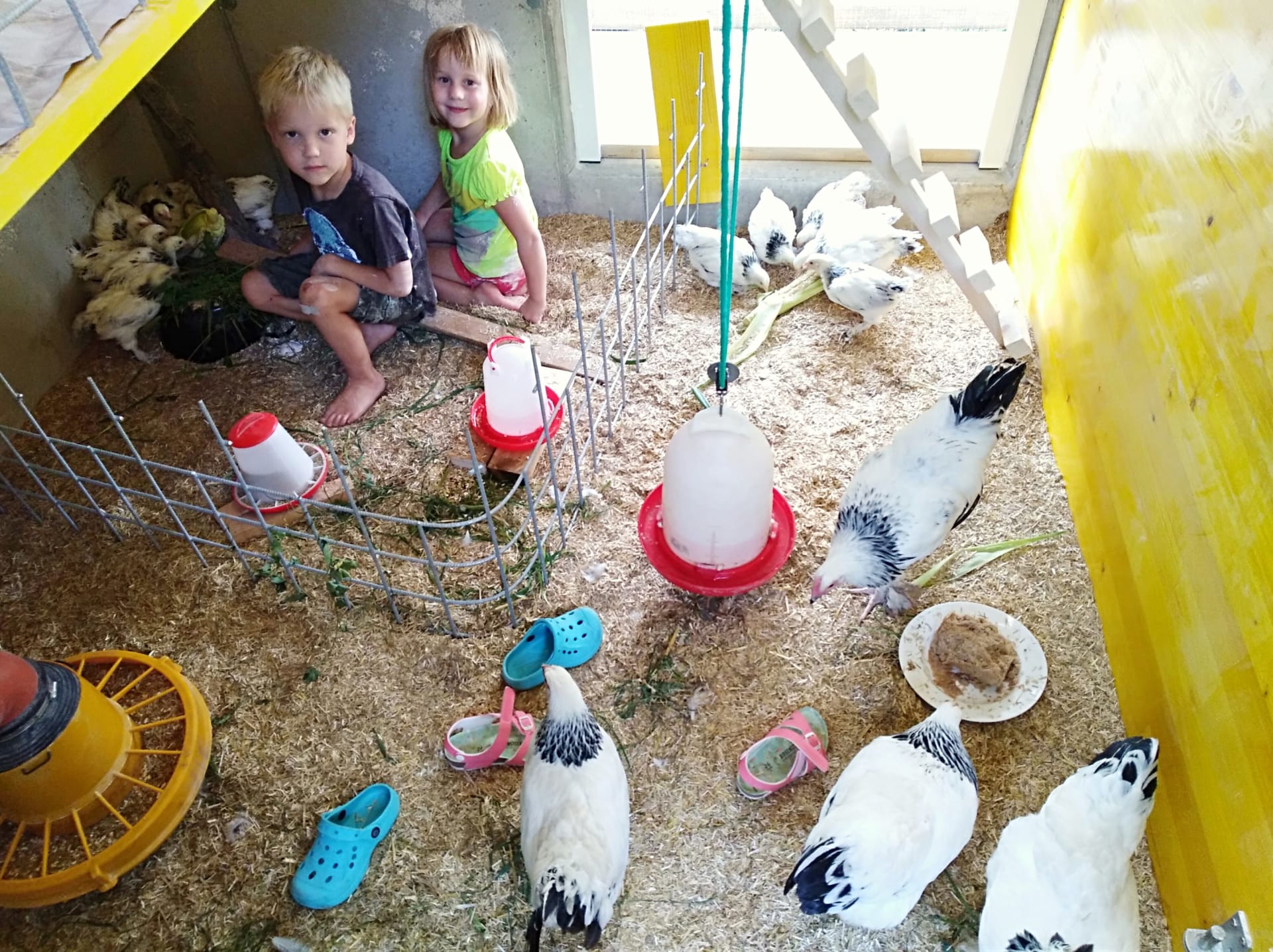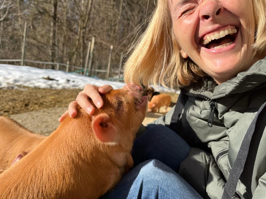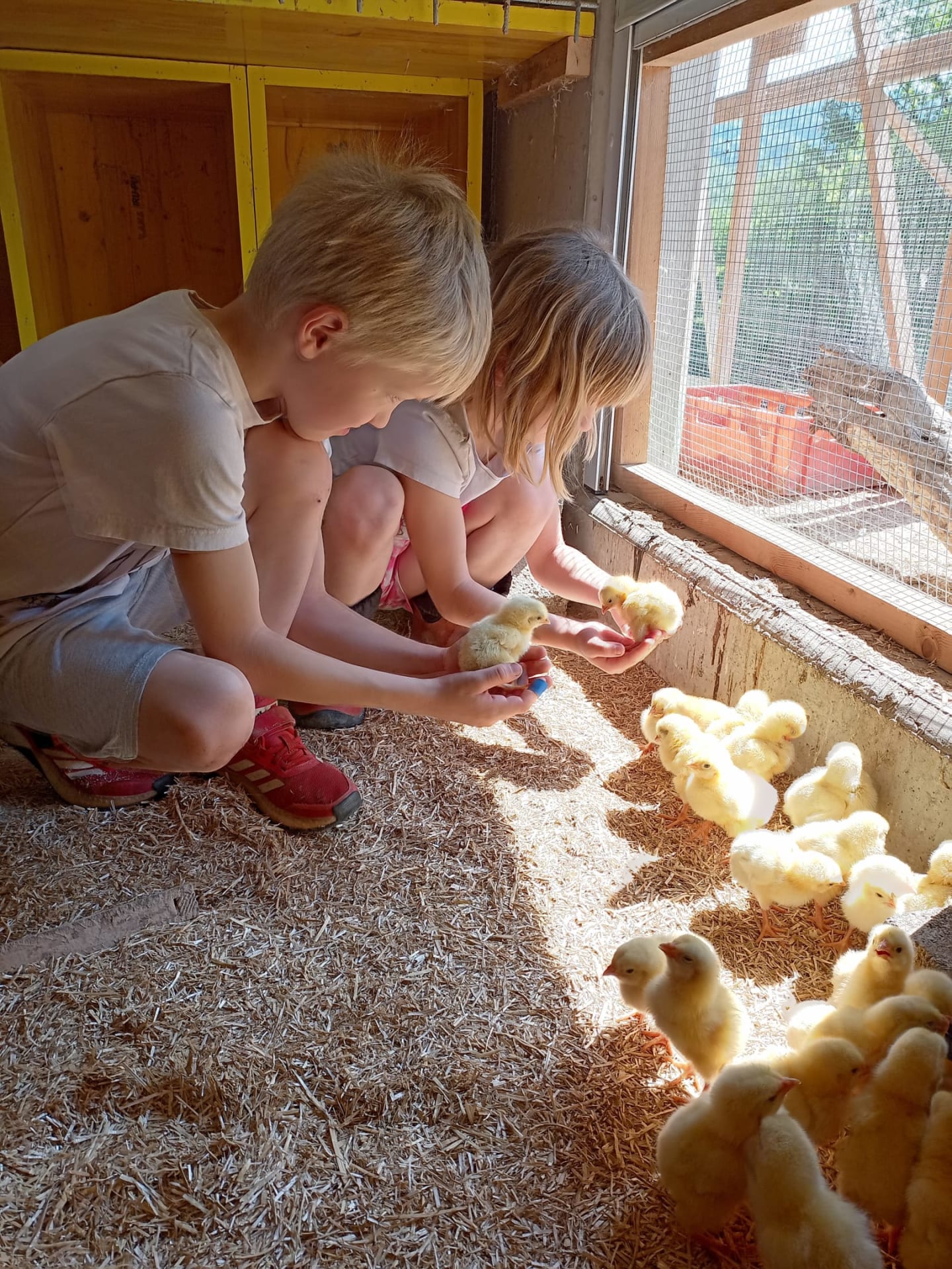 Es gibt viele verschiedene Tiere am Hof (Katzen, Hühner, Ziegen, Gänse, Truthähne, Kaninchen, Kune-Kune-Schweine und Ferkel) und eine tägliche Stallrunde.